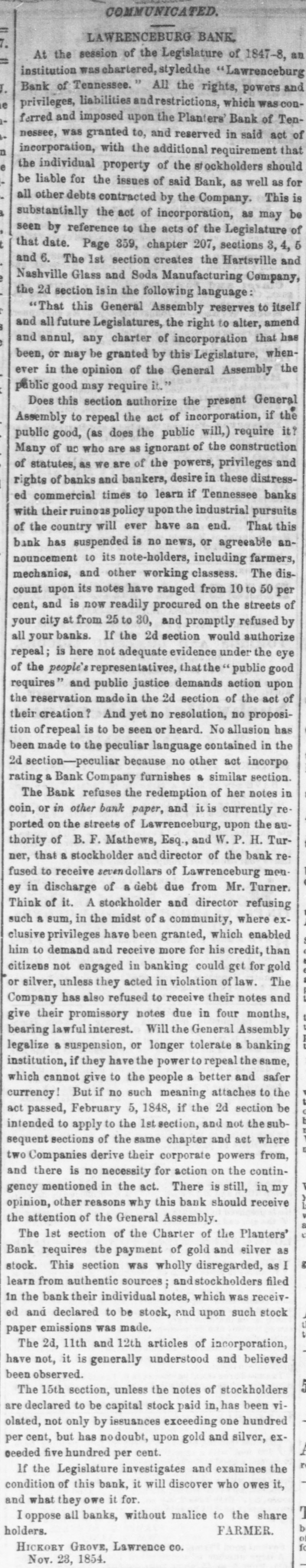 COMMUNICATED. LAWRENCEBURG BANK, At the session of the Legislature of 1847-8, an institution chartered, styledthe "Lawrenceburg Bank of Tennessee." All the rights, powers and privileges, liabilities restrictions, which wasconferred and imposed upon the Planters' Bank of Tennessee, was granted to, and reserved in said act of incorporation, with the additional requirement that the individual property of the stockholders should be liable for the issues of said Bank, as well as for all other debts contracted by the Company. This is substantially the act of incorporation, as may be seen by reference to the acts of the Legislature of that date. Page 359, chapter 207, sections 3, 4, 5 and 6. The 1st section creates the Hartsville and Nashville Glass and Soda Manufacturing Company, the 2d section isin the following language: "That this General Assembly reserves to itself and all future Legislatures, the right to alter, amend and annul, any charter of incorporation that has been, or may be granted by this Legislature, whenever in the opinion of the General Assembly the public good may require it." Does this section authorize the present General Assembly to repeal the act of incorporation, if the public good, (as does the public will,) require it? Many of us who are as ignorant of the construction of statutes, as we are of the powers, privileges and rights of banks and bankers, desire in these distressed commercial times to learn if Tennessee banks with their ruinous policy upon the industrial pursuits of the country will ever have an end. That this bank has suspended is no news, or agreeable announcement to its note-holders, including farmers, mechanics, and other working classess. The discount upon its notes have ranged from 10 to 50 per cent, and is now readily procured on the streets of your city at from 25 to 30, and promptly refused by all your banks. If the 2d section would authorize repeal; is here not adequate evidence under the eye of the people's representatives, thatthe" public good requires" and public justice demands action upon the reservation made in the 2d section of the act of their creation? And yet no resolution, no proposition of repeal is to be seen or heard. No allusion has been made to the peculiar language contained in the 2d section-peculiar because no other act incorpo rating & Bank Company furnishes & similar section. The Bank refuses the redemption of her notes in coin, or in other bank paper, and it is currently reported on the streets of Lawrenceburg, upon the authority of B. F. Mathews, Esq., and W. P. H. Turner, that a stockholder and director of the bank refused to receive sevendollars of Lawrenceburg men. ey in discharge of a debt due from Mr. Turner. Think of it. A stockholder and director refusing such a sum, in the midst of & community, where exclusive privileges have been granted, which enabled him to demand and receive more for his credit, than citizens not engaged in banking could get for gold or silver, unless they acted in violation of law. The Company has also refused to receive their notes and give their promissory notes due in four months, bearing lawful interest. Will the General Assembly legalize & suspension, or longer tolerate & banking institution, if they have the power to repeal the same, which cannot give to the people a better and safer currency! But if no such meaning attaches to the act passed, February 5, 1848, if the 2d section be intended to apply to the 1st section, and not the subsequent sections of the same chapter and act where two Companies derive their corporate powers from, and there is no necessity for action on the contingency mentioned in the act. There is still, in my opinion, other reasons why this bank should receive the attention of the General Assembly. The 1st section of the Charter of the Planters' Bank requires the payment of gold and silver as g stock. This section was wholly disregarded, as I learn from authentic sources; andstockholders filed in the bank their individual notes, which was received and declared to be stock, and upon such stock paper emissions was made. The 2d, 11th and 12th articles of incorporation, have not, it is generally understood and believed been observed. The 15th section, unless the notes of stockholders are declared to be capital stock paid in, has been violated, not only by issuances exceeding one hundred per cent, but has nodoubt, upon gold and silver, exceeded five hundred per cent. If the Legislature investigates and examines the condition of this bank, it will discover who owes it, and what they owe it for. I I oppose all banks, without malice to the share b FARMER. holders. fo HICKORY GROVE, Lawrence CO. Nov. 23, 1854.
