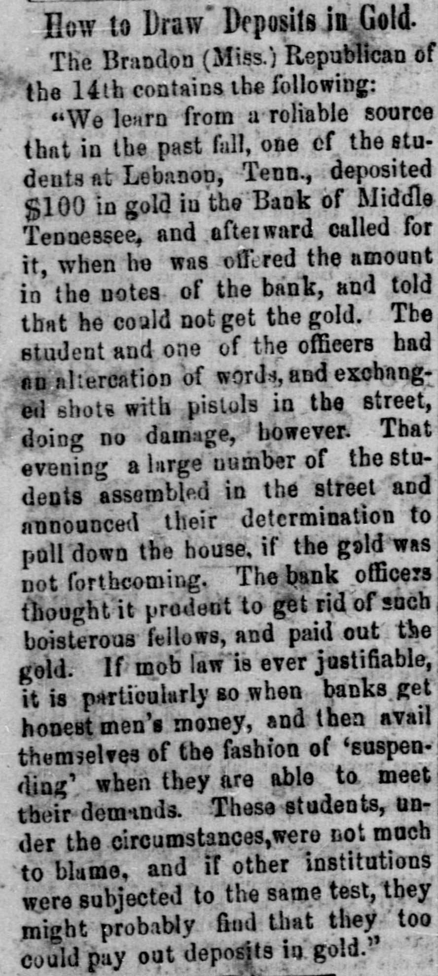 SINCE our last issue, the Union and the Planters', and all the Free Banks in Nashville,-namely, the Merchants, City, Traders, Bank of Commerce, Bank of the Union, and the Bank of Middle Tennessee, at Lebanon, have suspended specie payment. The notes of all of them though are still current as before, and are all good. They suspended specie payment as a matter of policy, as the three old Banks did, and not from any inability to sustain themselves. We have not heard what course the Free Banks in Memphis, will pursue when advised of the action of those at Nashville; but we think it probable that they and all other Banks in the State, will also suspend from like motives of prudence and policy. The Bank of America and the Northern Bank, both located here, are still paying specie, and we do not know whether they will suspend or not. If they do, it will be only because all the other Banks have done so, and in consideration of the policy that moved them to do it. They have certainly proved that they are entitled to the highest confidence.