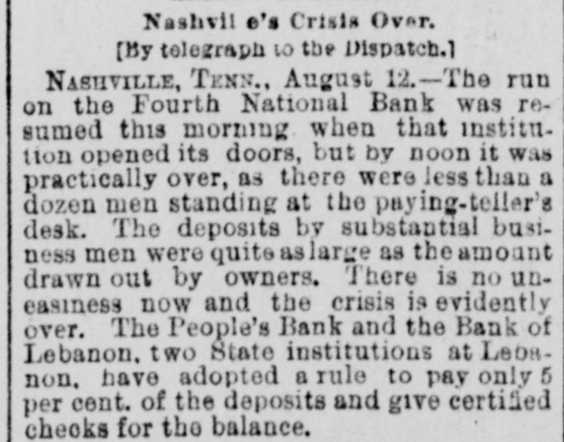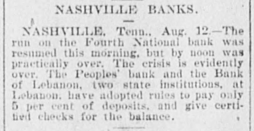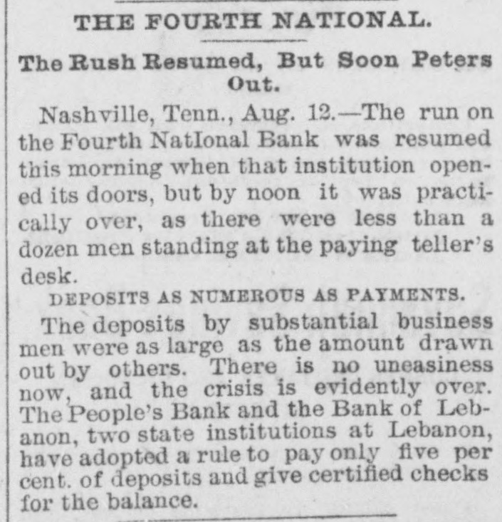THE FOURTH NATIONAL. The Rush Resumed, But Soon Peters Out. Nashville, Tenn., Aug. 12.-The run on the Fourth NatIonal Bank was resumed this morning when that institution opened its doors, but by noon it was practically over, as there were less than a dozen men standing at the paying teller's desk. DEPOSITS AS NUMEROUS AS PAYMENTS. The deposits by substantial business men were as large as the amount drawn out by others. There is no uneasiness now, and the crisis is evidently over. The People's Bank and the Bank of Lebanon, two state institutions at Lebanon, have adopted a rule to pay only five per cent. of deposits and give certified checks for the balance.
