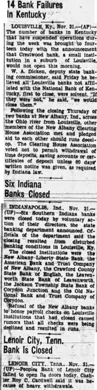 14 Bank Failures In Kentucky LOUISVILLE, Ky., Nov in that during the brought to fourteen the that small in suburb of open W. A. Dicken, deputy state bank ing Friday he lieved all Louisville banks not affilinted with the National Bank of Kenfirst close, were solvent they were not," said, "we would them. Following the closing Thursday of banks Ind., across the Ohio from other the Albany Clearing House met and pledged aid each should runs develThe Clearing Association voted not permit withdrawal of time accounts certiffeates of deposit unless 60 days Indiana was given, required by law. Six Indiana Banks Closed Ind. tion were closed today by voluntary actheir the banking Officials of the department said closing resulted disturbed in Louisville, The closed institutions the New State Bank. and Trust Company New Albany, the County State Bank the English, LeavenBank the Jackson Township State Bank Corydon Junction and the Old Na. tional and Trust Company of Refusal honor of the New Albany banks on that had rumors that checks were being declined and resulted in runs. Lenoir City, Tenn. Bank Is Closed LENOIR Tenn. Nov. Bank Lenoir City its doors today. Cashier Roy was beof heavy withdrawals.