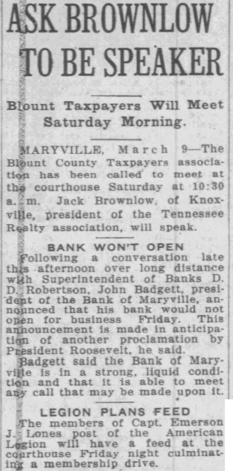 ASK BROWNLOW TO BE SPEAKER Blount Taxpayers Will Meet Saturday Morning Blount County Taxpayers association been called meet the courthouse Saturday at 10:30 Jack Brownlow, of Knoxville, president of the Tennessee Realty association, will speak. BANK WON'T OPEN Following conversation late this afternoon over long distance of Banks D. John Badgett, president of the Bank of Maryville, announced that his bank would not open for business Friday This is made in tign of another by he said Badgett said the Bank of Maryis in strong, liquid condition and that able to meet any call that may be made upon it. LEGION PLANS FEED members of Capt. Emerson Lones post of the American Legion will have feed at the Friday night culminata membership drive.