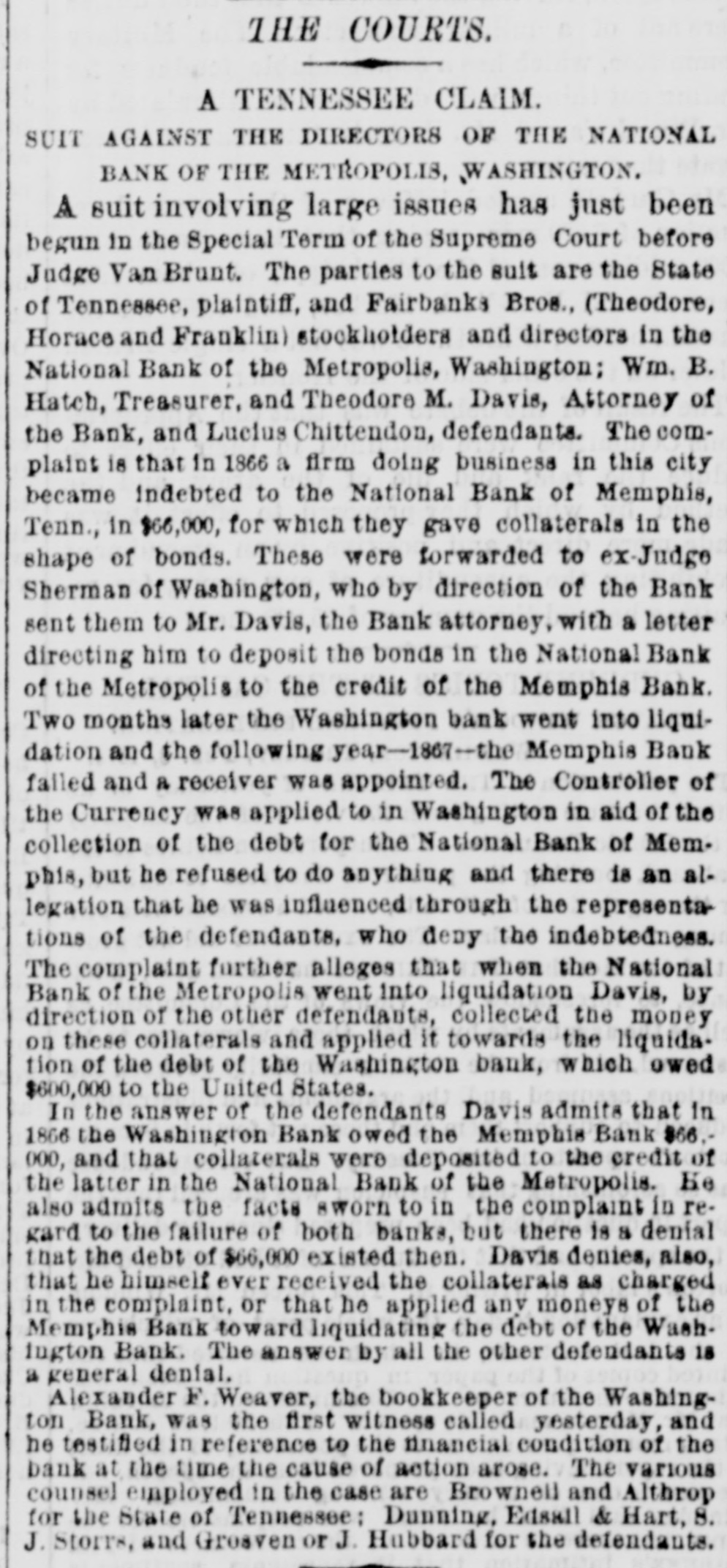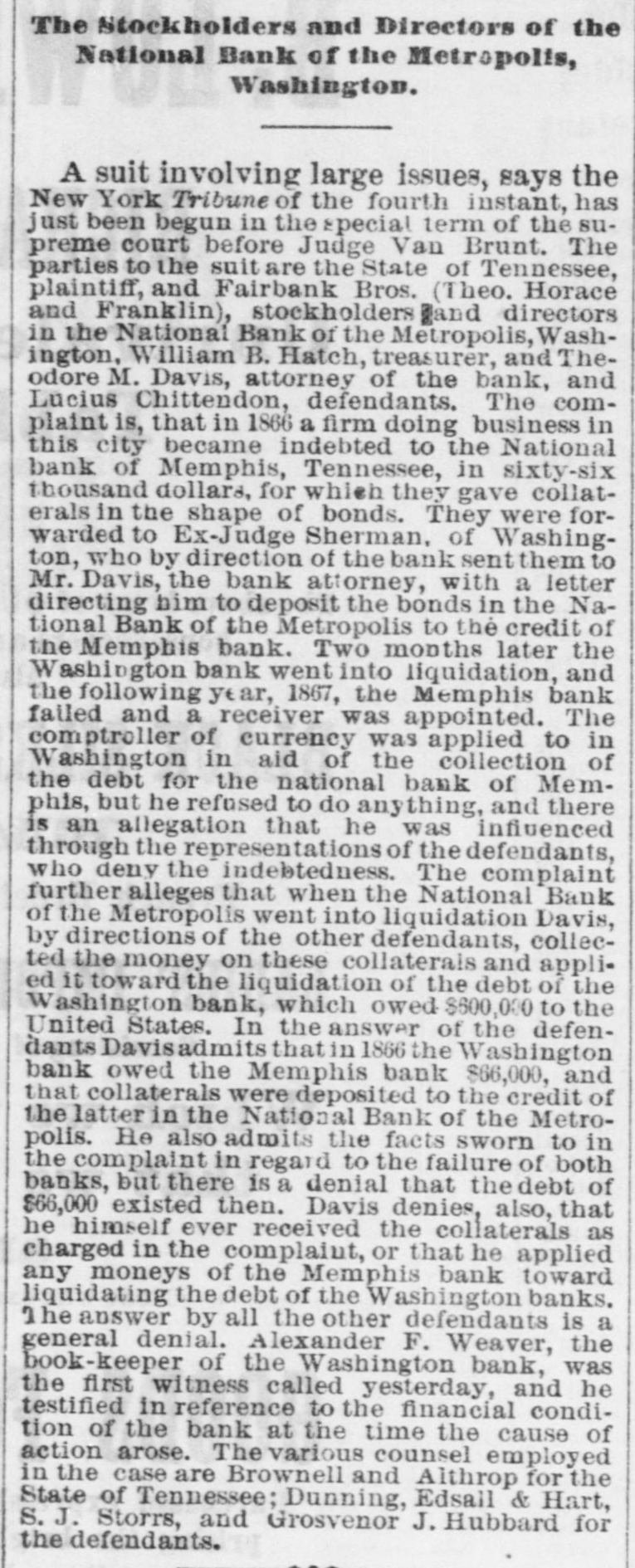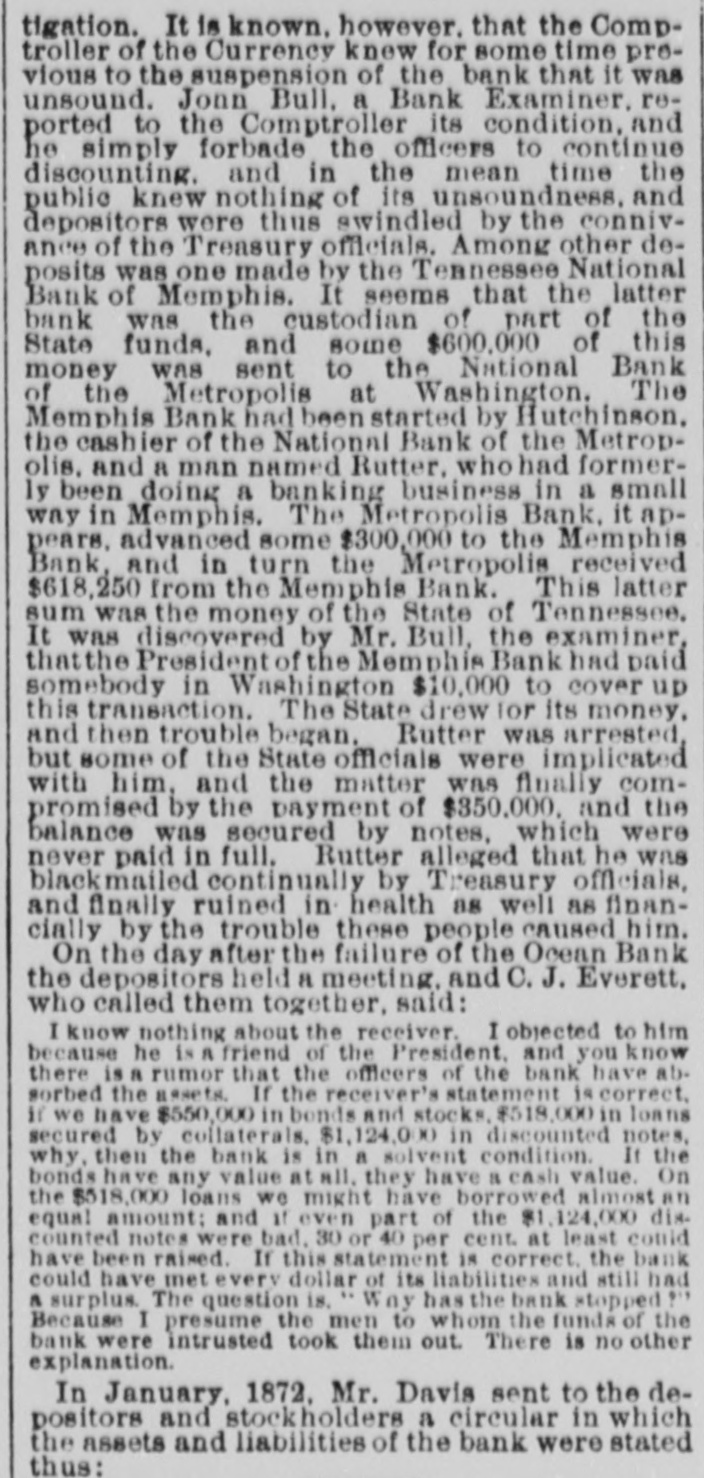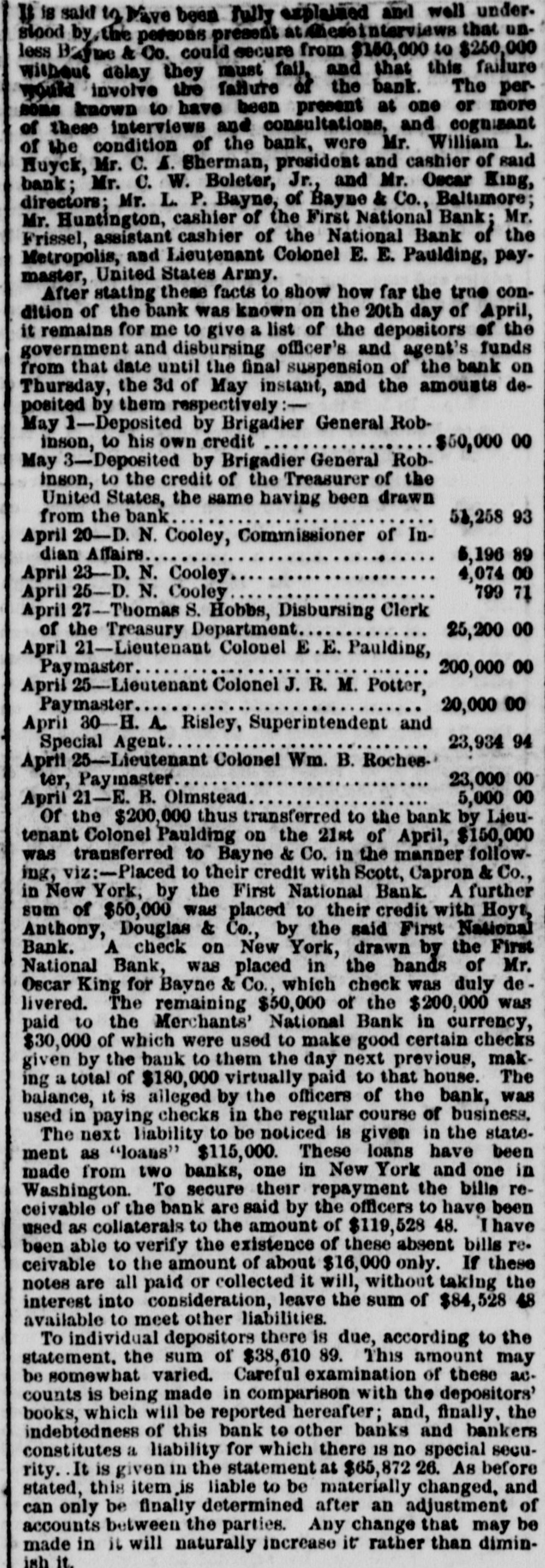 It is said to have been fully explained and well under- stood by the persons present at these interviews that un- less Bayne & Co. could secure from $150,000 to $250,000 without delay they must fail, and that this failure would involve the failure of the bank. The per- sons known to have been present at one or more of these interviews and consultations, and cognizant of the condition of the bank, were Mr. William L. Huyck, Mr. C. A. Sherman, president and cashier of said bank; Mr. C. W. Boleter, Jr., and Mr. Oscar King, directors; Mr. L. P. Bayne, of Bayne & Co., Baltimore; Mr. Huntington, cashier of the First National Bank; Mr. Frissel, assistant cashier of the National Bank of the Metropolis, and Lieutenant Colonel E. E. Paulding, pay- master, United States Army. After stating these facts to show how far the true con- dition of the bank was known on the 20th day of April, it remains for me to give a list of the depositors of the government and disbursing officer's and agent's funds from that date until the final suspension of the bank on Thursday, the 3d of May instant, and the amounts de- posited by them respectively :- May 1-Deposited by Brigadier General Rob- inson, to his own credit . . . . . . . . . . . . . . . . . . . . . . . . . . . . . . . . . . . . . . . . . . . . . . . . . . . . . . . . . . . . . . . . . . . . . . . . . . . . . . . . . . . . . . . . . . . . . . . . . . . . . . . . . . . . . . . . . . . . . . . . . . . . . . . . . . . . . . . . . . . . . . . . . . . . . . . . . . . . . . . . . . . . . . . . . . . . . . . . . . . . . . . . . . . . . . . . . . . . . . . . . . . . . . . . . . . . . . . . . . . . . . . . . . . . . . . . . . . . . . . . . . . . . . . . . . . . . . . . . . . . . . . . . . . . . . . . . . . . . . . . . . . . . . . . . . . . . . . . . . . . . . . . . . . . . . . . . . . . . . . . . . . . . . . . . . . . . . . . . . . . . . . . . . . . . . . . . . . . . . . . . . . . . . . . . . . . . . . . . . . . . . . . . . . . . . . . . . . . . . . . . . . . . . . . . . . . . . . . . . . . . . . . . . . . . . . . . . . . . . . . . . . . . . . . . . . . . . . . . . . . . . . . . . . . . . . . . . . . . . . . . . . . . . . . . . . . . . . . . . . . . . . . . . . . . . . . . . . . . . . . . . . . . . . . . . . . . . . . . . . . . . . . . . . . . . . . . . . . . . . . . . . . . . . . . . . . . . . . . . . . . . . . . . . . . . . . . . . . . . . . . . . . . . . . . . . . . . . . . . . . . . . . . . . . . . . . . . . . . . . . . . . . . . . . . . . . . . . . . . . . . . . . . . . . . . . . . . . . . . . . . . . . . . . . . . . . . . . . . . . . . . . . . . . . . . . . . . . . . . . . . . . . . . . . . . . . . . . . . . . . . . . . . . . . . . . . . . . . . . . . . . . . . . . . . . . . . . . . . . . . . . . . . . . . . . . . . . . . . . . . . . . . . . . . . . . . . . . . . . . . . . . . . . . . . . . . . . . . . . . . . . . . . . . . . . . . . . . . . . . . . . . . . . . . . . . . . . . . . . . . . . . . . . . . . . . . . . . . . . . . . . . . . . . . . . . . . . . . . . . . . . . . . . . . . . . . . . . . . . . . . . . . . . . . . . . . . . . . . . . . . . . . . . . . . . . . . . . . . . . . . . . . . . . . . . . . . . . . . . . . . . . . . . . . . . . . . . . . . . . . . . . . . . . . . . . . . . . . . . . . . . . . . . . . . . . . . . . . . . . . . . . . . . . . . . . . . . . . . . . . . . . . . . . . . . . . . . . . . . . . . . . . . . . . . . . . . . . . . . . . . . . . . . . . . . . . . . . . . . . . . . . . . . . . . . . . . . . . . . . . . . . . . . . . . . . . . . . . . . . . . . . . . . . . . . . . . . . . . . . . . . . . . . . . . . . . . . . . . . . . . . . . . . . . . . . . . . . . . . . . . . . . . . . . . . . . . . . . . . . . . . . . . . . . . . . . . . . . . . . . . . . . . . . . . . . . . . . . . . . . . . . . . . . . . . . . . . . . . . . . . . . . . . . . . . . . . . . . . . . . . . . . . . . . . . . . . . . . . . . . . . . . . . . . . . . . . . . . . . . . . . . . . . . . . . . . . . . . . . . . . . . . . . . . . . . . . . . . . . . . . . . . . . . . . . . . . . . . . . . . . . . . . . . . . . . . . . . . . . . . . . . . . . . . . . . . . . . . . . . . . . . . . . . . . . . . . . . . . . . . . . . . . . . . . . . . . . . . . . . . . . . . . . . . . . . . . . . . . . . . . . . . . . . . . . . . . . . . . . . . . . . . . . . . . . . . . . . . . . . . . . . . . . . . . . . . . . . . . . . . . . . . . . . . . . . . . . . . . . . . . . . . . . . . . . . . . . . . . . . . . . . . . . . . . . . . . . . . . . . . . . . . . . . . . . . . . . . . . . . . . . . . . . . . . . . . . . . . . . . . . . . . . . . . . . . . . . . . . . . . . . . . . . . . . . . . . . . . . . . . . . . . . . . . . . . . . . . . . . . . . . . . . . . . . . . . . . . . . . . . . . . . . . . . . . . . . . . . . . . . . . . . . . . . . . . . . . . . . . . . . . . . . . . . . . . . . . . . . . . . . . . . . . . . . . . . . . . . . . . . . . . . . . . . . . . . . . . . . . . . . . . . . . . . . . . . . . . . . . . . . . . . . . . . . . . . . . . . . . . . . . . . . . . . . . . . . . . . . . . . . . . . . . . . . . . . . . . . . . . . . . . . . . . . . . . . . . . . . . . . . . . . . . . . . . . . . . . . . . . . . . . . . . . . . . . . . . . . . . . . . . . . . . . . . . . . . . . . . . . . . . . . . . . . . . . . . . . . . . . . . . . . . . . . . . . . . . . . . . . . . . . . . . . . . . . . . . . . . . . . . . . . . . . . . . . . . . . . . . . . . . . . . . . . . . . . . . . . . . . . . . . . . . . . . . . . . . . . . . . . . . . . . . . . . . . . . . . . . . . . . . . . . . . . . . . . . . . . . . . . . . . . . . . . . . . . . . . . . . . . . . . . . . . . . . . . . . . . . . . . . . . . . . . . . . . . . . . . . . . . . . . . . . . . . . . . . . . . . . . . . . . . . . . . . . . . . . . . . . . . . . . . . . . . . . . . . . . . . . . . . . . . . . . . . . . . . . . . . . . . . . . . . . . . . . . . . . . . . . . . . . . . . . . . . . . . . . . . . . . . . . . . . . . . . . . . . . . . 