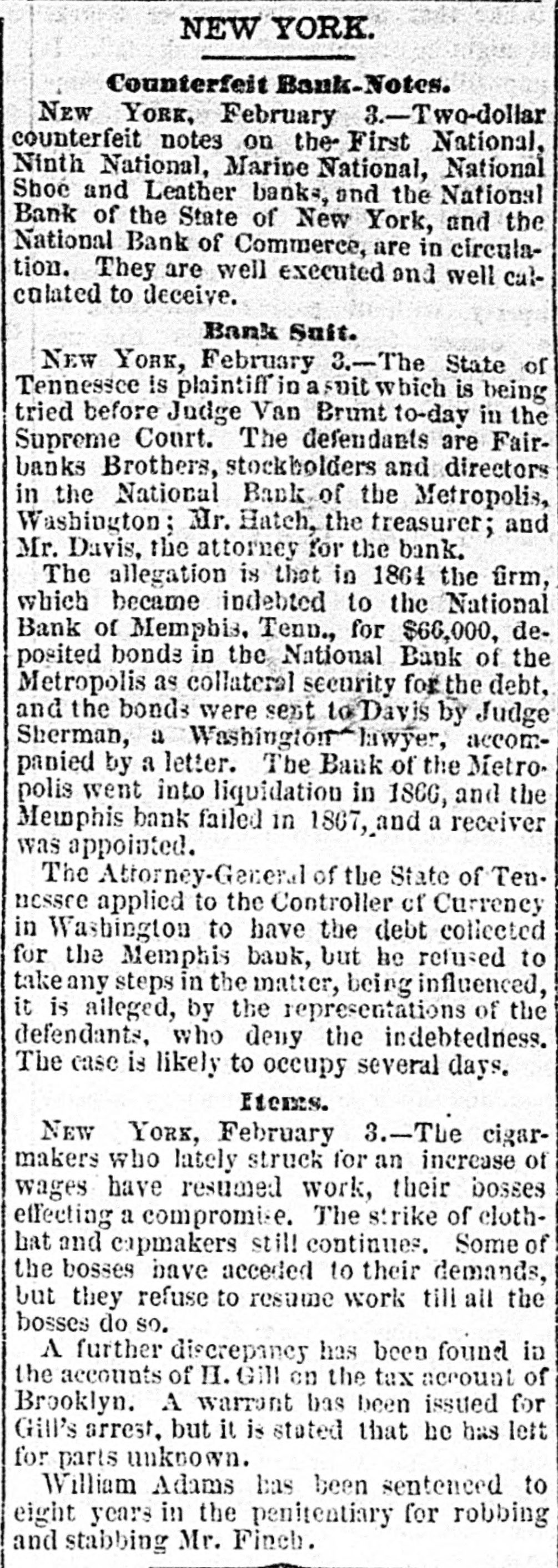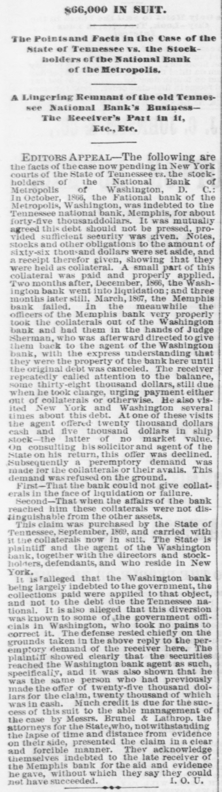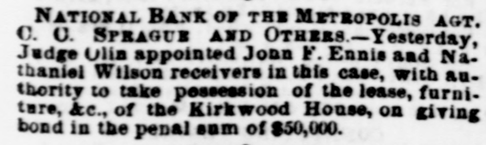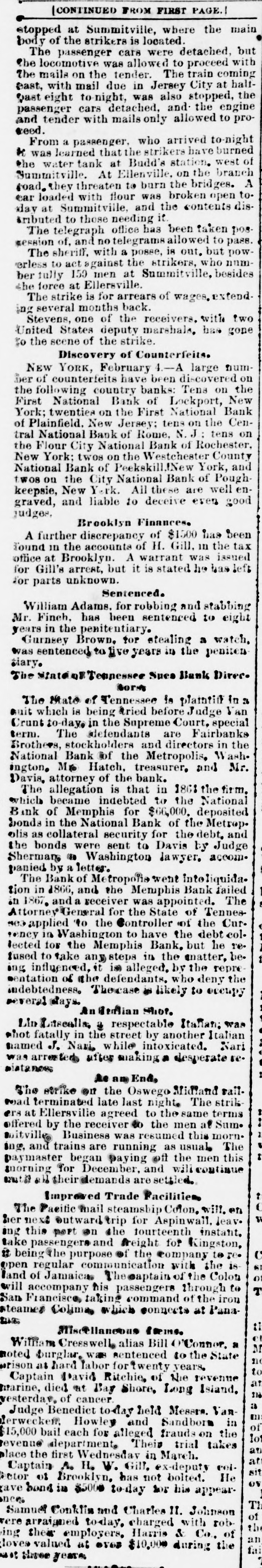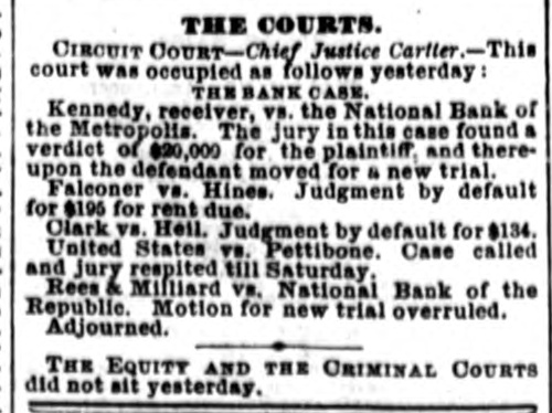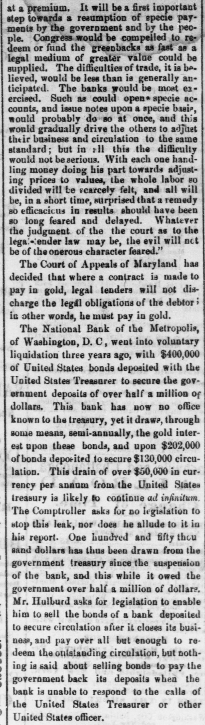 It is said to have been fully explained and well under- stood by the persons present at these interviews that un- less Bayne & Co. could secure from $150,000 to $250,000 without delay they must fail, and that this failure would involve the failure of the bank. The per- sons known to have been present at one or more of these interviews and consultations, and cognizant of the condition of the bank, were Mr. William L. Huyck, Mr. C. A. Sherman, president and cashier of said bank; Mr. C. W. Boleter, Jr., and Mr. Oscar King, directors; Mr. L. P. Bayne, of Bayne & Co., Baltimore; Mr. Huntington, cashier of the First National Bank; Mr. Frissel, assistant cashier of the National Bank of the Metropolis, and Lieutenant Colonel E. E. Paulding, pay- master, United States Army. After stating these facts to show how far the true con- dition of the bank was known on the 20th day of April, it remains for me to give a list of the depositors of the government and disbursing officer's and agent's funds from that date until the final suspension of the bank on Thursday, the 3d of May instant, and the amounts de- posited by them respectively :- May 1-Deposited by Brigadier General Rob- inson, to his own credit . . . . . . . . . . . . . . . . . . . . . . . . . . . . . . . . . . . . . . . . . . . . . . . . . . . . . . . . . . . . . . . . . . . . . . . . . . . . . . . . . . . . . . . . . . . . . . . . . . . . . . . . . . . . . . . . . . . . . . . . . . . . . . . . . . . . . . . . . . . . . . . . . . . . . . . . . . . . . . . . . . . . . . . . . . . . . . . . . . . . . . . . . . . . . . . . . . . . . . . . . . . . . . . . . . . . . . . . . . . . . . . . . . . . . . . . . . . . . . . . . . . . . . . . . . . . . . . . . . . . . . . . . . . . . . . . . . . . . . . . . . . . . . . . . . . . . . . . . . . . . . . . . . . . . . . . . . . . . . . . . . . . . . . . . . . . . . . . . . . . . . . . . . . . . . . . . . . . . . . . . . . . . . . . . . . . . . . . . . . . . . . . . . . . . . . . . . . . . . . . . . . . . . . . . . . . . . . . . . . . . . . . . . . . . . . . . . . . . . . . . . . . . . . . . . . . . . . . . . . . . . . . . . . . . . . . . . . . . . . . . . . . . . . . . . . . . . . . . . . . . . . . . . . . . . . . . . . . . . . . . . . . . . . . . . . . . . . . . . . . . . . . . . . . . . . . . . . . . . . . . . . . . . . . . . . . . . . . . . . . . . . . . . . . . . . . . . . . . . . . . . . . . . . . . . . . . . . . . . . . . . . . . . . . . . . . . . . . . . . . . . . . . . . . . . . . . . . . . . . . . . . . . . . . . . . . . . . . . . . . . . . . . . . . . . . . . . . . . . . . . . . . . . . . . . . . . . . . . . . . . . . . . . . . . . . . . . . . . . . . . . . . . . . . . . . . . . . . . . . . . . . . . . . . . . . . . . . . . . . . . . . . . . . . . . . . . . . . . . . . . . . . . . . . . . . . . . . . . . . . . . . . . . . . . . . . . . . . . . . . . . . . . . . . . . . . . . . . . . . . . . . . . . . . . . . . . . . . . . . . . . . . . . . . . . . . . . . . . . . . . . . . . . . . . . . . . . . . . . . . . . . . . . . . . . . . . . . . . . . . . . . . . . . . . . . . . . . . . . . . . . . . . . . . . . . . . . . . . . . . . . . . . . . . . . . . . . . . . . . . . . . . . . . . . . . . . . . . . . . . . . . . . . . . . . . . . . . . . . . . . . . . . . . . . . . . . . . . . . . . . . . . . . . . . . . . . . . . . . . . . . . . . . . . . . . . . . . . . . . . . . . . . . . . . . . . . . . . . . . . . . . . . . . . . . . . . . . . . . . . . . . . . . . . . . . . . . . . . . . . . . . . . . . . . . . . . . . . . . . . . . . . . . . . . . . . . . . . . . . . . . . . . . . . . . . . . . . . . . . . . . . . . . . . . . . . . . . . . . . . . . . . . . . . . . . . . . . . . . . . . . . . . . . . . . . . . . . . . . . . . . . . . . . . . . . . . . . . . . . . . . . . . . . . . . . . . . . . . . . . . . . . . . . . . . . . . . . . . . . . . . . . . . . . . . . . . . . . . . . . . . . . . . . . . . . . . . . . . . . . . . . . . . . . . . . . . . . . . . . . . . . . . . . . . . . . . . . . . . . . . . . . . . . . . . . . . . . . . . . . . . . . . . . . . . . . . . . . . . . . . . . . . . . . . . . . . . . . . . . . . . . . . . . . . . . . . . . . . . . . . . . . . . . . . . . . . . . . . . . . . . . . . . . . . . . . . . . . . . . . . . . . . . . . . . . . . . . . . . . . . . . . . . . . . . . . . . . . . . . . . . . . . . . . . . . . . . . . . . . . . . . . . . . . . . . . . . . . . . . . . . . . . . . . . . . . . . . . . . . . . . . . . . . . . . . . . . . . . . . . . . . . . . . . . . . . . . . . . . . . . . . . . . . . . . . . . . . . . . . . . . . . . . . . . . . . . . . . . . . . . . . . . . . . . . . . . . . . . . . . . . . . . . . . . . . . . . . . . . . . . . . . . . . . . . . . . . . . . . . . . . . . . . . . . . . . . . . . . . . . . . . . . . . . . . . . . . . . . . . . . . . . . . . . . . . . . . . . . . . . . . . . . . . . . . . . . . . . . . . . . . . . . . . . . . . . . . . . . . . . . . . . . . . . . . . . . . . . . . . . . . . . . . . . . . . . . . . . . . . . . . . . . . . . . . . . . . . . . . . . . . . . . . . . . . . . . . . . . . . . . . . . . . . . . . . . . . . . . . . . . . . . . . . . . . . . . . . . . . . . . . . . . . . . . . . . . . . . . . . . . . . . . . . . . . . . . . . . . . . . . . . . . . . . . . . . . . . . . . . . . . . . . . . . . . . . . . . . . . . . . . . . . . . . . . . . . . . . . . . . . . . . . . . . . . . . . . . . . . . . . . . . . . . . . . . . . . . . . . . . . . . . . . . . . . . . . . . . . . . . . . . . . . . . . . . . . . . . . . . . . . . . . . . . . . . . . . . . . . . . . . . . . . . . . . . . . . . . . . . . . . . . . . . . . . . . . . . . . . . . . . . . . . . . . . . . . . . . . . . . . . . . . . . . . . . . . . . . . . . . . . . . . . . . . . . . . . . . . . . . . . . . . . . . . . . . . . . . . . . . . . . . . . . . . . . . . . . . . . . . . . . . . . . . . . . . . . . . . . . . . . . . . . . . . . . . . . . . . . . . . . . . . . . . . . . . . . . . 