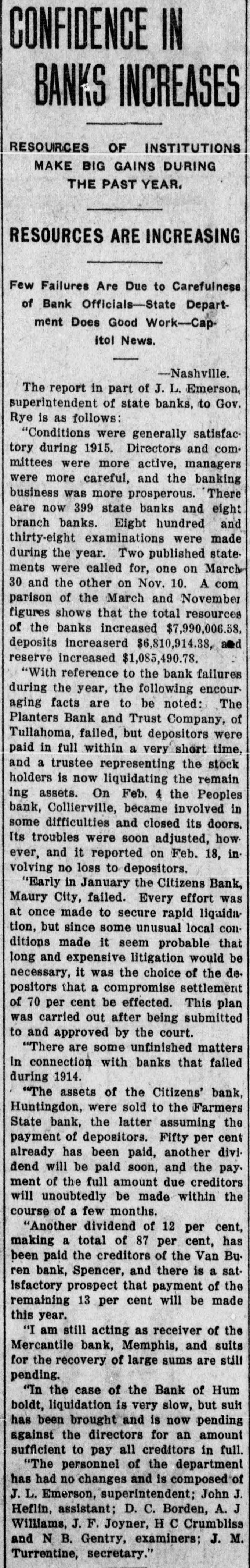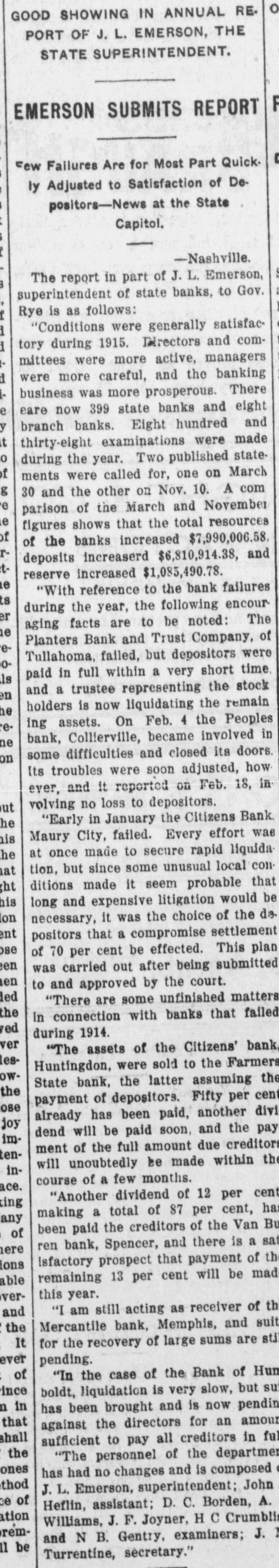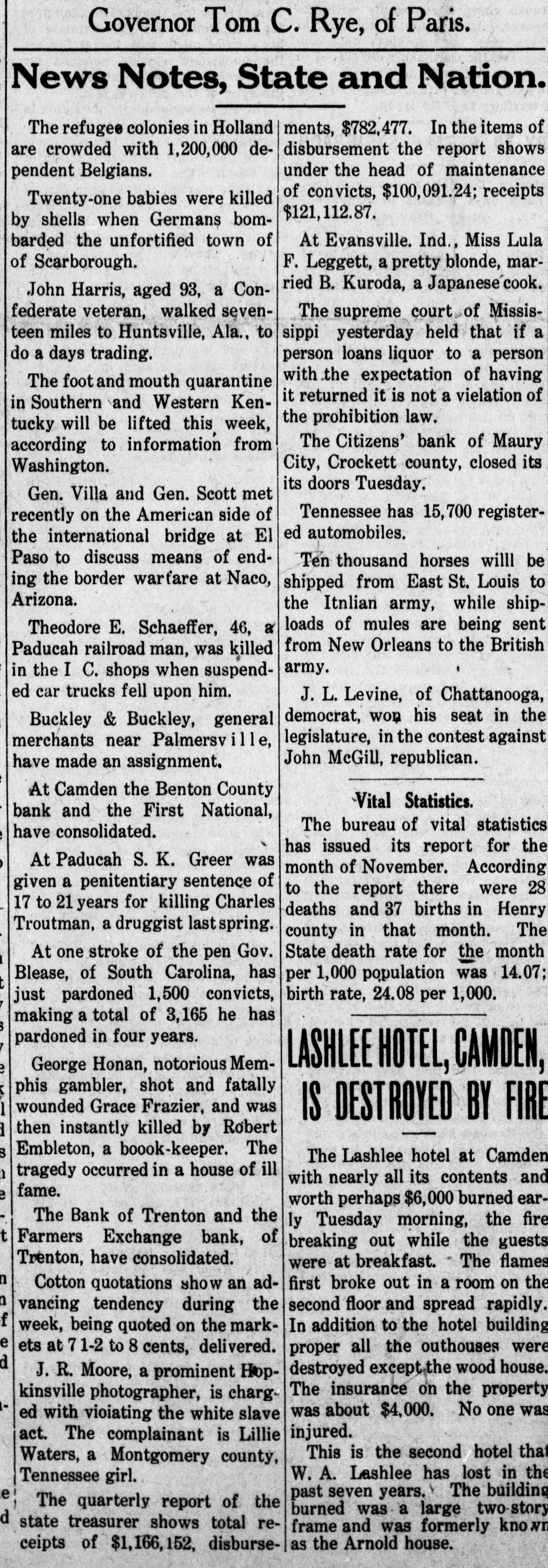 Governor Tom C. Rye, of Paris. News Notes, State and Nation. The refugee colonies in Holland ments, $782,477. In the items of are crowded with 1,200,000 dedisbursement the report shows under the head of maintenance pendent Belgians. of convicts, $100,091.24; receipts Twenty-one babies were killed $121,112.87. by shells when Germans bombarded the unfortified town of At Evansville. Ind., Miss Lula of Scarborough. F. Leggett, a pretty blonde, married B. Kuroda, a Japanese cook. John Harris, aged 93, a Confederate veteran, walked sevenThe supreme court of Missisteen miles to Huntsville, Ala., to sippi yesterday held that if a do a days trading. person loans liquor to a person with the expectation of having The foot and mouth quarantine it returned it is not a vielation of in Southern and Western Kenthe prohibition law. tucky will be lifted this week, The Citizens' bank of Maury according to information from City, Crockett county, closed its Washington. its doors Tuesday. Gen. Villa and Gen. Scott met Tennessee has 15,700 registerrecently on the American side of ed automobiles. the international bridge at El Paso to discuss means of endTen thousand horses willl be ing the border warfare at Naco, shipped from East St. Louis to Arizona. the Itnlian army, while shiploads of mules are being sent Theodore E. Schaeffer, 46, a from New Orleans to the British Paducah railroad man, was killed army. in the I C. shops when suspended car trucks fell upon him. J. L. Levine, of Chattanooga, democrat, won his seat in the Buckley & Buckley, general legislature, in the contest against merchants near Palmersvill John McGill, republican. have made an assignment. At Camden the Benton County Vital Statistics. bank and the First National, The bureau of vital statistics have consolidated. has issued its report for the At Paducah S. K. Greer was month of November. According given a penitentiary sentence of to the report there were 28 17 to 21 years for killing Charles deaths and 37 births in Henry Troutman, a druggist last spring. county in that month. The State death rate for the month At one stroke of the pen Gov. Blease, of South Carolina, has per 1,000 population was 14.07; birth rate, 24.08 per 1,000. just pardoned 1,500 convicts, making a total of 3,165 he has pardoned in four years. LASHLEE HOTEL, CAMDEN, George Honan, notorious Memphis gambler, shot and fatally wounded Grace Frazier, and was 1 IS DESTROYED BY FIRE then instantly killed by Robert S Embleton, a boook-keeper. The The Lashlee hotel at Camden tragedy occurred in a house of ill with nearly all its contents and fame. e worth perhaps $6,000 burned earThe Bank of Trenton and the ly Tuesday morning, the fire t Farmers Exchange bank, of breaking out while the guests Trenton, have consolidated. were at breakfast. The flames n first broke out in a room on the Cotton quotations show an adn second floor and spread rapidly. vancing tendency during the f In addition to the hotel building week, being quoted on the marke ets at 71-2 to 8 cents, delivered. proper all the outhouses were d destroyed except the wood house. J. R. Moore, a prominent HopThe insurance on the property kinsville photographer, is charg. was about $4,000. No one was ed with vioiating the white slave injured. act. The complainant is Lillie This is the second hotel that Waters, a Montgomery county, W. A. Lashlee has lost in the Tennessee girl. e past seven years. The building The quarterly report of the burned was a large two-story d state treasurer shows total reframe and was formerly known as the Arnold house. ceipts of $1,166,152, disburse-