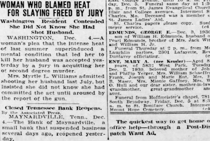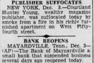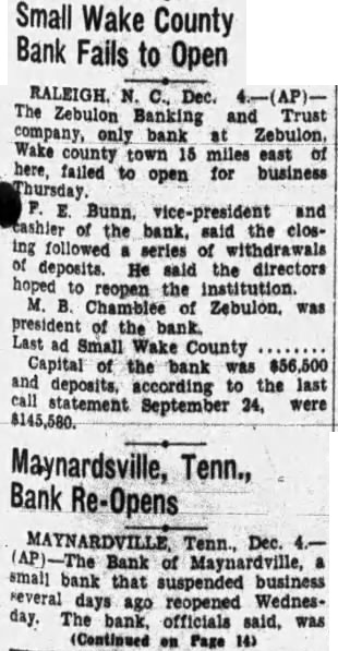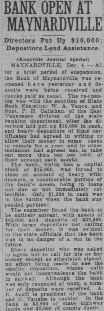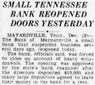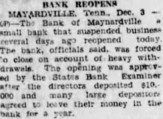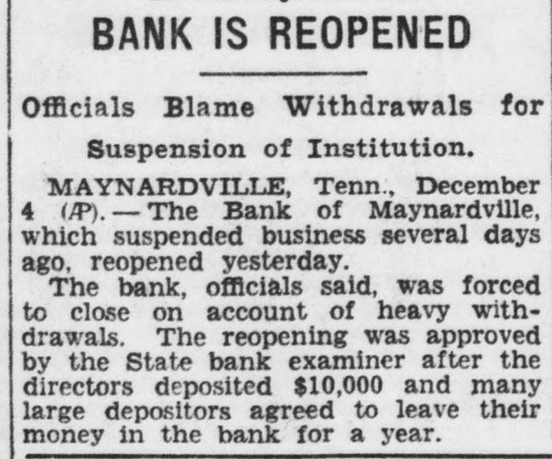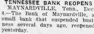 TENNESSEE BANK REOPENS MAYNARDVILLE (Tenn.) Dec. Bank of small that suspended business several days ago, reopened today.