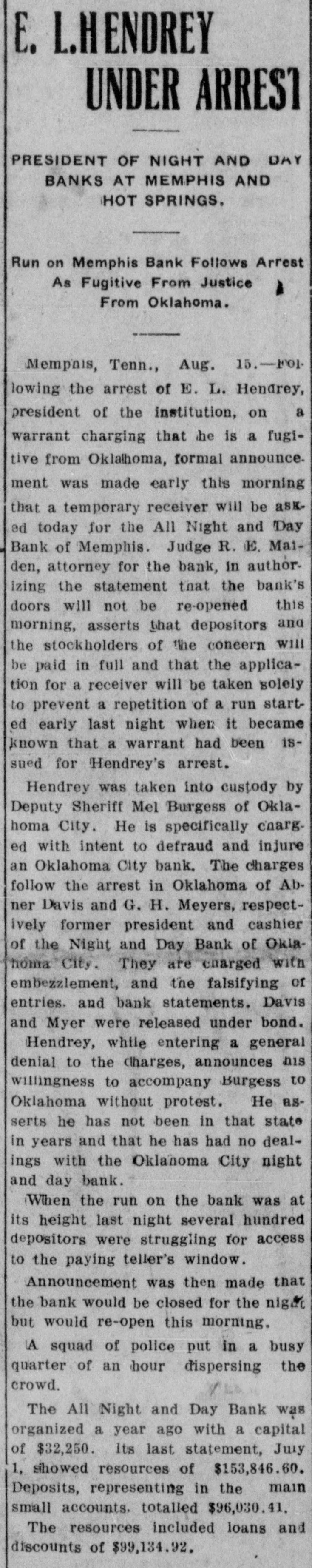 E. L.HENDREY UNDER ARREST PRESIDENT OF NIGHT AND DAY BANKS AT MEMPHIS AND HOT SPRINGS. Run on Memphis Bank Follows Arrest As Fugitive From Justice From Oklahoma. Mempais, Tenn., Aug. 15.-101 lowing the arrest of E. L. Hendrey, a president of the institution, on warrant charging that he is a fugitive from Oklahoma, formal announce. ment was made early this morning that a temporary receiver will be asked today for the All Night and Day Bank of Memphis. Judge R. E. Maiden, attorney for the bank, in authorizing the statement that the bank's doors will not be re-opened this morning, asserts that depositors and the stockholders of the concern will be paid in full and that the application for a receiver will be taken solely to prevent a repetition of a run started early last night when it became known that a warrant had been ISsued for Hendrey's arrest. Hendrey was taken into custody by Deputy Sheriff Mel Burgess of Oklahoma City. He is specifically cnarg. ed with intent to defraud and injure an Oklahoma City bank. The charges follow the arrest in Oklahoma of Abner Davis and G. H. Meyers, respectively former president and cashier of the Night and Day Bank of Oklahoma City. They are enarged with embezzlement, and the falsifying of entries. and bank statements. Davis and Myer were released under bond. Hendrey, while entering a general denial to the charges, announces mis willingness to accompany Burgess to Oklahoma without protest. He asserts he has not been in that state in years and that he has had no dealings with the Oklahoma City night and day bank. When the run on the bank was at its height last night several hundred depositors were struggling for access to the paying teller's window. Announcement was then made that the bank would be closed for the night but would re-open this morning. A squad of police put in a busy quarter of an hour dispersing the crowd. The All Night and Day Bank was organized a year ago with a capital of $32,250. Its last statement, July 1, showed resources of $153,846.60. Deposits, representing in the main small accounts. totalled $96,030.41. The resources included loans and discounts of $99,134.92.