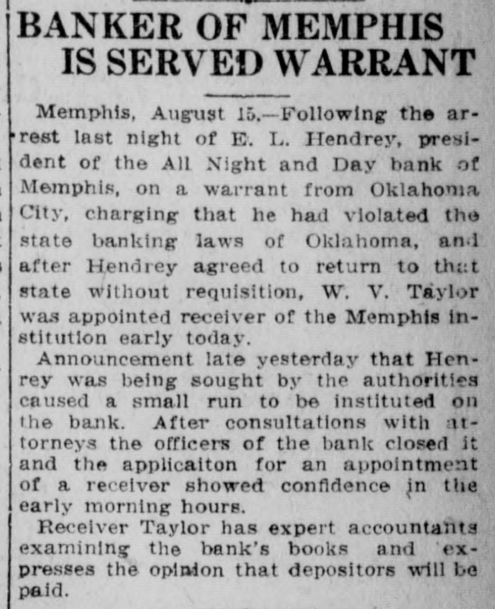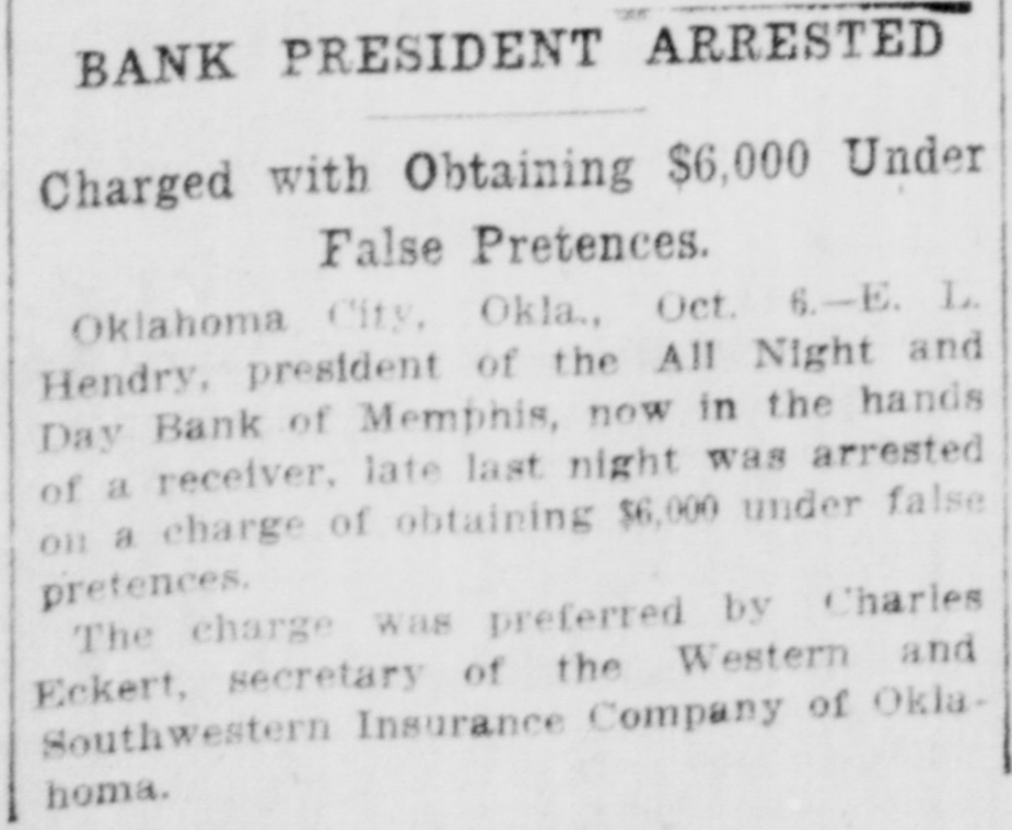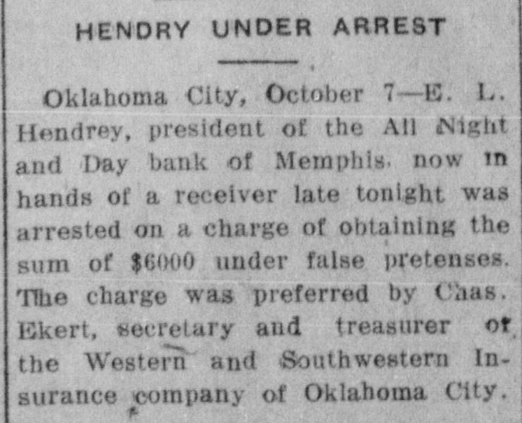 HENDRY UNDER ARREST Oklahoma City, October 7-E. L. Hendrey, president of the All Night and Day bank of Memphis now in hands of a receiver late tonight was arrested on a charge of obtaining the sum of $6000 under false pretenses. The charge was preferred by Chas. Ekert, secretary and treasurer of the Western and Southwestern Insurance company of Oklahoma City.