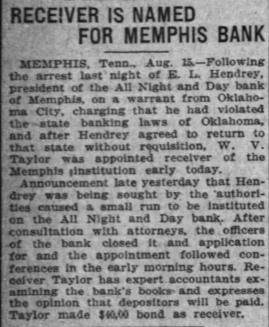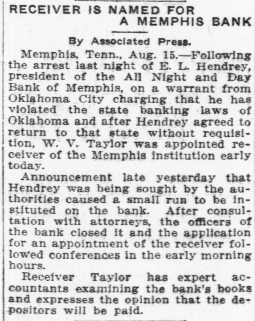 RECEIVER IS NAMED FOR A MEMPHIS BANK By Associated Press. Memphis, Tenn., Aug. 15.-Following the arrest last night of E. L. Hendrey, president of the All Night and Day Bank of Memphis, on a warrant from Oklahoma City charging that he has violated the state banking laws of Oklahoma and after Hendrey agreed to return to that state without requisition, W. V. Taylor was appointed receiver of the Memphis institution early today. Announcement late yesterday that Hendrey was being sought by the authorities caused a small run to be instituted on the bank. After consultation with attorneys, the officers of the bank closed it and the application for an appointment of the receiver followed conferences in the early morning hours. Receiver Taylor has expert accountants examining the bank's books and expresses the opinion that the depositors will be paid.