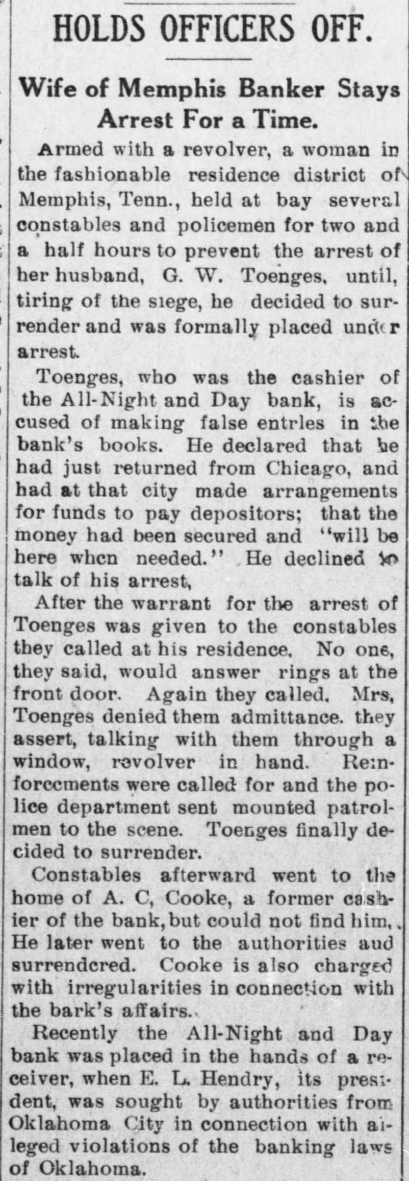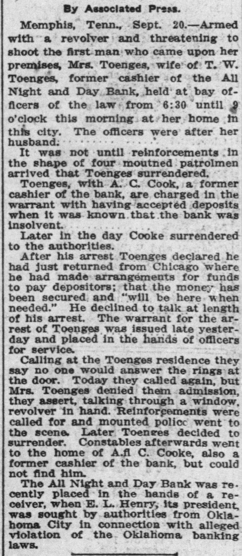 By Associated Press. Memphis, Tenn., Sept. 20.-Armed with a revolver and threatening to shoot the first man who came upon her premises, Mrs. Toenges, wife of T. W. Toenges, former cashier of the All Night and Day Bank, held at bay officers of the law from 6:30 until 9 o'clock this morning at her home in this city. The officers were after her husband: It was not until reinforcements in the shape of four moutned patrolmen arrived that Toenges surrendered, Toenges, with A. C. Cook, a former cashier of the bank, are charged in the warrant with having accepted deposits when it was known that the bank was insolvent. Later in the day Cooke surrendered to the authorities. After his arrest Toenges declared he had just returned from Chicago where he had made arrangements for funds to pay depositors; that the money has been secured and "will be here when needed." He declined to talk at length of his arrest. The warrant for the arrest of Toenges was issued late yesterday and placed in the hands of officers for service. Calling at the Toenges residence they say no one would answer the rings at the door. Today they called again, but Mrs. Toenges denied them admission, they assert, talking through a window, revolver in hand. Reinforçements were called for and mounted police went to the scene. Later Toenges decided to surrender. Constables afterwards went to the home of A.fl C. Cooke, also a former cashier of the bank, but could not find him. The All Night and Day Bank was re. cently placed in the hands of a receiver, when E. L. Henry, its president, was sought by authorities from Oklahoma City in connection with alleged violation of the Oklahoma banking laws.