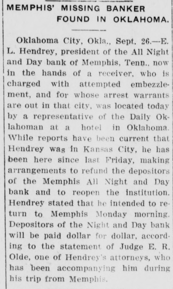 MEMPHIS' MISSING BANKER FOUND IN OKLAHOMA. Oklahoma City, Okla., Sept. 26.-E. L. Hendrey, president of the All Night and Day bank of Memphis, Tenn., now in the hands of a receiver. who is charged with attempted embezzlement, and for whose arrest warrants are out in that city, was located today by a representative of the Daily Oklahoman at a hotel in Oklahoma. While reports have been current that Hendrey was in Kansas City, he has been here since last Friday, making arrangements to refund the depositors of the Memphis All Night and Day bank and to reopen the institution. Hendrey stated that he intended to return to Memphis Monday morning. Depositors of the Night and Day bank will be paid dollar for dollar, according to the statement of Judge E. R. Olde, one of Hendrey's attorneys, who has been accompanying him during his trip from Memphis.