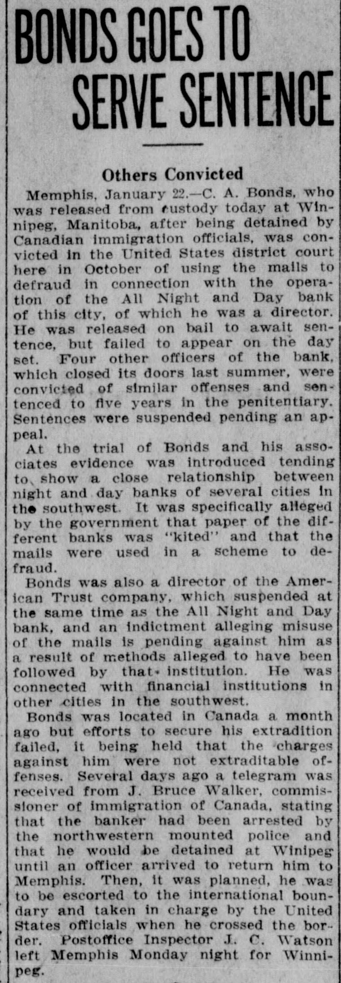 BONDS GOES TO SERVE SENTENCE Others Convicted Memphis, January 22.-C. A. Bonds, who was released from custody today at Winnipeg, Manitoba, after being detained by Canadian immigration officials, was convicted in the United States district court here in October of using the mails to defraud in connection with the operation of the All Night and Day bank of this city, of which he was a director. He was released on bail to await sentence, but failed to appear on the day set. Four other officers of the bank. which closed its doors last summer, were convicted of similar offenses and sentenced to five years in the penitentiary. Sentences were suspended pending an appeal. At the trial of Bonds and his assowas a close to, ciates show evidence relationship introduced between tending night and day banks of several cities in the southwest. It was specifically alleged by the government that paper of the different banks was "kited" and that the mails were used in a scheme to defraud. Bonds was also a director of the American Trust company, which suspended at the same time as the All Night and Day bank, and an indictment alleging misuse of the mails is pending against him as a result of methods alleged to have been followed by that. institution. He was connected with financial institutions in other cities in the southwest. Bonds was located in Canada a month ago but efforts to secure his extradition failed, it being held that the charges against him were not extraditable offenses. Several days ago a telegram was received from J. Bruce Walker, commissioner of immigration of Canada, stating that the banker had been arrested by the northwestern mounted police and that he would be detained at Winipeg until an officer arrived to return him to Memphis. Then, it was planned, he was to be escorted to the international boundary and taken in charge by the United States officials when he crossed the border. Postoffice Inspector J. C. Watson left Memphis Monday night for Winnipeg.