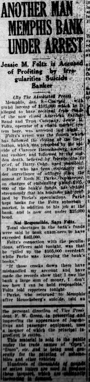 ANOTHER MAN MEMPHIS BANK UNDER ARREST Jessie M. Foltz is Accused by Irreof Profiting gularities Suicide Banker (By The Associated Press) Memphis, Jan. 8-Charged with grand larceny of $107,000 which alleged to have received from of the now closed American Band and Trust Company, Jessice Foltz, operator of chain market tem here. was arrested last bight Foltz's arrest was the fourth has followed the closing of the Insti tution. which was the cide of Clarence ant cashier, and followed sud den death. believed grief. of Harry Cohn. aged president Foltz who has been Poostantly ub: der survellance of officers since the arrest of Rush H: Parke on charges of embezzling 000 of the bank's funds, has that his business ited by Parke's speculations Parke kept hooks for the Foltz suburban market. in addition to his job at the bank. and is now out under $25,000 Not Responsible, Says Feitz. Total shortages in the bank's funds were said by bank examiners have $463,000. Foltz's connection with the peculiations, officers said tonight, was that be "piled up the $105,000 overdraft while Parke was keeping the bank's "If those crooks down there have mishandled my account and have made the records show that owe the bank large sum of money, don't see how can be held responsible, Foltz told reporters tonight Parke, who to Memphis after Henochsberg's suicide, teld an the personal direction of Vice Presk dent W. Green, in preserving improving the appearance of Jumpitioand passenger Inequer of which the principal is is This material is sold to the public under the trade names of and being for the and other Hundreds of thousands