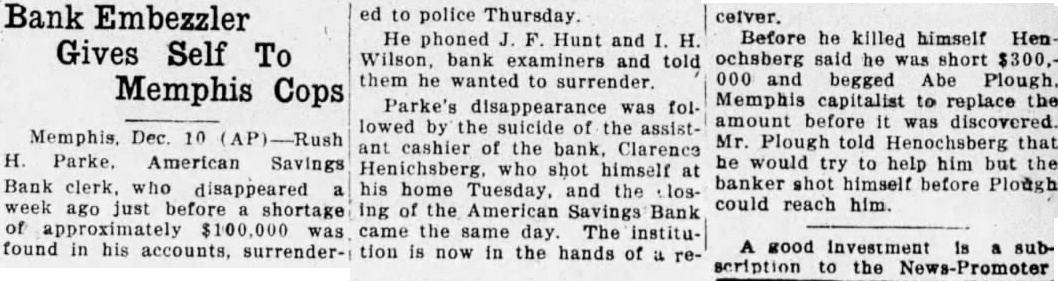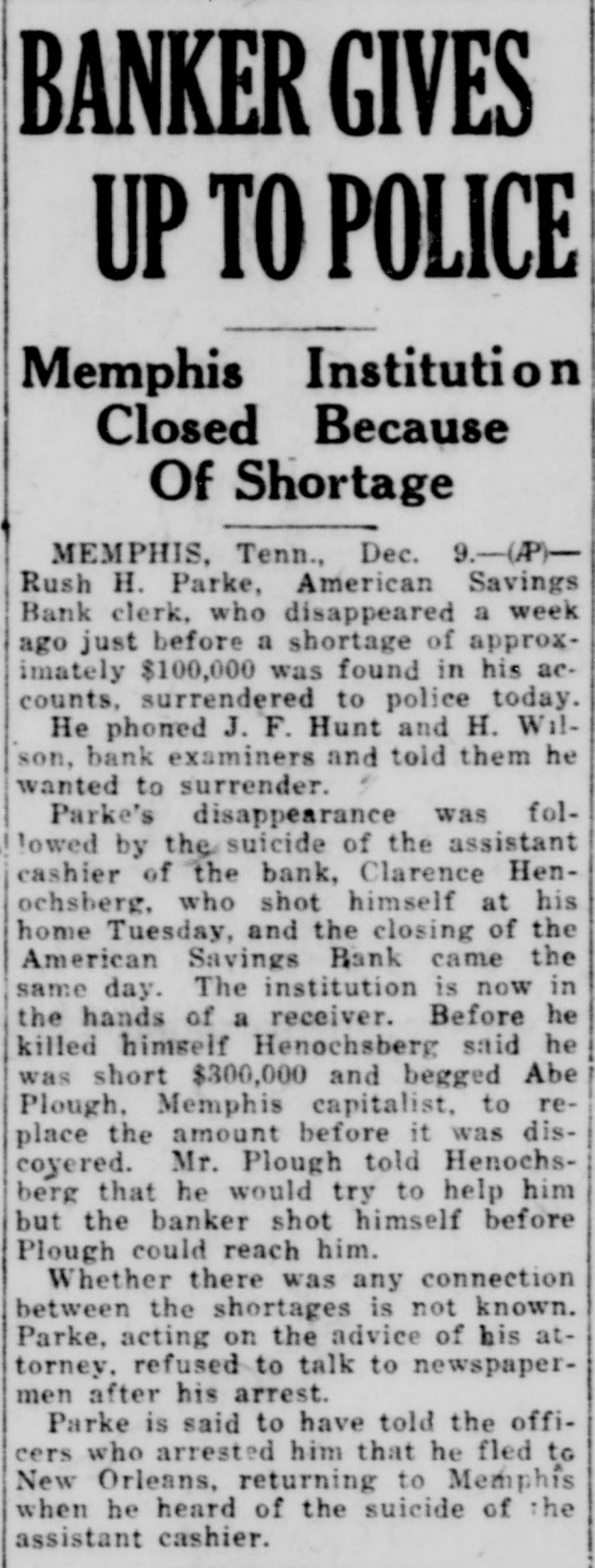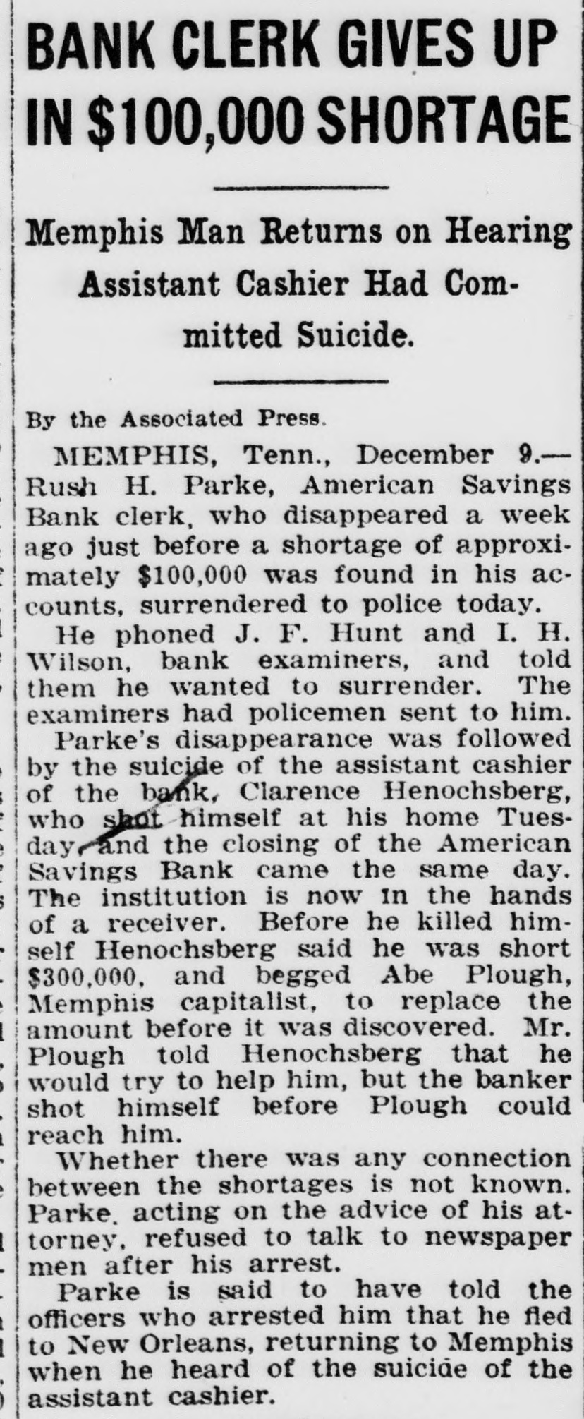 BANK CLERK GIVES UP IN $100,000 SHORTAGE Memphis Man Returns on Hearing Assistant Cashier Had Committed Suicide. By the Associated Press. MEMPHIS, Tenn., December 9.Rush H. Parke, American Savings Bank clerk, who disappeared a week ago just before a shortage of approximately $100,000 was found in his accounts, surrendered to police today. He phoned J. F. Hunt and I. H. Wilson, bank examiners, and told them he wanted to surrender. The examiners had policement sent to him. Parke's disappearance was followed by the suicide of the assistant cashier of the bank. Clarence Henochsberg, who shot himself at his home Tuesday and the closing of the American Savings Bank came the same day. The institution is now in the hands of a receiver. Before he killed himself Henochsberg said he was short $300,000. and begged Abe Plough, Memphis capitalist, to replace the amount before it was discovered. Mr. Plough told Henochsberg that he would try to help him, but the banker shot himself before Plough could reach him. Whether there was any connection between the shortages is not known. Parke. acting on the advice of his attorney. refused to talk to newspaper men after his arrest. Parke is said to have told the officers who arrested him that he fled to New Orleans, returning to Memphis when he heard of the suicide of the assistant cashier.