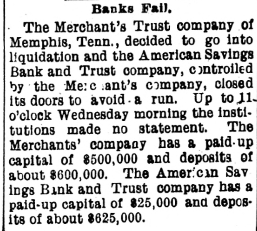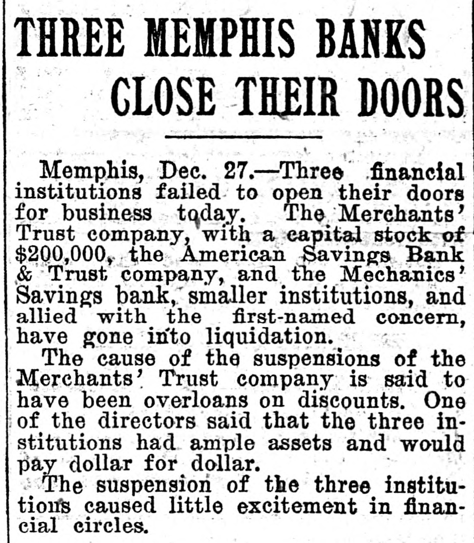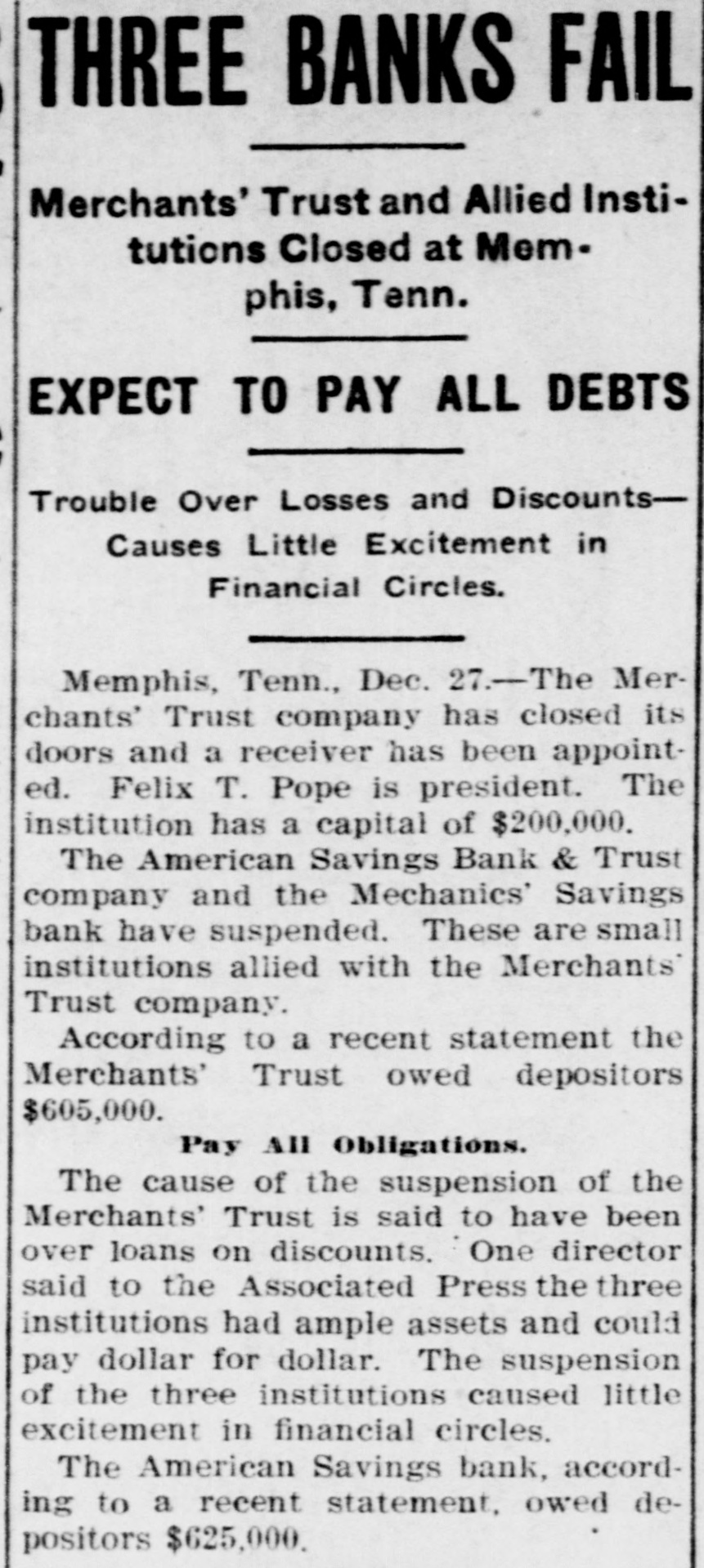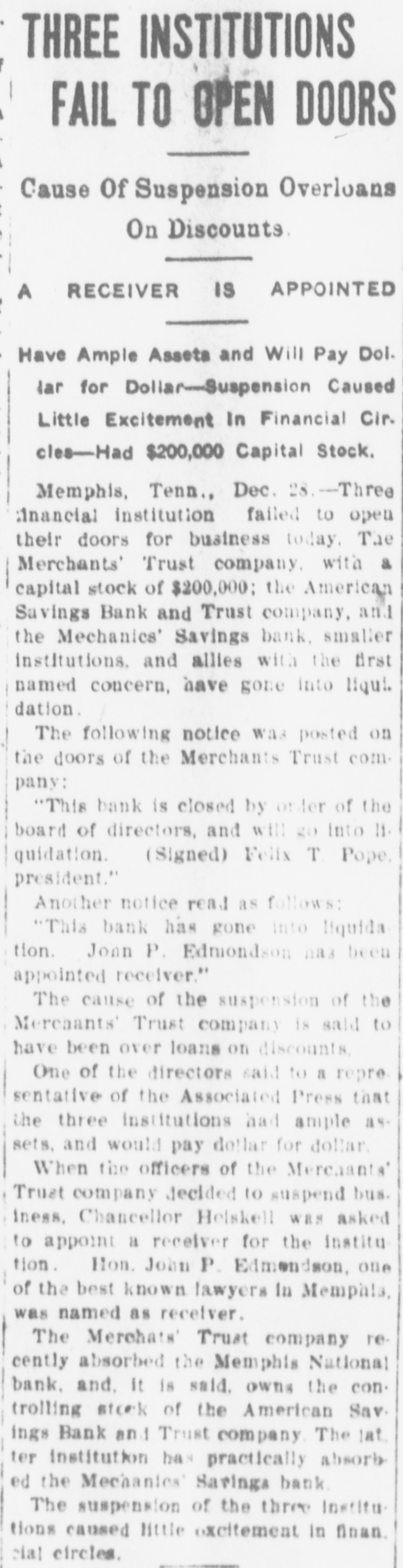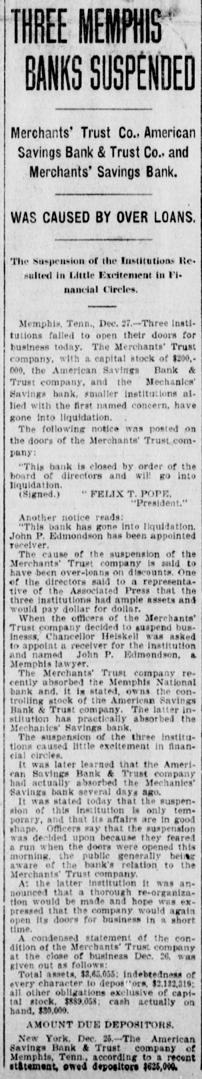 THREE MEMPHIS BANKS SUSPENDED Merchants' Trust Co., American Savings Bank & Trust Co., and Merchants' Savings Bank. WAS CAUSED BY OVER LOANS. The Suspension of the Institutions Re. sulted in Little Excitement in Financial Circles. Memphis, Tenn., Dec. 27.-Three institutions failed to open their doors for business today. The Merchants' Trust company, with a capital stock of $200,000, the American Savings Bank & Trust company, and the Mechanics' Savings bank, smaller institutions allied with the first named concern, have gone into liquidation. The following notice was posted on the doors of the Merchants' Trust.company: "This bank is closed by order of the board of directors and will go into liquidation. " FELIX T. POPE. (Signed.) "President." Another notice reads: "This bank has gone into liquidation. John P. Edmondson has been appointed receiver. The cause of the suspension of the Merchants' Trust company is said to have been over-loans on discounts. One of the directors said to a representative of the Associated Press that the three institutions had ample assets and would pay dollar for dollar. When the officers of the Merchants' Trust company decided to suspend businesss, Chancellor Heiskell was asked to appoint a receiver for the institution and named John P. Edmondson, a. Memphis lawyer. The Merchants' Trust company recently absorbed the Memphis National bank and. it is stated, owns the controlling stock of the American Savings Bank & Trust company. The latter institution has practically absorbed the Mechanics' Savings bank. The suspension of the three institutions caused little excitement in financial circles. It was later learned that the American Savings Bank & Trust company had actually absorbed the Mechanics' Savings bank several days ago. It was stated today that the suspension of this institution is only temporary, and that its affairs are in good shape. Officers say that the suspension was decided upon because they feared a run when the doors were opened this morning. the public generally being aware of the bank's relation to the Merchants' Trust company. At the latter Institution It was announced that a thorough re-organization would be made and hope was expressed that the company would again open its doors for business in a short time. A condensed statement of the condition of the Merchants' Trust company at the close of business Dec. 26, was given out as follows: Total assets, $3,65,055: indebtedness of every character to depositors, $2,132,319: all other obligations exclusive of capital stock, $889,058; cash actually on hand, $30,000. AMOUNT DUE DEPOSITORS. New York. Dec. 26.-The American Savings Bank & Trust company of Memphis, Tenn., according to a recent statement, owed depositors $625,000.