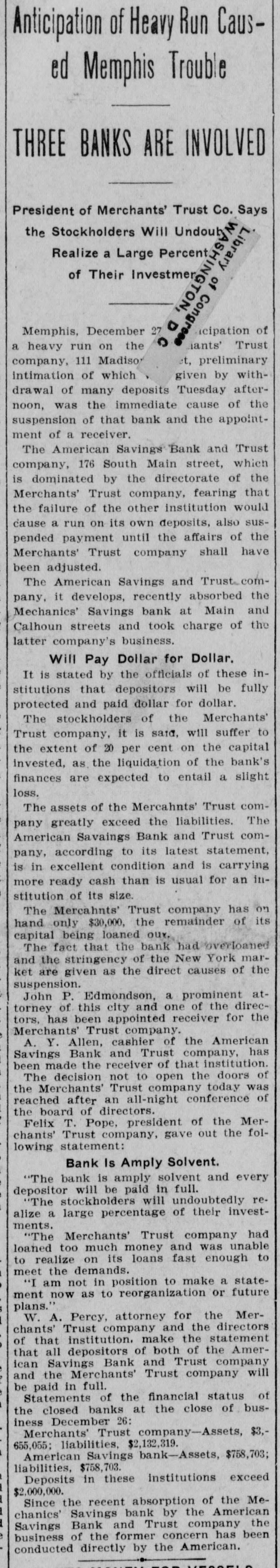 Anticipation of Heavy Run Caused Memphis Trouble THREE BANKS ARE INVOLVED President of Merchants' Trust Co. Says the Stockholders Will Undoub Realize a Large Percent. of Their Investmer cipation of Memphis, December 27 F iants' Trust a heavy run on the et, preliminary company, 111 Madison intimation of which given by withdrawal of many deposits Tuesday afternoon, was the immediate cause of the suspension of that bank and the appointment of a receiver. The American Savings Bank and Trust company, 176 South Main street, which is dominated by the directorate of the Merchants' Trust company, fearing that the failure of the other institution would cause a run on its own deposits, also suspended payment until the affairs of the Merchants' Trust company shall have been adjusted. The American Savings and Trust company, it develops, recently absorbed the Mechanics' Savings bank at Main and Calhoun streets and took charge of the latter company's business. Will Pay Dollar for Dollar. It is stated by the officials of these institutions that depositors will be fully protected and paid dollar for dollar. The stockholders of the Merchants' Trust company, it is said, will suffer to the extent of 20 per cent on the capital invested, as the liquidation of the bank's finances are expected to entail a slight loss. The assets of the Mercahnts' Trust company greatly exceed the liabilities. The American Savaings Bank and Trust company, according to its latest statement, is in excellent condition and is carrying more ready cash than is usual for an institution of its size. The Mercahnts' Trust company has on hand only $30,000, the remainder of its capital being loaned our. The fact that the bank had overloaned and the stringency of the New York market are given as the direct causes of the suspension. John P. Edmondson, a prominent attorney of this city and one of the directors, has been appointed receiver for the Merchants' Trust company. A. Y. Allen, cashier of the American Savings Bank and Trust company, has been made the receiver of that institution. The decision not to open the doors of the Merchants' Trust company today was reached after an all-night conference of the board of directors. Felix T. Pope, president of the Merchants' Trust company, gave out the following statement: Bank Is Amply Solvent. "The bank is amply solvent and every depositor will be re'The stockholders paid will in undoubtedly full. alize a large percentage of their investments. "The Merchants' Trust company had loaned too much money and was unable to realize on its loans fast enough to meet the demands. "I am not in position to make a statement now as to reorganization or future plans." W. A. Percy, attorney for the Merchants' Trust company and the directors of that institution. make the statement that all depositors of both of the American Savings Bank and Trust company and the Merchants' Trust company will be paid in full. Statements of the financial status of the closed banks at the close of business December 26: Merchants' Trust company-Assets, $3.655,055; liabilities, $2,132,319. American Savings bank-Assets, $758,703; liabilities, $758,703. Deposits in these institutions exceed $2,000,000. Since the recent absorption of the Mechanics' Savings bank by the American Bank and the of the former concern been business Savings Trust American. company has conducted directly by the