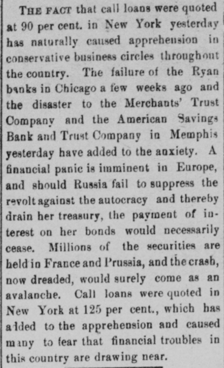 THE FACT that call loans were quoted at 90 per cent. in New York yesterday has naturally caused apprehension in conservative business circles throughout the country. The failure of the Ryan banks in Chicago a few weeks ago and the disaster to the Merchants' Trust Company and the American Savings Bank and Trust Company in Memphis yesterday have added to the anxiety. A financial panic is imminent in Europe, and should Russia fail to suppress the revolt against the autocracy and thereby drain her treasury, the payment of interest on her bonds would necessarily cease. Millions of the securities are held in France and Prussia, and the crash, now dreaded, would surely come as an avalanche. Call loans were quoted in New York at 125 per cent., which has added to the apprehension and caused many to fear that financial troubles in this country are drawing near.