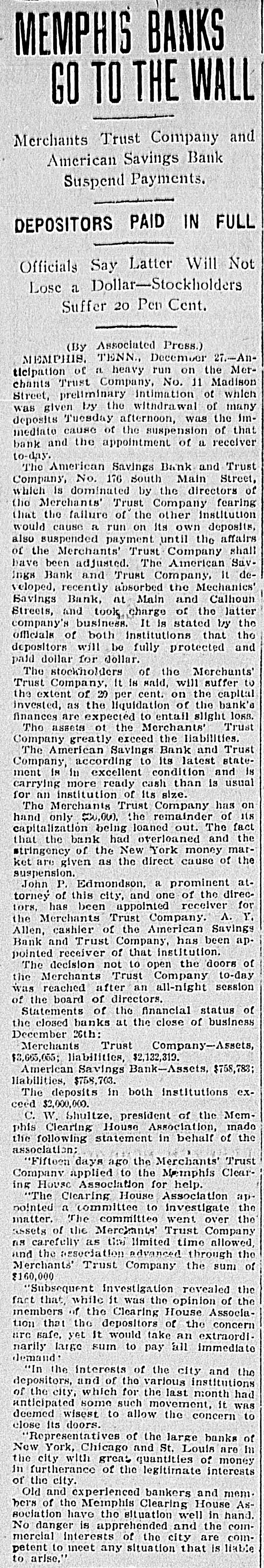 MEMPHIS BANKS GO TO THE WALL Merchants Trust Company and American Savings Bank Suspend Payments. DEPOSITORS PAID IN FULL Officials Say Latter Will Not Lose a Dollar-Stockholders Suffer 20 Pen Cent. (By Associated Press.) MEMPHIS. TENN., December 27.-Anticipation of a heavy run on the Merchants Trust Company, No. 11 Madison Street, preliminary intimation of which was given by the withdrawal of many deposits Tuesday afternoon, was the Immediate cause of the suspension of that bank and the appointment of a receiver to-day. The American Savings Bank and Trust Company, No. 176 South Main Street, which is dominated by the directors of the Merchants' Trust Company fearing that the failure of the other institution would cause a run on its own deposits, also suspended payment until the affairs of the Merchants' Trust Company shall have been adjusted. The American SavIngs Bank and Trust Company, It developed, recently absorbed the Mechanics' Savings Bank, at Main and Calhoun Streets, and took charge of the latter company's business. It is stated by the officials of both institutions that the depositors will be fully protected and paid dollar for dollar. The stockholders of the Merchants' Trust Company, It 18 said, will suffer to the extent of 20 per cent. on the capital invested, as the liquidation of the bank's finances are expected to entail slight loss. The assets of the Merchants' Trust Company greatly exceed the liabilities. The American Savings Bank and Trust Company, according to its latest statement is in excellent condition and is carrying more ready cash than is usual for an institution of its size. The Merchants Trust Company has on hand only $00,000. the remainder of its capitalization being loaned out. The fact that the bank had overloaned and the stringency of the New York money market are given as the direct cause of the suspension. John P. Edmondson, a prominent attorney of this city, and one of the directors, has been appointed receiver for the Merchants Trust Company. A. Y. Allen, cashier of the American Savings Bank and Trust Company, has been appointed receiver of that institution. The decision not to open the doors of the Merchants Trust Company to-day was reached after an all-night session of the board of directors. Statements of the financial status of the closed banks at the close of business December 26th: Merchants Trust Company-Assets, $3,665,055; liabilities, $2,132,310. American Savings Bank-Assets, $758,783; liabilities, $758,703. The deposits in both institutions exceed $2,000,000. C. W. Shultze, president of the Memphis Clearing House Association, made the following statement in behalf of the association; "Fifteen days ago the Merchants' Trust Company applied to the Memphis Clearing House Association for help. "The Clearing House Association appointed a committee to investigate the matter. The committee went over the assets of the Merchants' Trust Company ns carefully as time limited time allowed, and the association advanced through the Merchants' Trust Company the sum of $160,000 "Subsequent investigation revealed the fact that, while it was the opinion of the members of the Clearing House Association that the depositors of the concern HTC safe, yet It would take an extraordinarily large sum to pay all immediate demand: