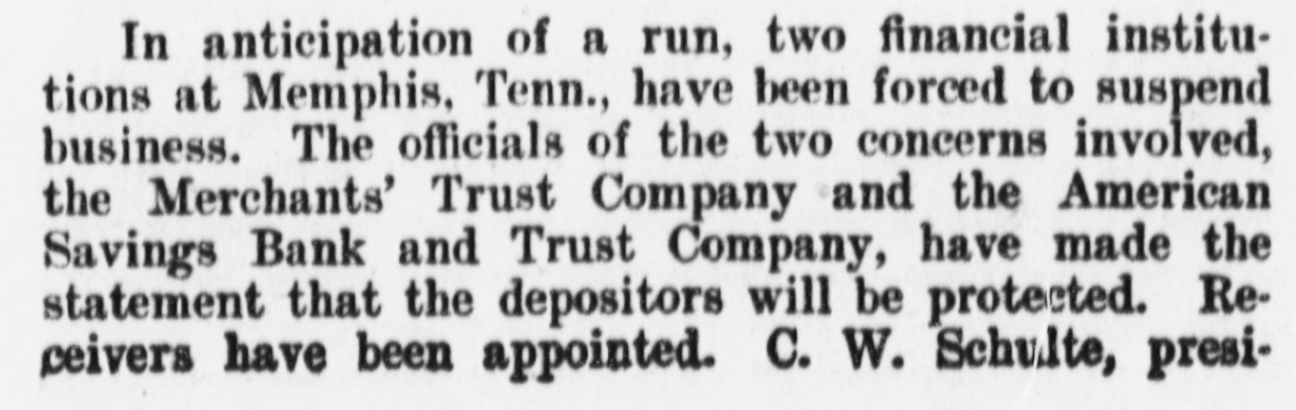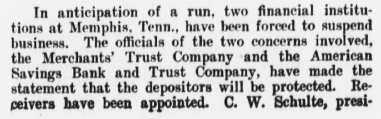 In anticipation of a run, two financial institutions at Memphis, Tenn., have been forced to suspend business. The officials of the two concerns involved, the Merchants' Trust Company and the American Savings Bank and Trust Company, have made the statement that the depositors will be protected. Receivers have been appointed. C. W. Schulte, presi-
