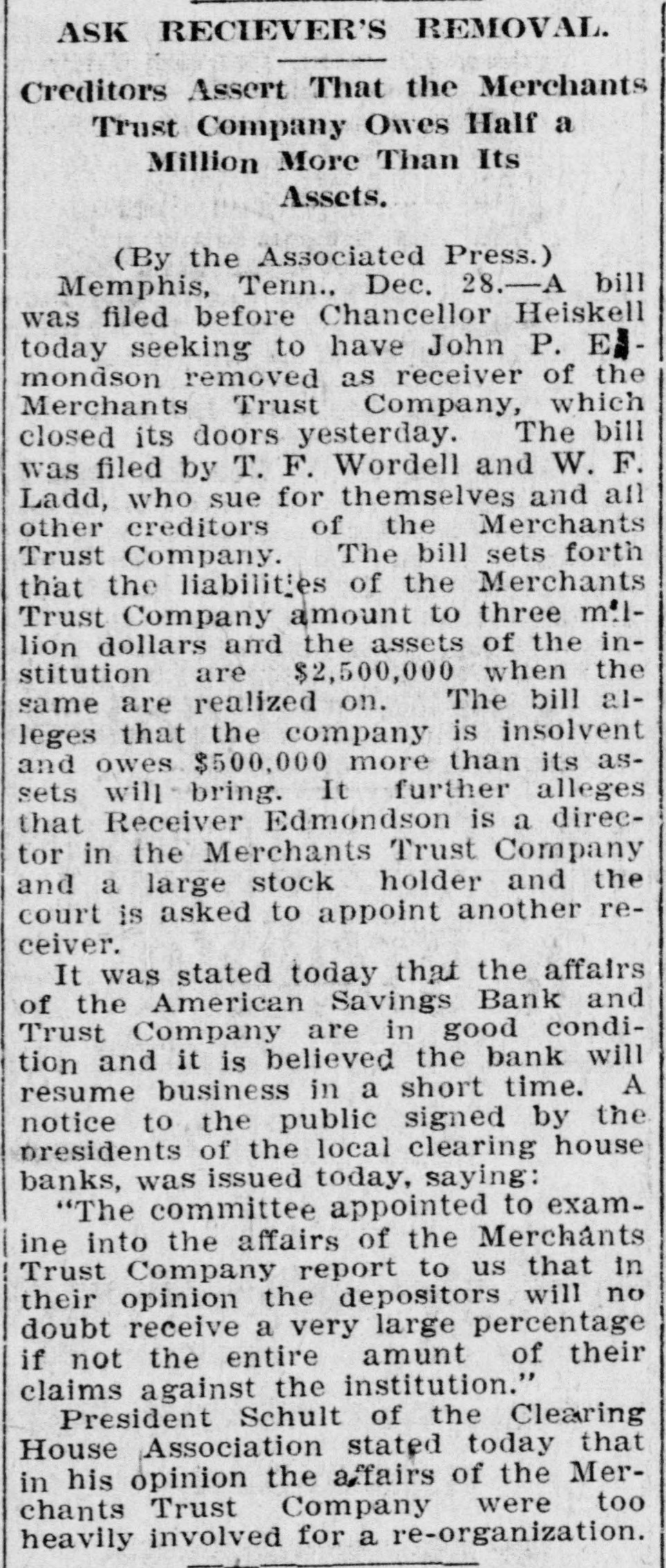 ASK RECIEVER'S REMOVAL. Creditors Assert That the Merchants Trust Company Owes Half a Million More Than Its Assets. (By the Associated Press.) Memphis, Tenn., Dec. 28.-A bill was filed before Chancellor Heiskell today seeking to have John P. E mondson removed as receiver of the Merchants Trust Company, which closed its doors yesterday. The bill was filed by T. F. Wordell and W. F. Ladd, who sue for themselves and all other creditors of the Merchants Trust Company. The bill sets forth that the liabilities of the Merchants Trust Company amount to three m:1lion dollars and the assets of the institution are $2,500,000 when the same are realized on. The bill alleges that the company is insolvent and owes $500,000 more than its assets will bring. It further alleges that Receiver Edmondson is a director in the Merchants Trust Company and a large stock holder and the court is asked to appoint another receiver. It was stated today that the affairs of the American Savings Bank and Trust Company are in good condition and it is believed the bank will resume business in a short time. A notice to the public signed by the presidents of the local clearing house banks, was issued today, saying: "The committee appointed to examine into the affairs of the Merchants Trust Company report to us that in their opinion the depositors will no doubt receive a very large percentage if not the entire amunt of their claims against the institution." President Schult of the Clearing House Association stated today that in his opinion the afairs of the Merchants Trust Company were too heavily involved for a re-organization.