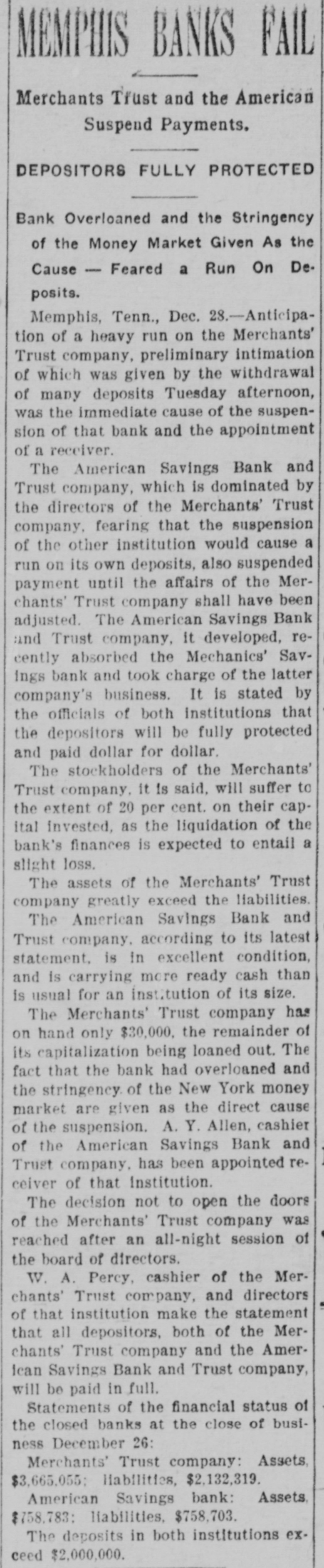 MEMPHIS BANKS FAIL Merchants Tfust and the American Suspend Payments. DEPOSITORS FULLY PROTECTED Bank Overloaned and the Stringency of the Money Market Given As the Cause - Feared a Run On Deposits. Memphis, Tenn., Dec. 28.-Anticipation of a heavy run on the Merchants' Trust company, preliminary intimation of which was given by the withdrawal of many deposits Tuesday afternoon, was the immediate cause of the suspension of that bank and the appointment of a receiver. The American Savings Bank and Trust company, which is dominated by the directors of the Merchants' Trust company, fearing that the suspension of the other institution would cause a run on its own deposits, also suspended payment until the affairs of the Merchants' Trust company shall have been adjusted. The American Savings Bank and Trust company, it developed, recently absorbed the Mechanics' Savings bank and took charge of the latter company's business. It is stated by the officials of both institutions that the depositors will be fully protected and paid dollar for dollar. The stockholders of the Merchants' Trust company, it is said, will suffer to the extent of 20 per cent. on their capital invested, as the liquidation of the bank's finances is expected to entail a slight loss. The assets of the Merchants' Trust company greatly exceed the liabilities. The American Savings Bank and Trust company. according to its latest statement, is in excellent condition, and is carrying more ready cash than is usual for an institution of its size. The Merchants' Trust company has on hand only $30,000. the remainder of its capitalization being loaned out. The fact that the bank had overloaned and the stringency. of the New York money market are given as the direct cause of the suspension. A. Y. Allen, cashier of the American Savings Bank and Trust company. has been appointed receiver of that Institution. The decision not to open the doors of the Merchants' Trust company was reached after an all-night session of the board of directors. W. A. Percy, cashier of the Merchants' Trust company, and directors of that institution make the statement that all depositors, both of the Merchants' Trust company and the Amerlean Savings Bank and Trust company, will be paid in full. Statements of the financial status of the closed banks at the close of business December 26: Merchants' Trust company: Assets, $3,665,055; Habilities, $2,132,319. American Savings bank: Assets. $758,783: liabilities. $758,703. The deposits in both institutions exceed $2,000,000.