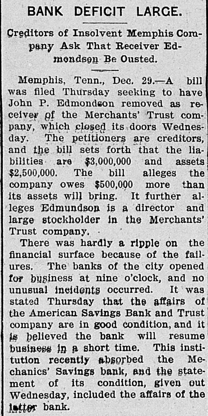 BANK DEFICIT LARGE. Creditors of Insolvent Memphis Company Ask That Receiver Edmondson Be Ousted. Memphis, Tenn., Dec. 29.-A bill was filed Thursday seeking to have John P. Edmondson removed as receiver of the Merchants' Trust company, which closed its doors Wednesday. The petitioners are creditors, and the bill sets forth that the liabilities are $3,000,000 and assets $2,500,000. The bill alleges the company owes $500,000 more than its assets will bring. It further alleges Edmundson is a director and large stockholder in the Merchants' Trust company. There was hardly a ripple on the financial surface because of the failures. The banks of the city opened for business at nine o'clock, and no unusual incidents occurred. It was stated Thursday that the affairs of the American Savings Bank and Trust company are in good condition, and it is believed the bank will resume business in a short time. This institution recently absorbed the Mechanics' Savings bank, and the statement of its condition, given out Wednesday, included the affairs of the letter bank.