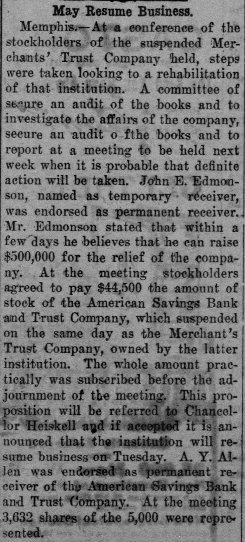 May Resume Business. Memphis.-At a conference of the stockholders of the suspended Merchants' Trust Company held, steps were taken looking to a rehabilitation of that institution. A committee of secure an audit of the books and to investigate the affairs of the company, secure an audit o fthe books and to report at a meeting to be held next week when it is probable that definite action will be taken. John E. Edmonson, named as temporary receiver, was endorsed as permanent receiver. Mr. Edmonson stated that within a few days he believes that he can raise $500,000 for the relief of the company. At the meeting stockholders agreed to pay $44,500 the amount of stock of the American Savings Bank and Trust Company, which suspended on the same day as the Merchant's Trust Company, owned by the latter institution. The whole amount practically was subscribed before the adjournment of the meeting, This proposition will be referred to Chancellor Heiskell and if accepted it is announced that the institution will resume business on Tuesday. A. Y. Allen was endorsed as permanent receiver of the American Savings Bank and Trust Company. At the meeting 3,632 shares of the 5,000 were represented.