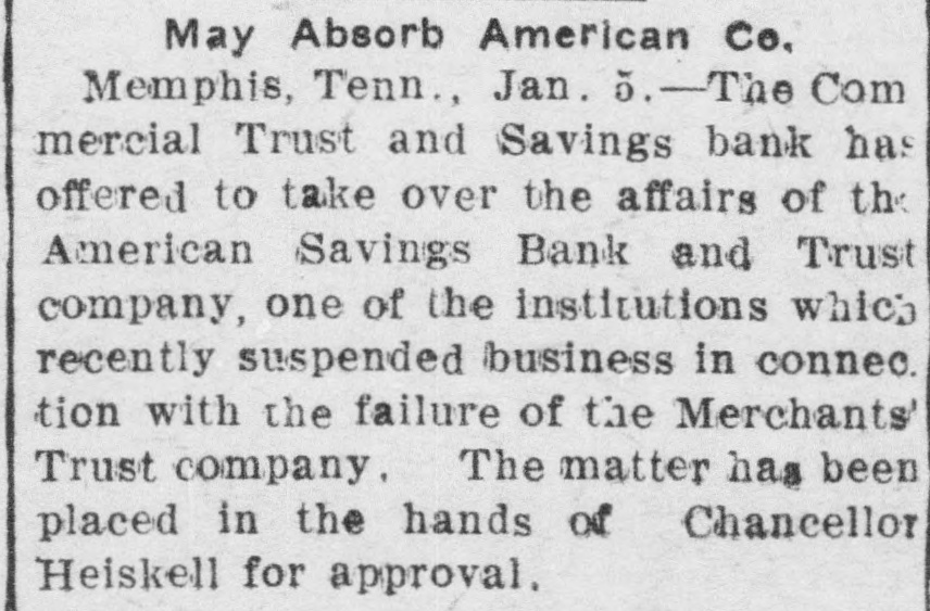 May Absorb American Co. Memphis, Tenn., Jan. .-The Com mercial Trust and Savings bank has offered to take over the affairs of the American Savings Bank and Trust company, one of the institutions which recently suspended business in connec. tion with the failure of the Merchants' Trust company, The matter has been placed in the hands of Chancellor Heiskell for approval.