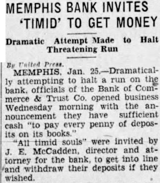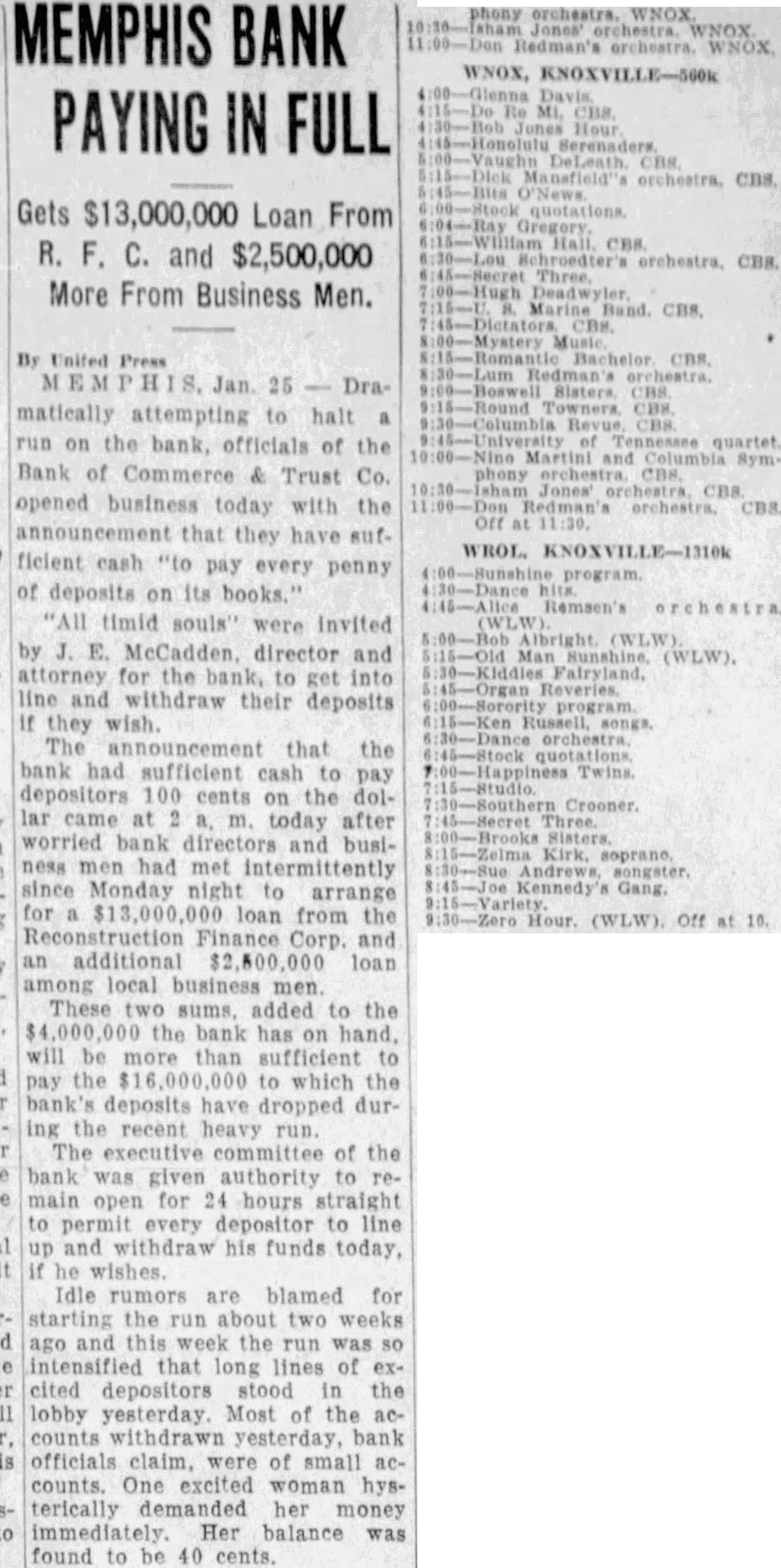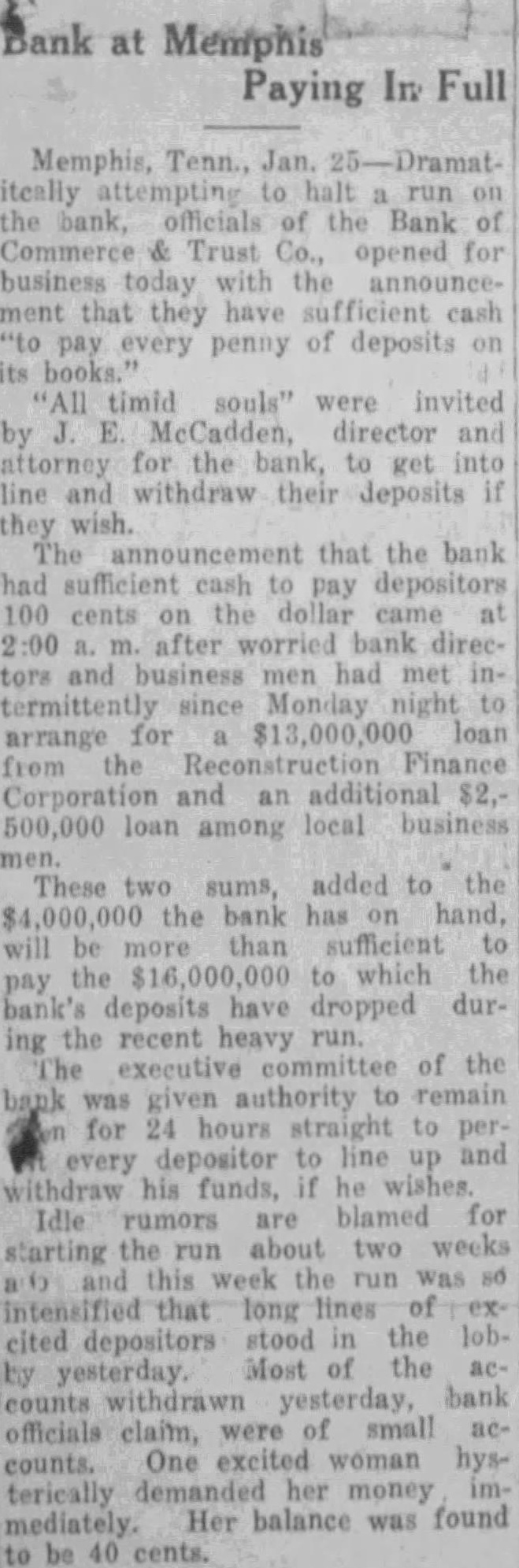 Memphis, Tenn., Jan 25-Dramatiteally attempting to halt run the bank, officials of the Bank of Commerce & Trust Co., opened for business today with the announcement that they have sufficient cash "to pay every penny of deposits its books. timid souls" were invited by E. McCadden. director and attorney for the bank, to get into line and withdraw their deposits if they wish. The announcement that the bank had sufficient cash pay depositors 100 cents on the dollar came at after worried bank directors and business men had met intermittently since Monday night to arrange for $13,000,000 loan from the Finance Corporation and an additional $2,500,000 loan among local business men. These two sums, added to the $4,000,000 the bank has hand, will be more than sufficient to pay the $16,000,000 to which the bank's deposits have dropped during the recent heavy run. executive committee of the bank was given authority to remain for 24 hours straight to every depositor to line up and withdraw his funds, if he wishes. Idle rumors are blamed for starting the run about two weeks this week the run was só intensified that long lines of cited depositors stood in the lobMost of the counts withdrawn yesterday, bank officials claim, were of small accounts. One excited woman hysterically demanded her money immediately. Her balance was found to be 40 cents.