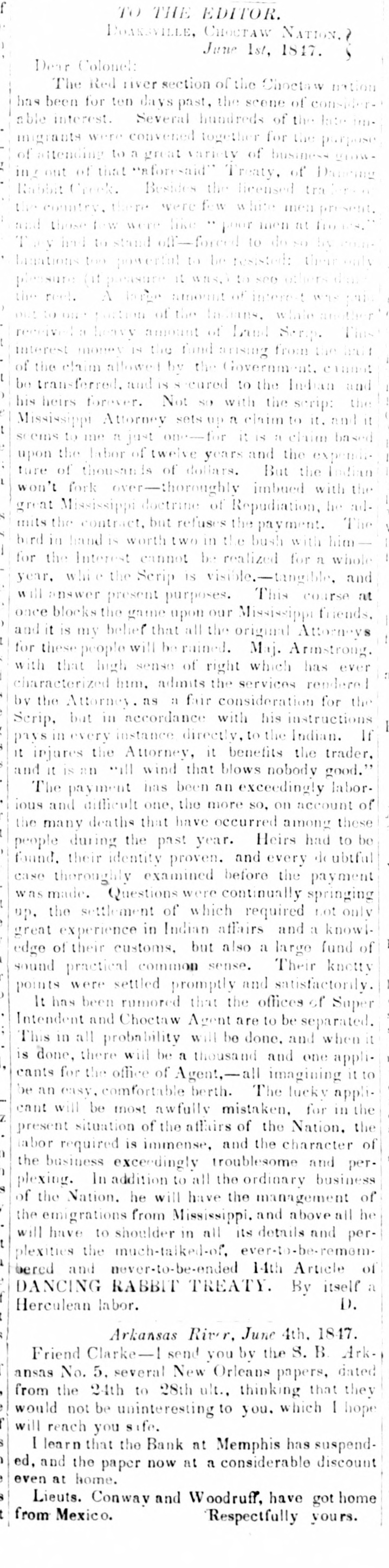 Dear Colonel: The Red river section of the Choctaw nation has been for ten days past, the scene of considerable interest. Several hundreds of the late the migrants were convened together for the purpose of attending to in great variety of business growing out of that "aforesaid" Treaty, of Dancing Rabbit Creek. Besides the licensed tra the country. there were few white men present. and those law were like poor men at fromes." T and to stand off-forced to dosso by Linations this powerful to be resisted: their will pleasure (if parasure it was. to see others day the reel. A large amount of interest was 201 DUE position of the Indians. while receive it heavy amount of Land Scrip. This 14 the fund arising from the had of claim allowed by the interest the money Government. cannot and be transferred. and 18 scured to the Indian his heirs forever. Not so with the scrip: the Mississippi Attorney sets up a claim to it. and it seems to me a just one-for it is it claim based upon the labor of twelve years and the expendithousands of dollars. But the Indian over-thoroughly won't ture of fork Repudiation, imbued with he ad. the great Mississippi doctrine of mits the contract. but refuses the payment. The bird in hand is worth two in the bush with him for the Interest cannot be realized for a whole year. whi e the Scrip is visible.-tangling and This at course will answer present purposes. once blocksthe game upon our Mississippi friends. and it is my belief that all the original Attorneys for these people will be rained. Maj. Armstrong. with that high sense of right which has ever characterized him. admits the services rendered the as a fair consideration for but in accordance with in instance directly. to the pays Scrip, by Attorney. every benefits his instructions Indian. the trader, the If it injures the Attorney, it and it is an ...ill wind that blows nobody good." The payment has been an exceedingly laborious and difficult one, the more so, on account of the many deaths that have occurred among these people during the past year. Heirs had to be found. their identity proven. and every de ubtful case thoroughly examined before the payment were continually springing the settlement of which in Indian affairs a great up. was made. experience Questions required and not fund knowl. only of edge of their customs. but also a large sound common sense. practical and satisfactorily. Their knotty points were settled promptly It has been rumored that the offices of Super Intendent and Choctaw Agent are to be separated. This in all probability will be done. and when it is done, there will be a thousand and one applicants for the office of Agent,-all imagining it to be an easy. comfortable berth. The lucky applicant will be most nwwfully mistaken, for in the present situation of the affairs of the Nation. the labor required is immense, and the character of the business exceedingly troublesome and perplexing. In addition to all the ordinary business of of the Nation. he will have the management he the emigrations from Mississippi. and above all will have to shoulder in all its details and perplexities the much-talked-of ever-to-be-remomen- of bered and never-to-be-ended 14th Article DANCING RABBIT TREATY. By itself D. a Herculean labor. Arkansas River. June 4th. 1847. Friend Clarke-1 send you by the S. B. dated Ark. No. 5. several New Orleans papers. ansas from the 24th to 28th ult.. thinking that they would not be uninteresting to you. which I hope will reach you sife. I learn that the Bank at Memphis has suspended. and the paper now at a considerable discount even at home. Lieuts. Conway and Woodruff, have got home from Mexico. Respectfully yours.