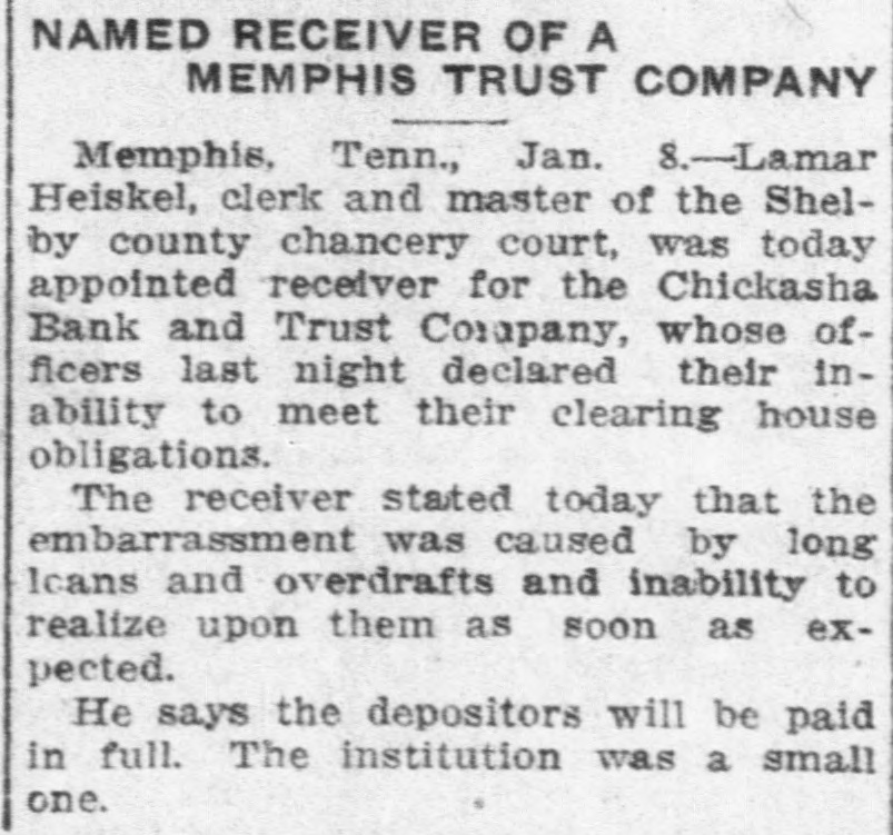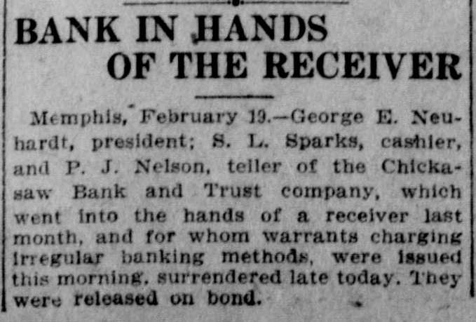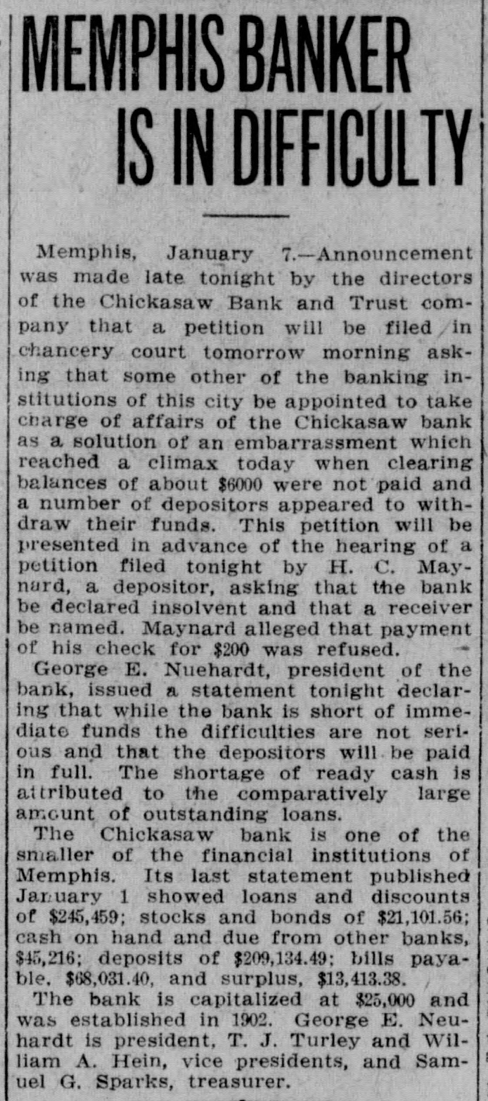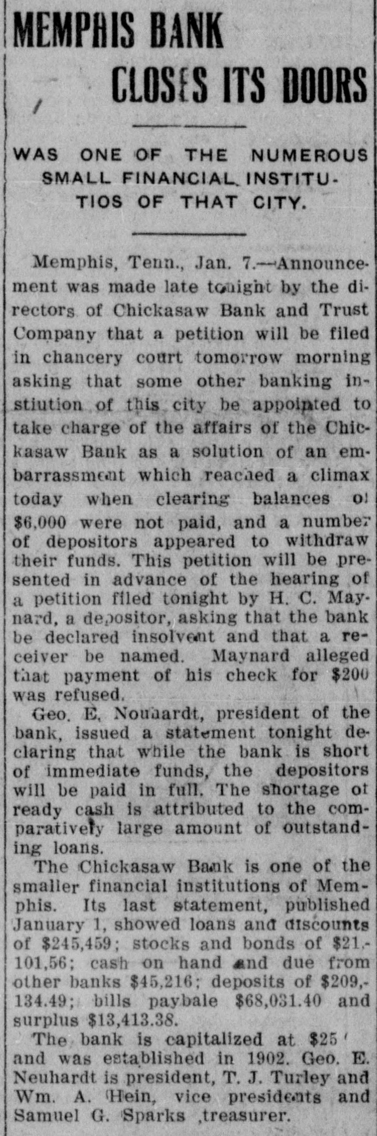 MEMPHIS BANKER IS IN DIFFICULTY Memphis, January 7.-Announcement was made late tonight by the directors of the Chickasaw Bank and Trust company that a petition will be filed / in chancery court tomorrow morning asking that some other of the banking institutions of this city be appointed to take charge of affairs of the Chickasaw bank as a solution of an embarrassment which reached a climax today when clearing balances of about $6000 were not paid and a number of depositors appeared to withdraw their funds. This petition will be presented in advance of the hearing of a petition filed tonight by H. C. Maynard, a depositor, asking that the bank be declared insolvent and that a receiver be named. Maynard alleged that payment of his check for $200 was refused. George E. Nuehardt, president of the bank, issued a statement tonight declaring that while the bank is short of immediate funds the difficulties are not serious and that the depositors will be paid in full. The shortage of ready cash is attributed to the comparatively large amount of outstanding loans. The Chickasaw bank is one of the smaller of the financial institutions of Memphis. Its last statement published January 1 showed loans and discounts of $245,459; stocks and bonds of $21,101.56; cash on hand and due from other banks, $45,216; deposits of $209,134.49; bills payable. $68,031.40, and surplus, $13,413.38. The bank is capitalized at $25,000 and was established in 1902. George E. Neuhardt is president, T. J. Turley and William A. Hein, vice presidents, and Samuel G. Sparks, treasurer.
