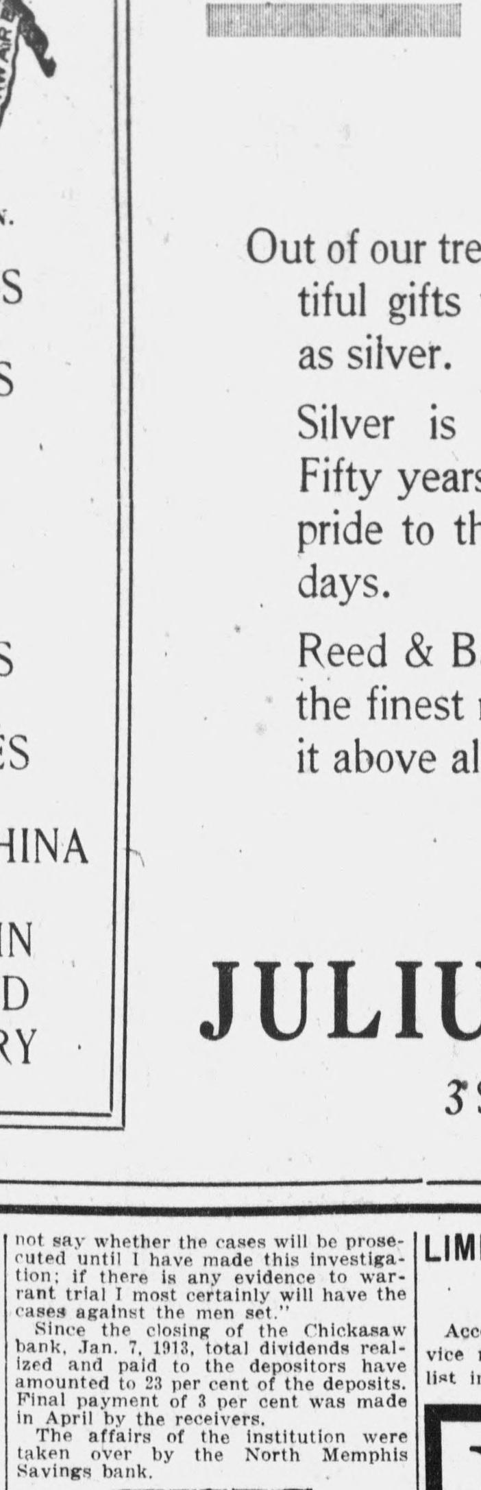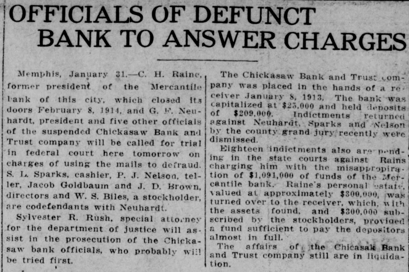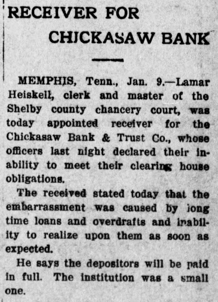 MEMPHIS BANKER IS IN DIFFICULTY Memphis, January 7.-Announcement was made late tonight by the directors of the Chickasaw Bank and Trust company that a petition will be filed / in chancery court tomorrow morning asking that some other of the banking institutions of this city be appointed to take charge of affairs of the Chickasaw bank as a solution of an embarrassment which reached a climax today when clearing balances of about $6000 were not paid and a number of depositors appeared to withdraw their funds. This petition will be presented in advance of the hearing of a petition filed tonight by H. C. Maynard, a depositor, asking that the bank be declared insolvent and that a receiver be named. Maynard alleged that payment of his check for $200 was refused. George E. Nuehardt, president of the bank, issued a statement tonight declaring that while the bank is short of immediate funds the difficulties are not serious and that the depositors will be paid in full. The shortage of ready cash is attributed to the comparatively large amount of outstanding loans. The Chickasaw bank is one of the smaller of the financial institutions of Memphis. Its last statement published January 1 showed loans and discounts of $245,459; stocks and bonds of $21,101.56; cash on hand and due from other banks, $45,216; deposits of $209,134.49; bills payable. $68,031.40, and surplus, $13,413.38. The bank is capitalized at $25,000 and was established in 1902. George E. Neuhardt is president, T. J. Turley and William A. Hein, vice presidents, and Samuel G. Sparks, treasurer.