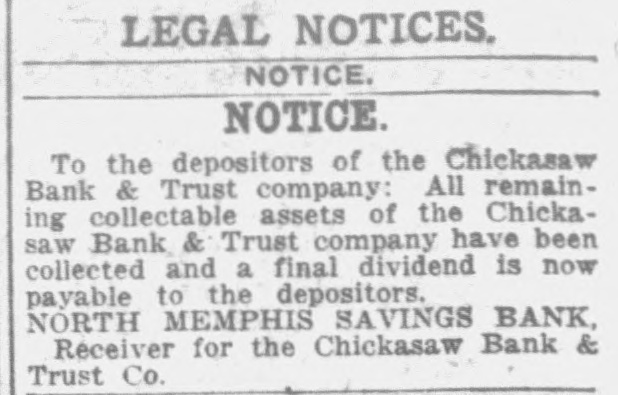 LEGAL NOTICES. NOTICE. NOTICE. To the depositors of the Chickasaw Bank & Trust company: All remaining collectable assets of the Chickasaw Bank & Trust company have been collected and a final dividend is now payable to the depositors. NORTH MEMPHIS SAVINGS BANK, Receiver for the Chickasaw Bank & Trust Co.