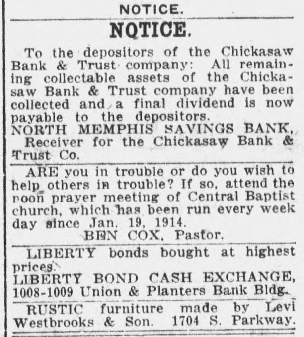 NOTICE. NOTICE. To the depositors of the Chickasaw Bank & Trust company: All remaining collectable assets of the Chickasaw Bank & Trust company have been collected and a final dividend is now payable to the depositors. NORTH MEMPHIS SAVINGS BANK, Receiver for the Chickasaw Bank & Trust Co. ARE you in trouble or do you wish to help others in trouble? If so, attend the noon prayer meeting of Central Baptist church, which has been run every week day since Jan. 19, 1914. BEN COX, Pastor. LIBERTY bonds bought at highest prices. LIBERTY BOND CASH EXCHANGE, 1008-1009 Union & Planters Bank Bldg. RUSTIC furniture made by Levi Westbrooks & Son. 1704 S. Parkway.