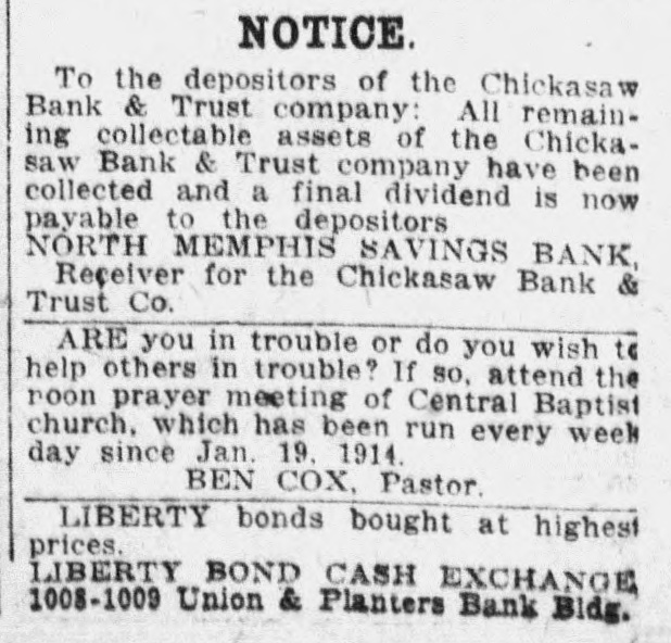 NOTICE. To the depositors of the Chickasaw Bank & Trust company: All remaining collectable assets of the Chickasaw Bank & Trust company have been collected and a final dividend is now payable to the depositors NORTH MEMPHIS SAVINGS BANK, Receiver for the Chickasaw Bank & Trust Co. ARE you in trouble or do you wish to help others in trouble? If so, attend the noon prayer meeting of Central Baptist church, which has been run every week day since Jan. 19. 1914. BEN COX, Pastor. LIBERTY bonds bought at highest prices. LIBERTY BOND CASH EXCHANGE 1008-1009 Union & Planters Bank Bldg.