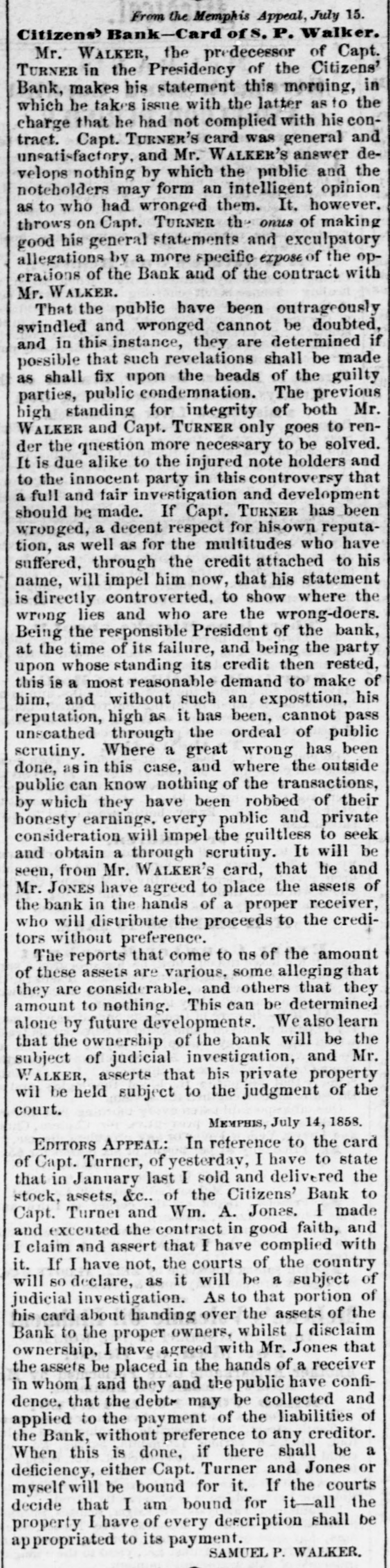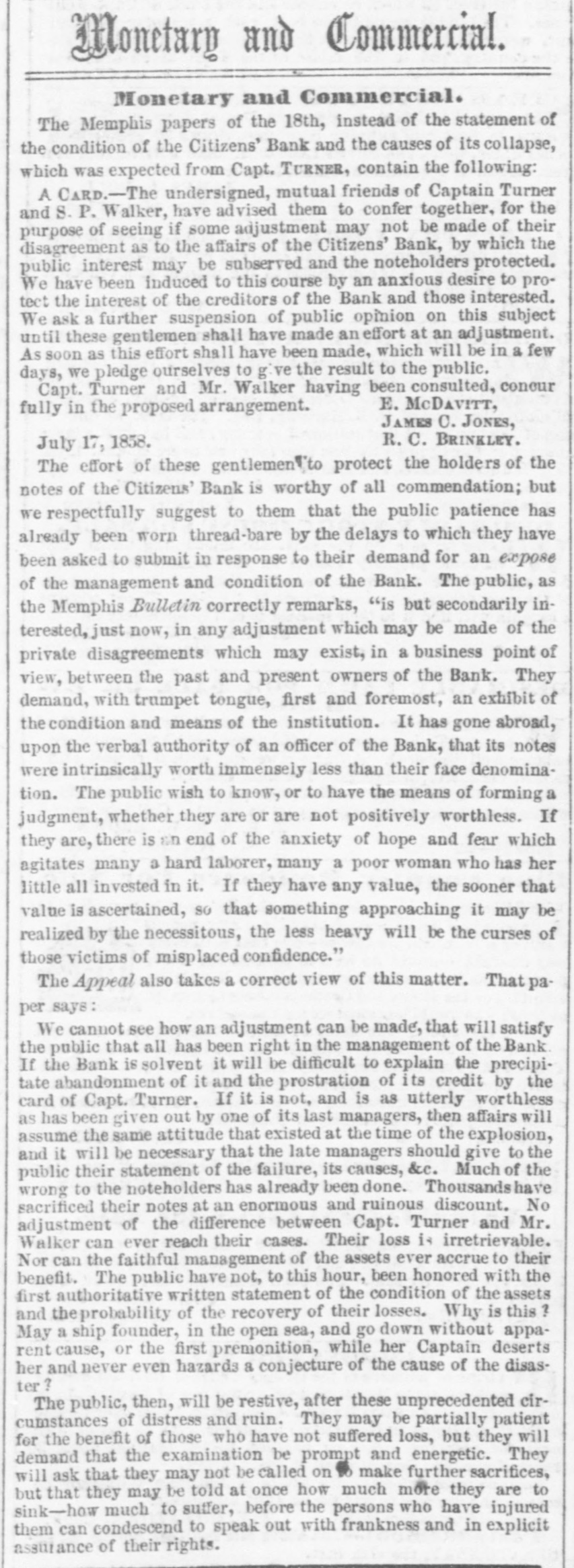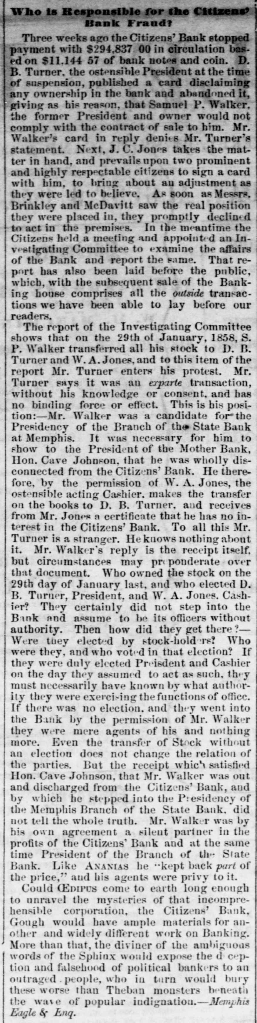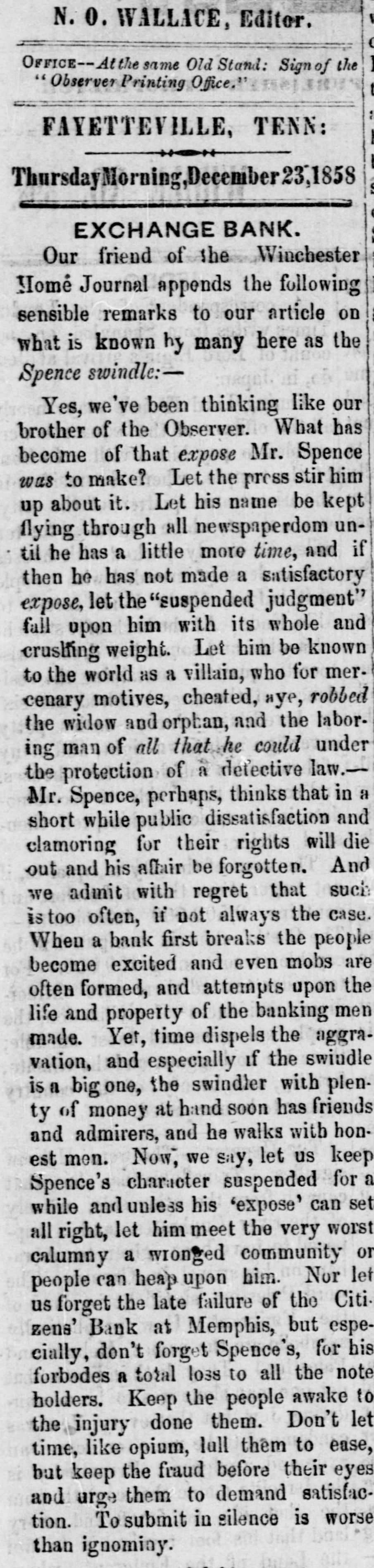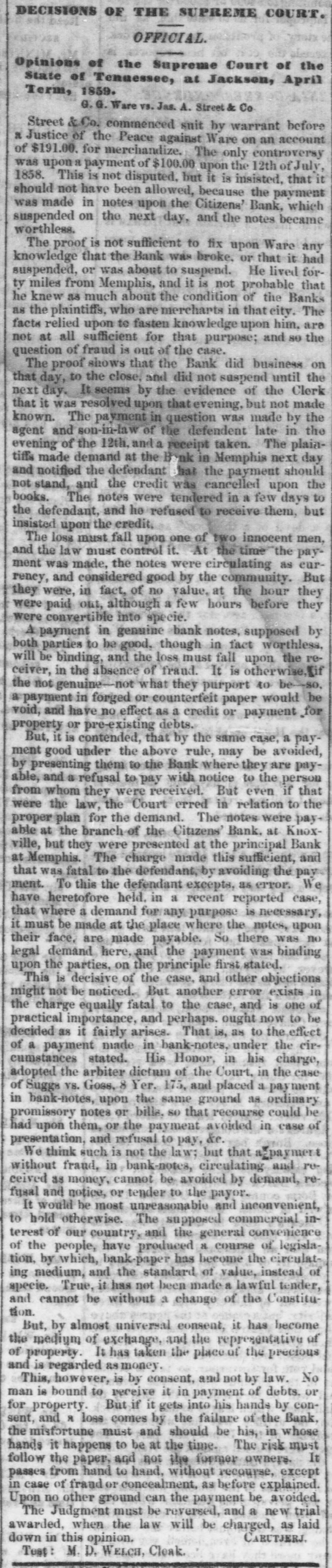 DECISIONS OF THE SUPREME COURT. OFFICIAL. Opinions of the Supreme Court of the State of Tennessee, at Jackson, April Term, 1859. G.G. Ware vs. Jas. A. Street & Co Street Co. commenced snit by warrant before a Justice of the Peace against Ware on an account of $191.00. for merchandize. The only controversy was upon a payment of $100.00 upon the 12th of July, 1858. This is not disputed. but it is insisted, that should not have been allowed, because the payment was made in notes upon the Citizens' Bank, which suspended on the next day, and the notes became worthless. The proof is not sufficient to fix upon Ware any knowledge that the Bank was broke. or that it had suspended, or was about to suspend. He lived forty miles from Memphis, and it is not probable that he knew as much about the condition of the Banks as the plaintiffs, who are mercharts in that city. The facts relied upon to fasten knowledge upon him. are not at all sufficient for that purpose; and so the question of fraud is out of the case. The proof shows that the Bank did business on that day, to the close, and did not suspend until the next day. It seems by the evidence of the Clerk that it was resolved upon that evening, but not made known. The payment in question was made by the agent and son-in-law of the defendent late in the evening of the 12th, and a receipt taken. The plaiatiffs made demand at the B nk in Memphis next day and notified the defendant hat the payment should the not stand, and the credit was cancelled upon books. The notes were tendered in a few days to the defendant, and he refused to receive them, but insisted upon the credit, The loss must fall upon one of two innocent men, and the law must control it. At the time the payment was made, the notes were circulating as eurreney, and considered good by the community. But they were, in fact, of no value, at the hour they were paid out, although a few hours before they were convertible into specie. A payment in genuine bank notes, supposed by both parties to be good. though in fact worthless, will be binding, and the loss must fall upon the receiver, in the absence of fraud. It is otherwise, if the not genuine not what they purport to be-so. be payment in forged or counterfeit paper would void, and have no effect as a credit or payment for property or pre-existing debts. But, it is contended, that by the same case, a payment good under the above rule, may be avoided, by presenting them to the Bank where they are payable, and a refusal to pay with notice to the person from whom they were received. But even if that were the law, the Court erred in relation to the proper ip for the demand. The notes were payable at the branch of the Citizens' Bank. at Knoxville, but were presented at the at The charge made this Memphis. they principal sufficient, Bank and that was fatal to the defendant, by avoiding the pay ment. To this the defendant excepts, as error. We have heretofore held. in a recent reported ease, that where a demand purpose is necessary, it must be made at the place where the notes, upon their face, are made payable. So there was no legal demand here. and the payment was binding upon the parties, on the principle first stated. This is decisive of the case, and other objections might not be noticed. But another error exists in the charge equally fatal to the case, and is one of practical importance, and perhaps. ought now to he decided as it fairly arises. That is, as to the effect cirof a payment made in bank-notes, under the cumstances stated. His Honor, in his charge, adopted the arbiter dietum of the Court, in the case of Suggs vs. Goss, 8 Yer. 175, and placed a payment in bank-notes, upon the same ground as ordinary promissory notes or bille, so that recourse could be of had upon them, OF the payment avoided in case presentation, and refusal to pay, &e We think such is not the law; but that a-payment without fraud, in bank-notes, circulating and re- received as money, cannot be avoided by demand, fusal and notice, or tender to the payor. It would be most unreasonable and inconvenient, hold otherwise. The supposed commercial interest to of our country, and the general convenience of the people, have produced 26 course of legisla tion, by which, bank-paper has become the circulat- of ing medium, and the standard of value, instead specie. True, it has net been made a lawful tender, and cannot be without a change of the Constitution. But, by almost universal consent, it has become of the medium of exchange, and the representative of property. It has taken the place of the precious and is regarded as money. This, however, is by consent, and not by law. No man is bound to receive it in payment of debts. or for property. But if it gets into his hands by consent, and R loss comes by the failure of the Bank, the misfortune must and should be his, risk in whose must hands it happens to be at the time. The follow the and not the former owners. It from hand to hand, without recourse, of fraud or concealment, passes in case paper, as before explained. avoided. except Upon no other ground can the payment be The Judgment must be reversed, and a new trial laid awarded, when the law will be charged, CARUTJERJ. as down in this opinion. Test M. D. WELCH, Cleak.