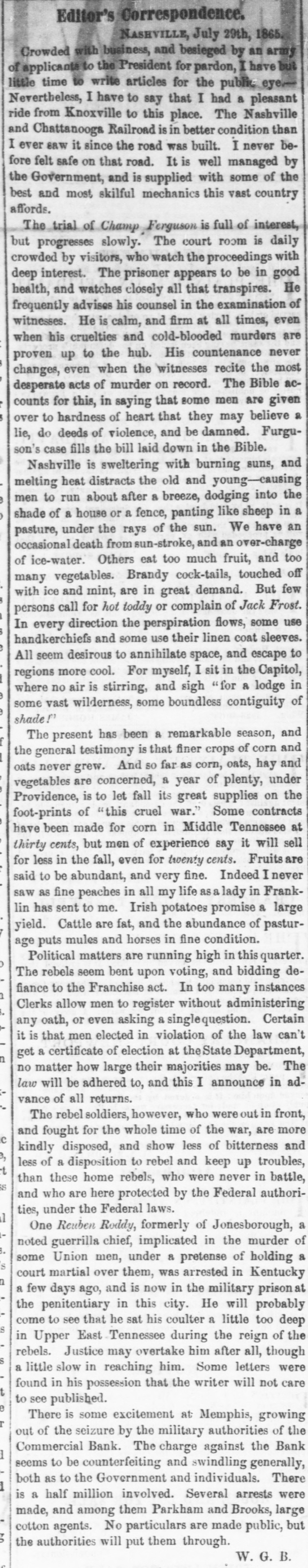 Editor's Correspondence. NASHVILLE, July 29th, 1865. Crowded with business, and besieged by an army of applicants to the President for pardon, I have but little time to write articles for the public eye Nevertheless, I have to say that I had a pleasant ride from Knoxville to this place. The Nashville and Chattanooga Railroad is in better condition than I ever saw it since the road was built. I never before felt safe on that road. It is well managed by the Government, and is supplied with some of the best and most skilful mechanics this vast country affords. The trial of Champ Ferguson is full of interest, but progresses slowly. The court room is daily crowded by visitors, who watch the proceedings with deep interest. The prisoner appears to be in good health, and watches closely all that transpires. He frequently advises his counsel in the examination of witnesses. He is calm, and firm at all times, even when his cruelties and cold-blooded murders are proven up to the hub. His countenance never changes, even when the witnesses recite the most desperate acts of murder on record. The Bible accounts for this, in saying that some men are given over to hardness of heart that they may believe a lie, do deeds of violence, and be damned. Furguson's case fills the bill laid down in the Bible. Nashville is sweltering with burning suns, and melting heat distracts the old and young-causing men to run about after a breeze, dodging into the shade of a house or a fence, panting like sheep in a pasture, under the rays of the sun. We have an occasional death from sun-stroke, and an over-charge of ice-water. Others eat too much fruit, and too many vegetables. Brandy cock-tails, touched off with ice and mint, are in great demand. But few persons call for hot toddy or complain of Jack Frost. In every direction the perspiration flows, some use handkerchiefs and some use their linen coat sleeves. All seem desirous to annihilate space, and escape to regions more cool. For myself, I sit in the Capitol, where no air is stirring, and sigh "for a lodge in some vast wilderness, some boundless contiguity of shade!" The present has been a remarkable season, and the general testimony is that finer crops of corn and oats never grew. And SO far as corn, oats, hay and vegetables are concerned, a year of plenty, under Providence, is to let fall its great supplies on the foot-prints of "this cruel war." Some contracts have been made for corn in Middle Tennessee at thirty cents, but men of experience say it will sell for less in the fall, even for twenty cents. Fruits are said to be abundant, and very fine. Indeed I never saw as fine peaches in all my life as a lady in Franklin has sent to me. Irish potatoes promise a large yield. Cattle are fat, and the abundance of pasturage puts mules and horses in fine condition. Political matters are running high in this quarter. The rebels seem bent upon voting, and bidding defiance to the Franchise act. In too many instances Clerks allow men to register without administering any oath, or even asking a singlequestion. Certain it is that men elected in violation of the law can't get a certificate of election at the State Department, no matter how large their majorities may be. The law will be adhered to, and this I announce in advance of all returns. The rebel soldiers, however, who were out in front, and fought for the whole time of the war, are more kindly disposed, and show less of bitterness and less of a disposition to rebel and keep up troubles, than these home rebels, who were never in battle, and who are here protected by the Federal authorities, under the Federal laws. One Reuben Roddy, formerly of Jonesborough, a noted guerrilla chief, implicated in the murder of some Union men, under 8 pretense of holding a court martial over them, was arrested in Kentucky a few days ago, and is now in the military prison at the penitentiary in this city. He will probably come to see that he sat his coulter a little too deep in Upper East Tennessee during the reign of the rebels. Justice may overtake him after all, though a little slow in reaching him. Some letters were found in his possession that the writer will not care to see published. There is some excitement at Memphis, growing out of the seizure by the military authorities of the Commercial Bank. The charge against the Bank seems to be counterfeiting and swindling generally, both as to the Government and individuals. There is a half million involved. Several arrests were made, and among them Parkham and Brooks, large cotton agents. No particulars are made public, but the authorities will put them through. W. G. B.