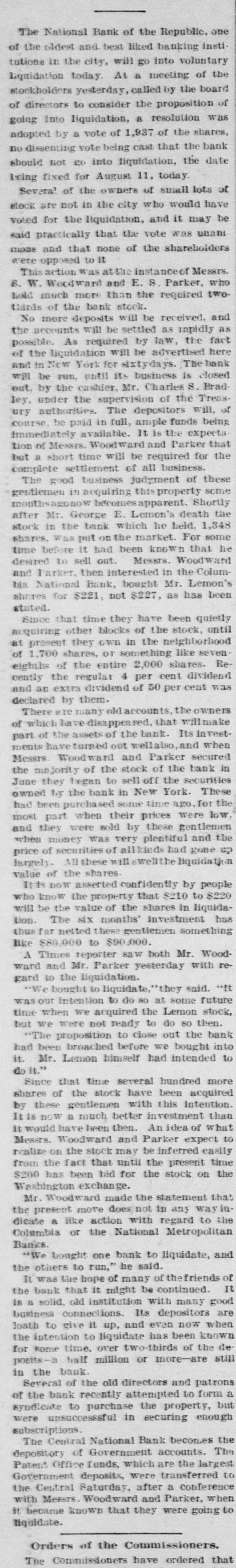 The National Bank of the Republic, one of the oldest and best liked banking institutions in the city, will go into voluntary Liquidation today. At a meeting of the stockholders yesterday, called by the board of directors to consider the proposition of going into liquidation, a resolution was adopted by a vote of 1,937 of the shares, no dissenting vote being cast that the bank should not go into liquidation, the date being fixed for August 11, today. Several of the owners of small lots of stock are not in the city who would have voted for the liquidation, and it may be said practically that the vote was unani mous and that none of the shareholders were opposed to it This action was at the instanceof Messrs. S. W. Woodward and E. S. Parker, who hold much more than the required twothirds of the bank stock. No more deposits will be received, and the accounts will be settled as rapidly as possible. As required by law, the fact of the liquidation will be advertised here and in New York for sixtydays. The bank will be run, until its business is closed out, by the cashier, Mr. Charles S. Bradley, under the supervision of the Treasury authorities. The depositors will, of course, be paid in full, ample funds being immediately available. It is the expectation of Messrs. Woodward and Parker that but a short time will be required for the complete settlement of all business. The good business judgment of these gentlemen in acquiring this property some monthsagonow becomes apparent. Shortly after Mr. George E. Lemon's death the stock in the bank which he held, 1,348 shares, Was put on the market. For some time before it had been known that he desired to sell out. Messrs. Woodward and Parker, then interested in the Columbia National Bank, bought Mr. Lemon's shares for $221, not $227, as has been stated. Since that time they have been quietly acquiring other blocks of the stock, until at present they own in the neighborhood of 1,700 shares, OT something like seveneighths of the entire 2,000 shares. Recently the regular 4 per cent dividend and an extra dividend of 50 per cent was declared by them. There are many old accounts, the owners of which have disappeared, that willmake part of the assets of the bank. Its investments have turned out wellalso, and when Messrs. Woodward and Parker secured the majority of the stock of the bank in June they began to sell off the securities owned by the bank in New York. These had been purchased some time ago, for the most part when their prices were low. and they were sold by these gentlemen when money was very plentiful and the price of securities of allkinds had gone up largely. All these will swellthe liquidation value of the shares. It Is now asserted confidently by people who know the property that $210 to $220 will be the value of the shares in liquidation. The six months' investment has thus far netted these gentlemen something like $80,000 to $90,000. A Times reporter saw both Mr. Woodward and Mr. Parker yesterday with regard to the liquidation. "We bought to liquidate, said. "It was our intention to do SO at some future time when we acquired the Lemon stock, but we were not ready to do SO then. "The proposition to close out the bank had been broached before we bought into it. Mr. Lemon bimself had intended to do it." Since that time several hundred more shares of the stock have been acquired by these gentlemen with this intention. It is now a much better investment than it would have been then. An idea of what Messrs. Woodward and Parker expect to realize on the stock may be inferred easily from the fact that until the present time $200 has been bid for the stock on the Washington exchange. Mr. Woodward made the statement that the present move does not in any way indicate a like action with regard to the Columbia or the National Metropolitan Banks. We bought one bank to liquidate, and the others to run," he said. It was the hope of many of the friends of the bank that it might be continued. It is a solid, old institution with many good business connections. Its depositors are loath to give it up, and even now when the intention to liquidate has been known for some time. over two-thirds of the de posits-a half million or more-are still in the bank. Several of the old directors and patrons of the bank recently attempted to form a syndicate to purchase the property, but were unsuccesssful in securing enough