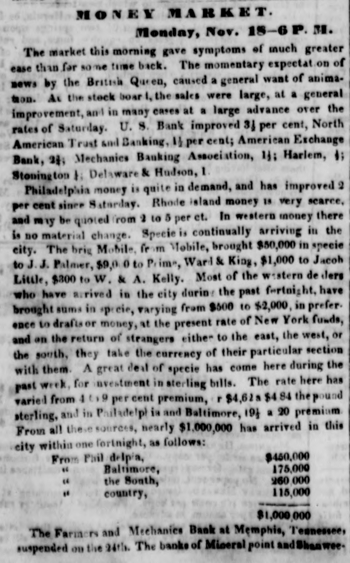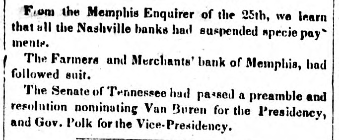 # BANK CONVENTION. At meeting of the delegates from the Banks of Mississippi and Tennessee, convened at the Commercial & Rail Road Bank of Vicksburg, the following Banks were represented, viz: Farmers & Mechanics Bank of Memphis; Planters Bank, Natchez; Agricultural Bank, Commercial & Rail Road Bank of Vicksburg, West Feliciana Rad Road & Banking Company, Commercial Bank of Natchez, Commercial Bank of Manchester, Commercial Bank of Rodney, Bank of Lexington, Vicksburg Waterworks & Banking Company, Mississippi Rail Road Company, Citizens Bank of Madison County, Mississippi Union Bank, Real Estate Banking Company of Hinds County, Bank of Vicksburg. On motion, H G Runnels was called to the Chair, and J J Chewning was appointed Secretary. On motion, Resolved, That Messers. J Wood and George G Skipwith of Nashville, be invited to take a seat in this Convention. The following resolutions was offered by Stephen Duncan: Resolved, That the first monday in January next be the period fixed on for a resumption of specie payments by the Banks represented in this Convention; provided the delegates from the Union Bank of Mississippi will give assurance that the post notes of that Bank will be redeemed with specie, or its equivalent, when presented at her counter. On motion to strike out all after the word "provided," the yeas and nays being called, the vote stood thus; Ayes. E Montgon.ery, of Planters Bank; M B Irmer, Commercial Bank of Manchester; J C Bole, Lexington Bank; S P Webster, Vicksburg W W & Banking Co; J A Quitman, Miss. R R Co; W Hardeman, Citizens Bank of Madison county; H G Runnels and R M Williamson, Mississippi Union Bank. Nays-E W Lucas, of Famers and Mechanics Bank, Memphis; S Duncan, Agricultural Bank, J J Chewning, Com. & R R Bank of Vicksburg; G H Gordon, West Feliciana R R & Banking Co; L R Marshall, Com. Bank of Natchez; Thos. Freeland, Com, Bank of Rodney; A M Paxton, Bank of Vicksburg. This being a tie, the motion was lost. S P Webster proposed to strike out all the above resolutions, after the word "resolved," and proposed the following as a substitute: Whereas, in the opinion of this Convention, a resumption of specie payments by the Banks of Mississippi on the first day of January next, would be prejudicial to the interest of the community, for the following, among other reasons: 1. Because the month of January is the middle of the business season, and the period of the year when both planter and merchant stand in most need of all the bank facilities which can be afforded them. 2. Because it is the season of the year at which the largest amount of engagements have usually been made to fall due, and causes the months of January and February, in ordinary times, to be seasons of peculiar pressure in the money market. 3. Because the engagements maturing in January and February have, to a considerable extent, been passed to foreign creditors, and would immediately be demanded in specie or Eastern exchange. 4. Because of the present high rate of exchange against this state, in which condition a resumption of specie payments is unprecedented in any state of nation. The recent resumption in New York not being made until exchange had been for a period of two months in their favor, and in Philadelphia not until five months after that condition of things existed and at a time when the importation of specie by the banks of those places was a business of profit. 5. Because a resumption in January would cause the whole bank note circulation of the State to come in upon the banks, and leave the state without a circulating medium at all, to the great detriment of trade, and to the utter ruin of all who have money to pay at our spring courts, or provisions to purchase for the coming season. 6. Because it would be a burden of from 2 to 5 percent. of their whole circulation, upon the resuming banks without corresponding benefit to any class of persons, other than the Northen holders of our circulation, who have purchased it on speculation at from 15 to 40 percent discount.