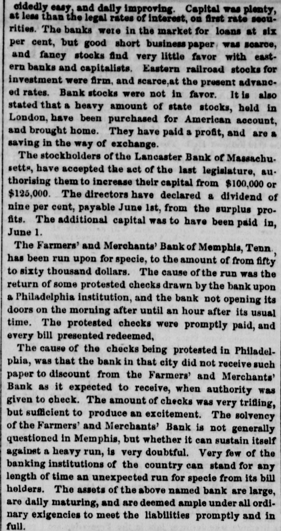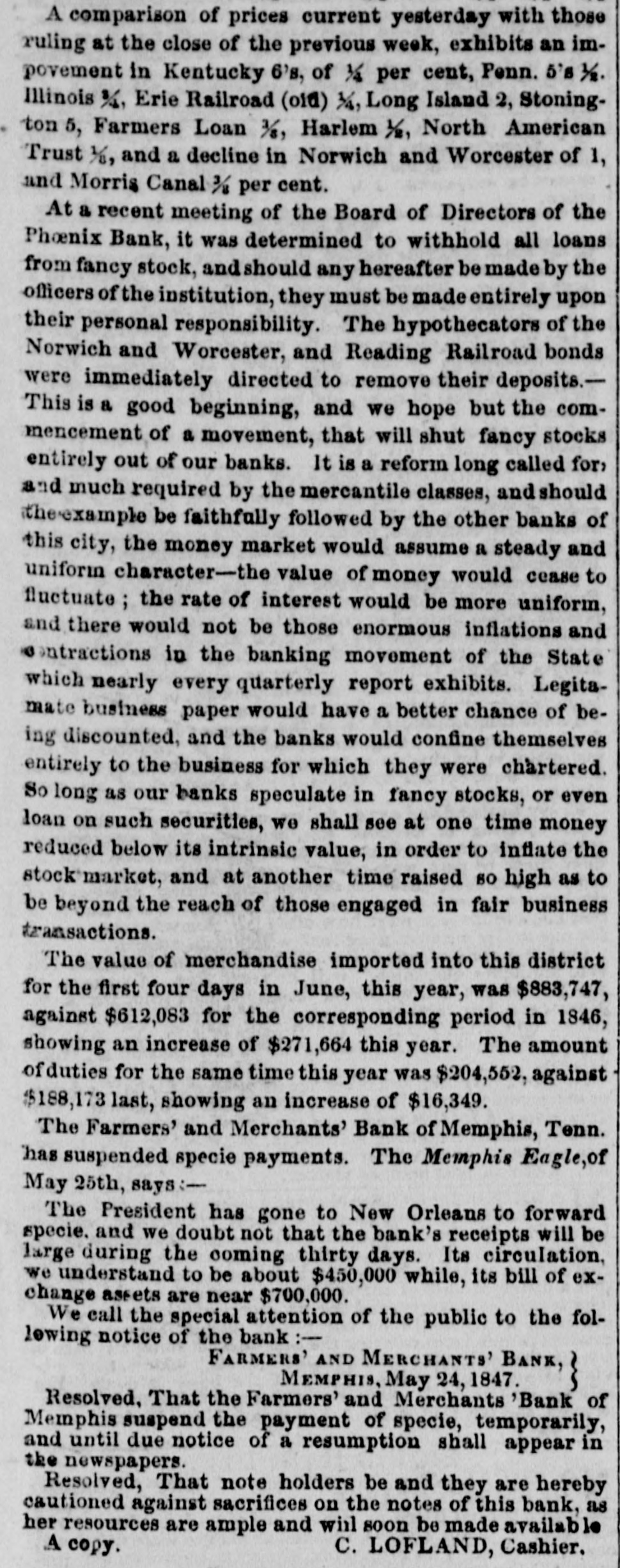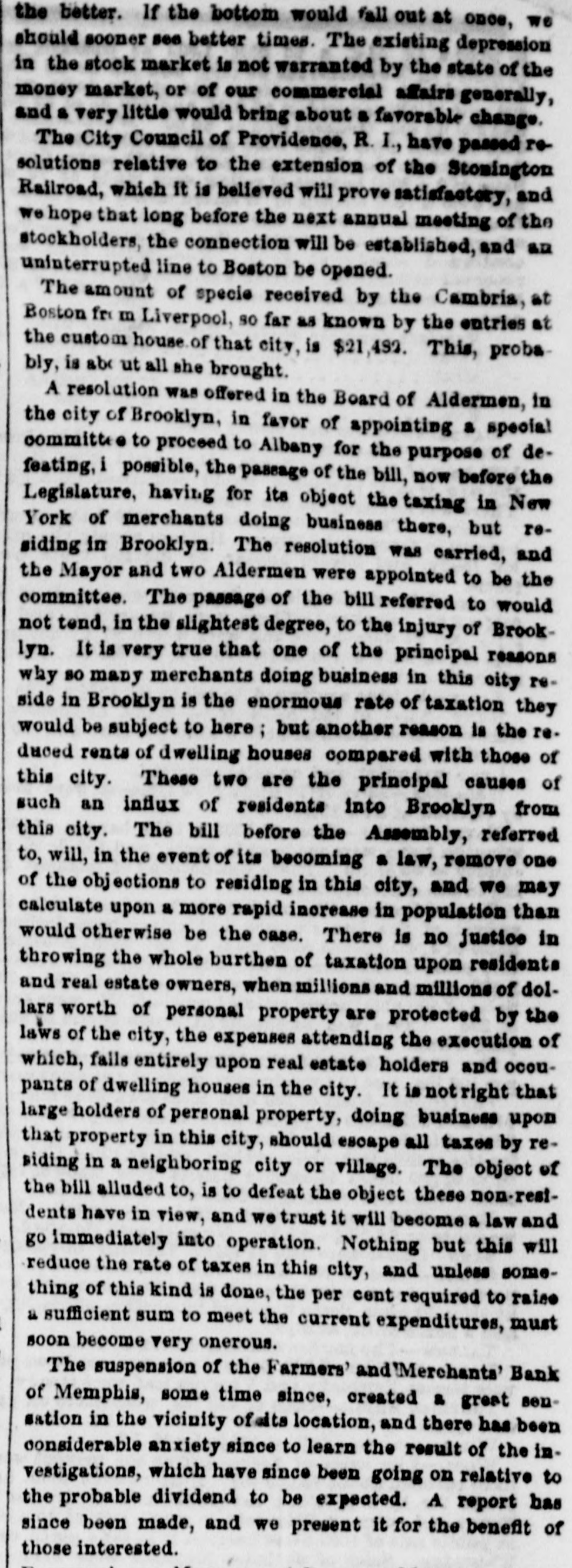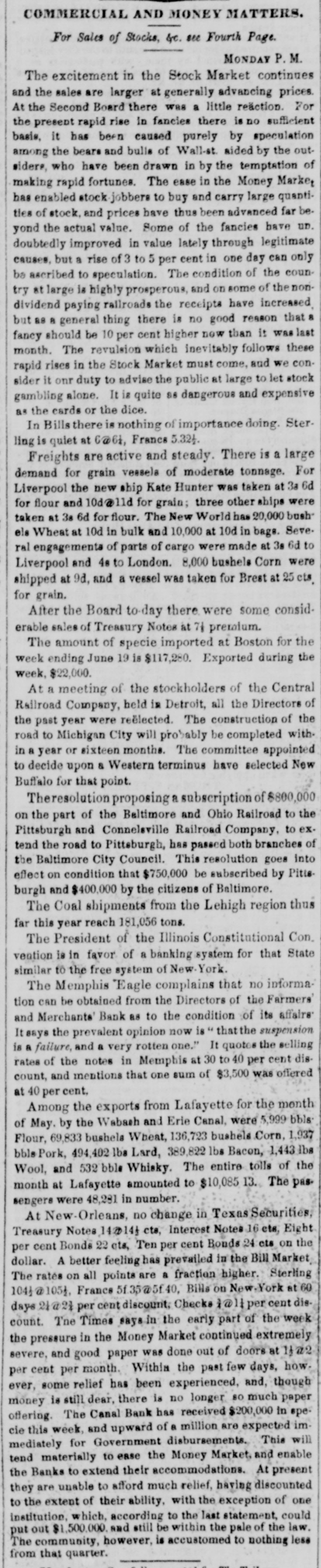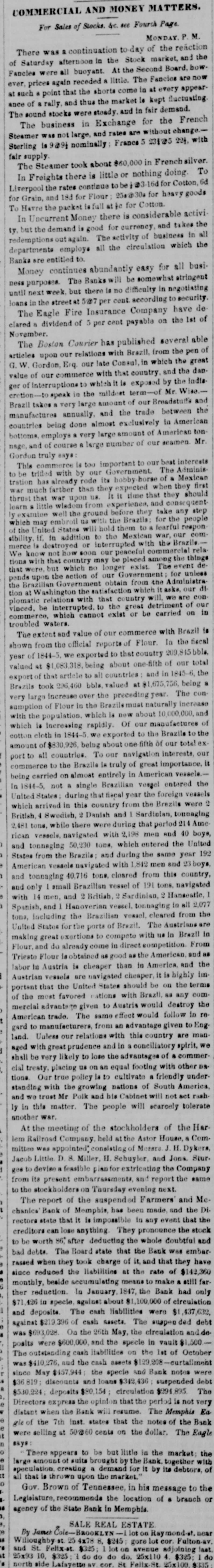 COMMERCIAL AND MONEY MATTERS. For Sales of Stocks. sc see Fourch Page MONDAY P M. There was continuation to-day of the reaction the of Saturday afternoon in the Stock market, and Fancles were all buoyant. At the Second Board, bow. ever, prices again receded little. The Fancies are now at such point that the shorts come in at every appearance of rally, and thus the market is kept fluctuating The sound stocks were steady. and in fair demand. The business in Exchange for the French Steamer was not large, and rates are without change.- with Sterling is 9@9 nominally France 5 23105 22, fair supply The Steamer took about $60,000 in French silver. To Freights there is little or nothing doing. Liverpool In rates continue to be for Cotton, goods 6d for Grain, and 18d for Flour; 25.@30 for heavy To Havre the packet is full atte for Cotton In Uncurrent Money there is considerable activi- the ty but the demand is good for currency and takes all redemptions again. The activity of business in the departments employe all the circulation which Banks are entitled to. Money continues abundantly easy for all busipurposes. The Banks will be somewhat stringent until ness next week. but there is no difficulty in negotiating loans in the street at 5@7 per cent according to security de The Eagle Fire Insurance Company have of clared dividend of per cent payable on the 1st November The Boston Courier has published several able articles our relations with Brazil, from the pen of upon late Consul in which the great G.W. Gordon, Erq. our the dan value of our commerce with that country. and India ger of Interruptions! which It is exposed by the Wise.eretion-to epeak in the mildest term-of Mr. Brazil takes very large amount of our Breadstuffs and the manufactures annually, and the trade between countries being done almost exclusively to American bottoms, employs very large amount of American Mr ton nage, and of course large number of our seamen Gordon truly says: This commerce is too important to our The best Adminis interests be trided with by our Government. Mexican tration to already rode its hobby-horse when they first much farther than they expected should thrust upon It it time that they quent wisdom from experience, and consee ly examine well the ground before they take for the any people step Brazila: the with embroil United which may States will hold them fearful respon the If. in addition to the Mexican war, our comability merce destroyed or interrupted with the Brazile rela We how soon our peaceful commercial things that country may be placed among de tions exist The event which no longer that action of our Government for unless pends the Government obtain from the Administra the Brazilian Washington the satisfaction which con tion with that country plomatic be relations interrupted. to the great detriment of our in vinced. commerce which cannot exist or be carried on troubled waters. The extent and value of our commerce with Brazil is shown from the official reports Flour. In the fiscal year 1844-5, we exported to country 209,845 bble valued $1,083,318 being about one-fifth of our total exporto est article all countries and in 1845-6, Brazils took 296,460 bbla. valued at $1,675,756, belog very large Increase over the preceding year. The consumption of Flour in the Brazilamus naturally increase and with the population. which is new about 10,000,000, of which is Increasing rapidly. Of our manufactures 1844-5 exported to the Brazile to the amount $830,926 being about of our total port to countries. To our navigation interests our commerce the Brazile is truly of great importance. it being carried on almost entirely in American vessels. la 1844-5, not a single Brazilian vessel entered the United States during that fiscal year the foreign vessels which arrived in this country from the Brazile were 2 British, Swedish, 2 Danish and Sardinian, tonuaging 2,481 there were during that period 214 Ame rican vessels, navigated with 2,198 men and 40 boys, and tonnaging 50,230 tons. which entered the United States from the Brazile: and during the same year 192 American vessele navigated with men and 23 boys, and tonnaging 40,716 tons. cleared from this country, only small Brazilian vessel of 191 tons. navigated with 14 men, and British, Sardinian, 2 Hansestle, Spanish, and Hanoverian vessel. tonuaging in all 2,077 tons, including the Brazilian vessel. cleared from the United States for the ports of Brazil. The Austrians are in making great exertions to compete with us in Brazil Flour. and do already come in direct competition. From Trieste Flour is obtained as good as the American and labor to Austria is cheaper than in America. and the Austrian vessels are navigated cheaper, it is highly in portant the United States should be on the terms of the most favored nations with Brazil, as any commercial advantage given to Austria would destroy the American trade. The same effect would follow in re gard to manufacturers, from an advantage given to Eng land. Ualess our relations with this country are man aged with great prudence and in conciliatory spirit, we shall be very likely to lose the advantages of a commer cial treaty, placing us on an equal footing with other D& tions Our true polley to cultivate a friendly under standing with the growing nations of South America, and we trust Mr Polk and his Cabinet will not act rash ly in this matter. The people will scareely tolerate another war. At the meeting of the stockholders of the Har lem Railroad Company held at the Astor House, a Com mittee was appointed* consisting of Messro J H. D kers, Jacob Little D.S. Miller, H. Schuyler. and Jona. Stur. gas devise feasible plan for extricating the Company from its present embarraasments, and report the same to the stockholders on Thursday evening next. The report of the suspended Farmers' and Mechanica' Bank of Memphis, has been made and the Directors state that it is impossible in any event that the creditors anything. They pronounce 