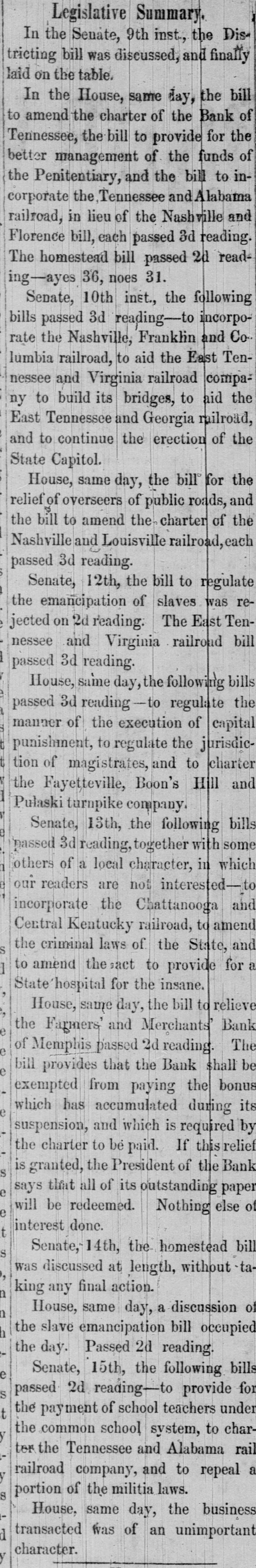 Legislative Summary. In the Senate, 9th inst, the Districting bill was discussed, and finally laid on the table. In the House, same day, the bill to amend the charter of the Bank of Tennessee, the bill to provide for the better management of the funds of the Penitentiary, and the bill to incorporate the Tennessee and Alabama railroad, in lieu of the Nashville and Florence bill, each passed 3d reading. The homestead bill passed 2d reading-ayes 36, noes 31. Senate, 10th inst., the following bills passed 3d reading-to incorporate the Nashville, Franklin and Co lumbia railroad, to aid the East Tennessee and Virginia railroad company to build its bridges, to aid the East Tennessee and Georgia milroad, and to continue the erection of the State Capitol. House, same day, the bill for the relief of overseers of public roads, and the bill to amend the charter of the Nashville and Louisville railroad, each passed 3d reading. Senate, 12th, the bill to regulate rethe emancipation of slaves was jected on 2d reading: The East Tennessee and Virginia railroad bill passed 3d reading. House, same day, the following bills passed 3d reading- regulate the manner of the execution of capital punishment, to regulate the jurisdiction of magistrates, and to charter the Fayetteville, Boon's Hill and Pulaski turnpike company. Senate, 13th, the following bills 'passed 3d reading, together with some others of a local character, in which our readers are not interested-to incorporate the Chattanooga and Central Kentucky railroad, to amend the criminal laws of the State, and to amend the ract to provide for a State hospital for the insane. House, same day, the bill to relieve the Farmers' and Merchants Bank The of Memphis passed 2d reading be bill provides that the Bank shall exempted from paying the bonus which has accumulated during its suspension, and which is required by the charter to bé paid. If this relief is granted, the President of the Bank says that all of its outstanding paper e will be redeemed. Nothing else of e interest done. t Senate, 14th, the homestead bill was discussed at length, without ta , king any final action. n House, same day, a discussion of n the slave emancipation bill occupied h the day. Passed 2d reading. Senate, 15th, the following bills e S passed 2d reading-to provide for the payment of school teachers under t the common school system, to charter the Tennessee and Alabama rail a railroad company, and to repeal portion of the militia laws. S House, same day, the business transacted was of an unimportant d character.