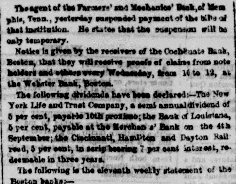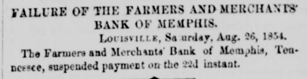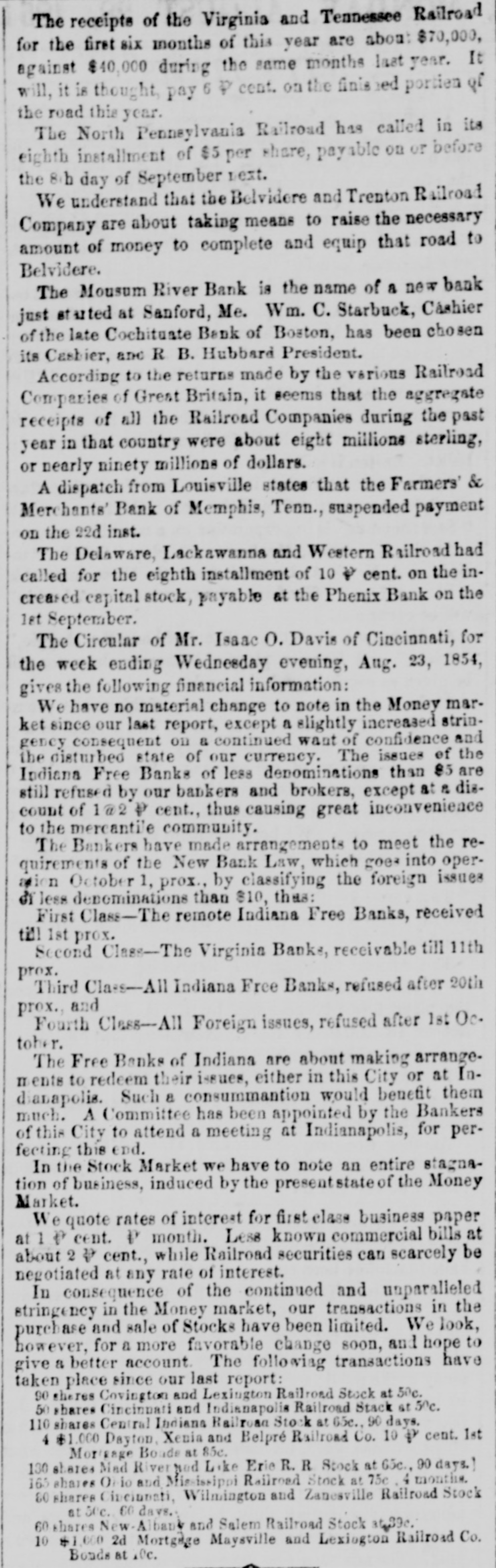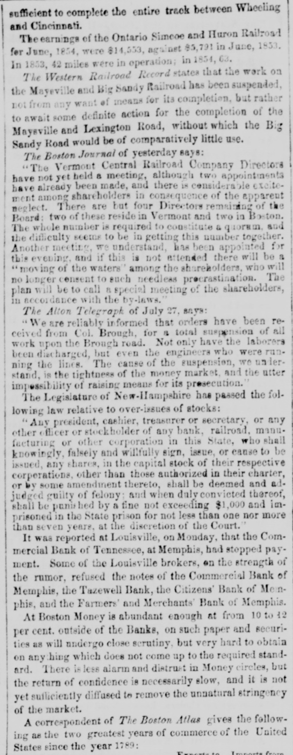 sufficient to complete the entire track between Wheeling and Cincinnati. The earnings of the Ontario Simcoe and Huron Railroad for June, 1854, were $14,553, against $5,791 in June, 1853. In 1853, 42 miles were in operation; in 1854, 63. The Western Railroad Record states that the work on the Maysville and Big Sandy Railroad has been suspended, not from any want of means for its completion, but rather to await some definite action for the completion of the Maysville and Lexington Road, without which the Big Sandy Road would be of comparatively little use. The Boston Journal of yesterday says: "The Vermont Central Railroad Company Directors have not yet held a meeting, although two appointments have already been made, and there is considerable excitement among shareholders in consequence of the apparent neglect. There are but four Directors remaining of the Board: two of these reside in Vermont and two in Boston. The whole number is required to constitute & quoram, and the difficulty seems to be in getting this number together. Another meeting, we understand, has been appointed for this evening, and if this is not attended there will be a "moving of the waters" among the shareholders, who will no longer censent to such needless precrastination. The plan will be to call a special meeting of the shareholders, in accordance with the by-laws." The Alton Telegraph of July 27, says: "We are reliably informed that orders have been received from Col. Brough, for & total suspension of all work upon the Brough road. Not only have the laborers been discharged, but even the engineers who were running the lines. The cause of the suspension, we understand, is the tightness of the money market, and the utter impossibility of raising means for its presecution." The Legislature of New-Hampshire has passed the following law relative to over-issues of stocks: "Any president, cashier, treasurer or secretary, or any other officer or stockholder of any bank, railroad, manufacturing or other corporation in this State, who shall knowingly, falsely and willfully sign, issue, or cause to be issued, any shares, in the capital stock of their respective corperations, other than those authorized in their charter, or by some amendment thereto, shall be deemed and adjudged guilty of felony; and when duly convicted thereof, shall be punished by a fine not exceeding $1,000 and imprisoned in the State prison for not less than one nor more than seven years, at the discretion of the Court." It was reported at Louisville, on Monday, that the Commercial Bank of Tennessee, at Memphis, had stopped payment. Some of the Louisville brokers, en the strength of the rumor, refused the notes of the Commercial Bank of Memphis, the Tazewell Bank, the Citizens' Bank of Memphis, and the Farmers' and Merchants' Bank of Memphis. At Boston Money is abundant enough at from 10 to 12 per cent. outside of the Banks, on such paper and securities as will undergo close scrutiny, but very hard to obtain on any thing which does not come up to the required standard. There is less alarm and distrust in Money circles, but the return of confidence is necessarily slow, and it is not yet sufficiently diffused to remove the unnatural stringency of the market. A correspondent of The Boston Atlas gives the following as the two greatest years of commerce of the United States since the year 1789: Fenertato Imports from