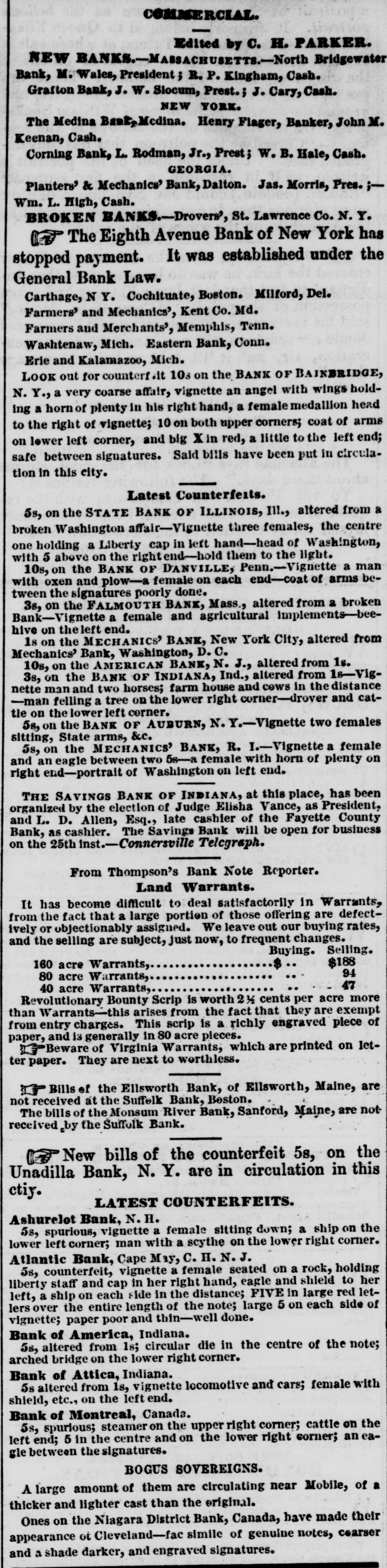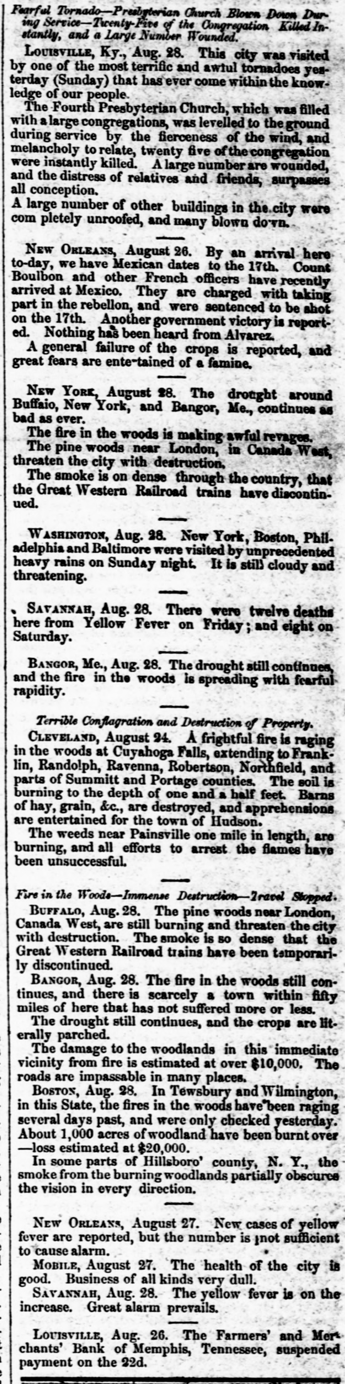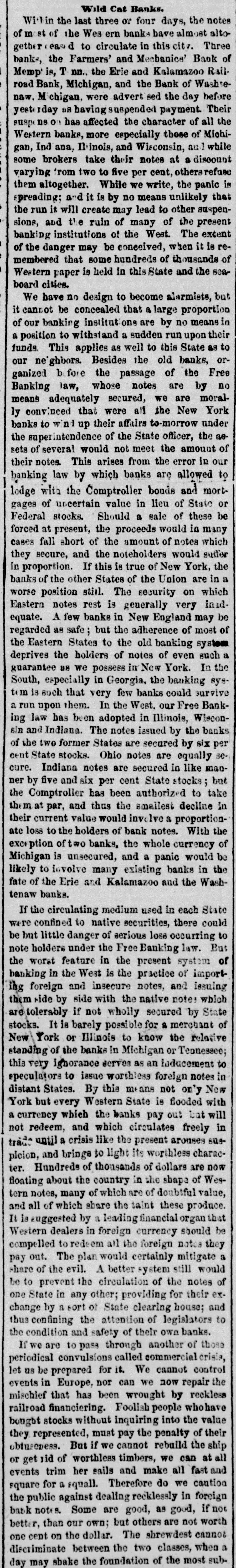 sufficient to complete the entire track between Wheeling and Cincinnati. The earnings of the Ontario Simcoe and Huron Railroad for June, 1854, were $14,553, against $5,791 in June, 1853. In 1853, 42 miles were in operation; in 1854, 63. The Western Railroad Record states that the work on the Maysville and Big Sandy Railroad has been suspended, not from any want of means for its completion, but rather to await some definite action for the completion of the Maysville and Lexington Road, without which the Big Sandy Road would be of comparatively little use. The Boston Journal of yesterday says: "The Vermont Central Railroad Company Directors have not yet held a meeting, although two appointments have already been made, and there is considerable excitement among shareholders in consequence of the apparent neglect. There are but four Directors remaining of the Board: two of these reside in Vermont and two in Boston. The whole number is required to constitute & quoram, and the difficulty seems to be in getting this number together. Another meeting, we understand, has been appointed for this evening, and if this is not attended there will be a "moving of the waters" among the shareholders, who will no longer censent to such needless precrastination. The plan will be to call a special meeting of the shareholders, in accordance with the by-laws." The Alton Telegraph of July 27, says: "We are reliably informed that orders have been received from Col. Brough, for & total suspension of all work upon the Brough road. Not only have the laborers been discharged, but even the engineers who were running the lines. The cause of the suspension, we understand, is the tightness of the money market, and the utter impossibility of raising means for its presecution." The Legislature of New-Hampshire has passed the following law relative to over-issues of stocks: "Any president, cashier, treasurer or secretary, or any other officer or stockholder of any bank, railroad, manufacturing or other corporation in this State, who shall knowingly, falsely and willfully sign, issue, or cause to be issued, any shares, in the capital stock of their respective corperations, other than those authorized in their charter, or by some amendment thereto, shall be deemed and adjudged guilty of felony; and when duly convicted thereof, shall be punished by a fine not exceeding $1,000 and imprisoned in the State prison for not less than one nor more than seven years, at the discretion of the Court." It was reported at Louisville, on Monday, that the Commercial Bank of Tennessee, at Memphis, had stopped payment. Some of the Louisville brokers, en the strength of the rumor, refused the notes of the Commercial Bank of Memphis, the Tazewell Bank, the Citizens' Bank of Memphis, and the Farmers' and Merchants' Bank of Memphis. At Boston Money is abundant enough at from 10 to 12 per cent. outside of the Banks, on such paper and securities as will undergo close scrutiny, but very hard to obtain on any thing which does not come up to the required standard. There is less alarm and distrust in Money circles, but the return of confidence is necessarily slow, and it is not yet sufficiently diffused to remove the unnatural stringency of the market. A correspondent of The Boston Atlas gives the following as the two greatest years of commerce of the United States since the year 1789: Fenertato Imports from