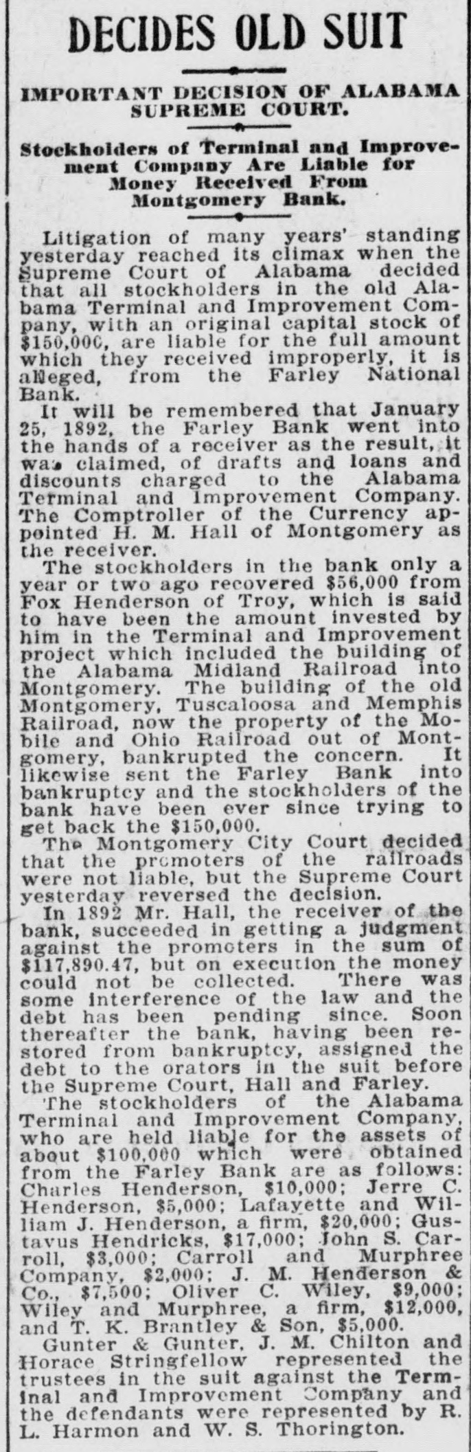 DECIDES OLD SUIT IMPORTANT DECISION OF ALABAMA SUPREME COURT. Stockholders of Terminal and Improvement Company Are Liable for Money Received From Montgomery Bank. Litigation of many years' standing yesterday reached its climax when the Supreme Court of Alabama decided that all stockholders in the old Alabama Terminal and Improvement Company, with an original capital stock of $150,000, are liable for the full amount which they received improperly, it is alleged, from the Farley National Bank. It will be remembered that January 25, 1892, the Farley Bank went into the hands of a receiver as the result, it was claimed, of drafts and loans and discounts charged to the Alabama Terminal and Improvement Company. The Comptroller of the Currency appointed H. M. Hall of Montgomery as the receiver. The stockholders in the bank only a year or two ago recovered $56,000 from Fox Henderson of Troy, which is said to have been the amount invested by him in the Terminal and Improvement project which included the building of the Alabama Midland Railroad into Montgomery. The building of the old Montgomery, Tuscaloosa and Memphis Railroad, now the property of the Mobile and Ohio Railroad out of MontIt gomery, bankrupted the concern. likewise sent the Farley Bank into bankruptcy and the stockholders of the bank have been ever since trying to get back the $150,000. The Montgomery City Court decided that the promoters of the railroads were not liable, but the Supreme Court yesterday reversed the decision. In 1892 Mr. Hall, the receiver of the bank, succeeded in getting a judgment against the promoters in the sum of $117,890.47, but on execution the money could not be collected. There was some interference of the law and the debt has been pending since. Soon thereafter the bank, having been restored from bankruptcy, assigned the debt to the orators in the suit before the Supreme Court, Hall and Farley. The stockholders of the Alabama Terminal and Improvement Company, who are held liable for the assets of about $100,000 which were obtained from the Farley Bank are as follows: Charles Henderson, $10,000; Jerre C. Henderson, $5,000; Lafayette and William J. Henderson, a firm, $20,000; Gustavus Hendricks, $17,000; John S. Carroll, $3,000; Carroll and Murphree Company, $2,000; J. M. Henderson & Co., $7,500; Oliver C. Wiley, $9,000; Wiley and Murphree, a firm, $12,000, and T. K. Brantley & Son, $5,000. Gunter & Gunter, J. M. Chilton and Horace Stringfellow represented the trustees in the suit against the Terminal and Improvement Company and the defendants were represented by R. L. Harmon and W. S. Thorington.