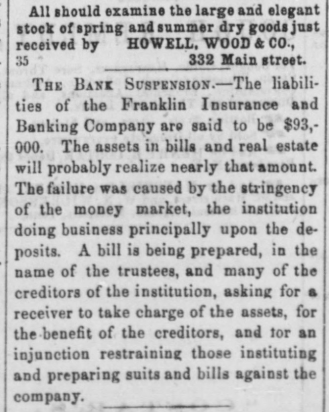 The liabilities of the Franklin Insurance and Banking Company are said to be $93,000. The assets in bills and real estate will probably realize nearly that amount. The failure was caused by the stringency of the money market, the institution doing business principally upon the deposits. A bill is being prepared, in the name of the trustees, and many of the creditors of the institution, asking for a receiver to take charge of the assets, for the benefit of the creditors, and for an injunction restraining those instituting and preparing suits and bills against the company.