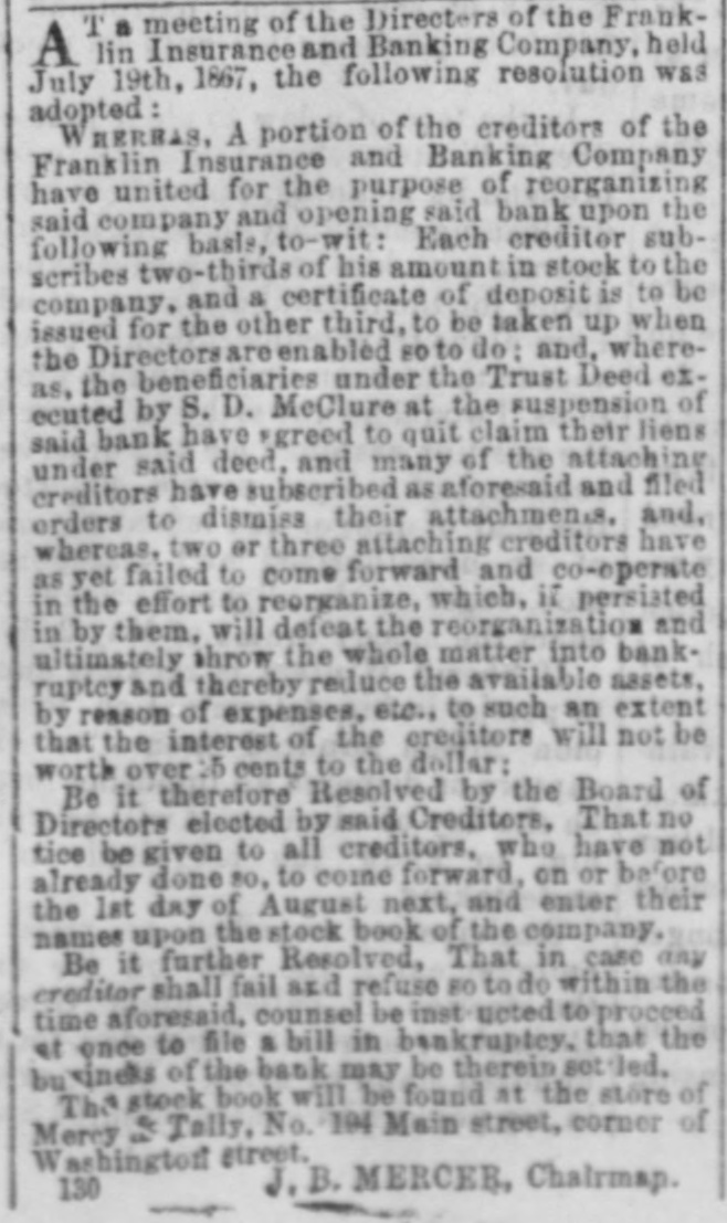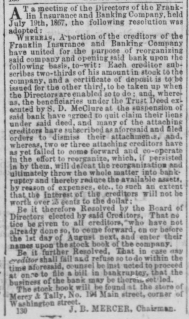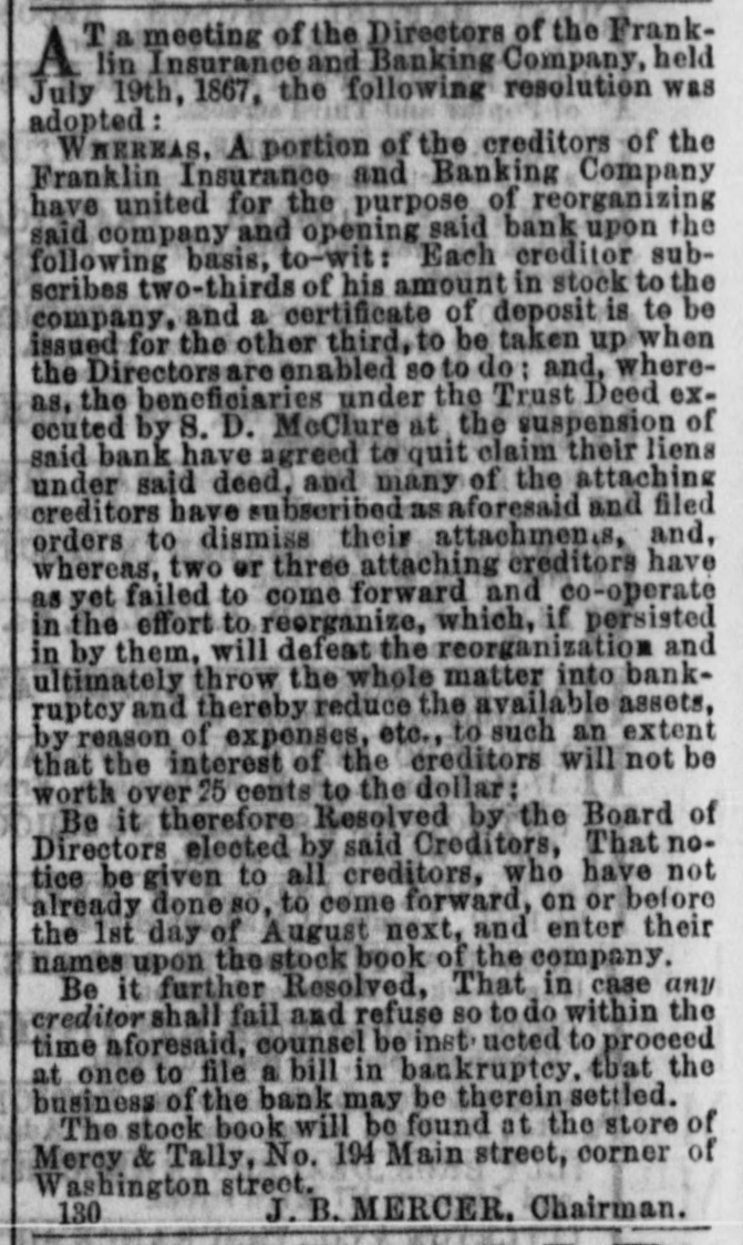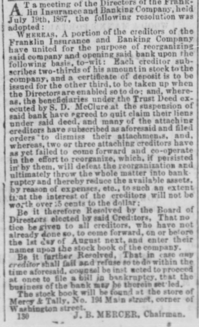 T a meeting of the Directors of the FrankA lin Insurance and Banking Company, held July 19th, 1867, the following resolution was adopted: WHEREAS, A portion of the creditors of the Franklin Insurance and Banking Company have united for the purpose of reorganizing said company and opening said bank upon the following basis. to-wit: Each creditor subscribes two-thirds of his amount in stock to the company, and a certificate of deposit is to be issued for the other third. to be taken up when the Directors are enabled so to do: and, whereas. the beneficiaries under the Trust Deed executed by S. D. McClure at the suspension of said bank have agreed to quit claim their liens under said deed, and many of the attaching creditors have subscribed as aforesaid and filed orders to dismiss their attachments and, whereas, two or three attaching creditors have as yet failed to come forward and co-operate in the effort to reorganize, which, if persisted in by them, will defeat the reorganization and ultimately throw the whole matter into bank ruptcy and thereby reduce the available assets, by reason of expenses, etc., to such an extent that the interest of the creditors will not be worth over 15 cents to the dollar: Be it therefore Resolved by the Board of Directors elected by said Creditors, That no tice be given to all creditors, who have not already done 80, to come forward, on or before the 1st day of August next, and enter their names upon the stock book of the company. Be it further Resolved, That in case any creditor shall fail and refuse so to do within the time aforesaid. counsel be inst noted to proceed at once to file a bill in bankruptcy, that the business of the back may be therein settled. The stock book will be found at the store of Mercy & Tally, No. 194 Main street, corner of Washington street, J.B. MERCER, Chairman. 130