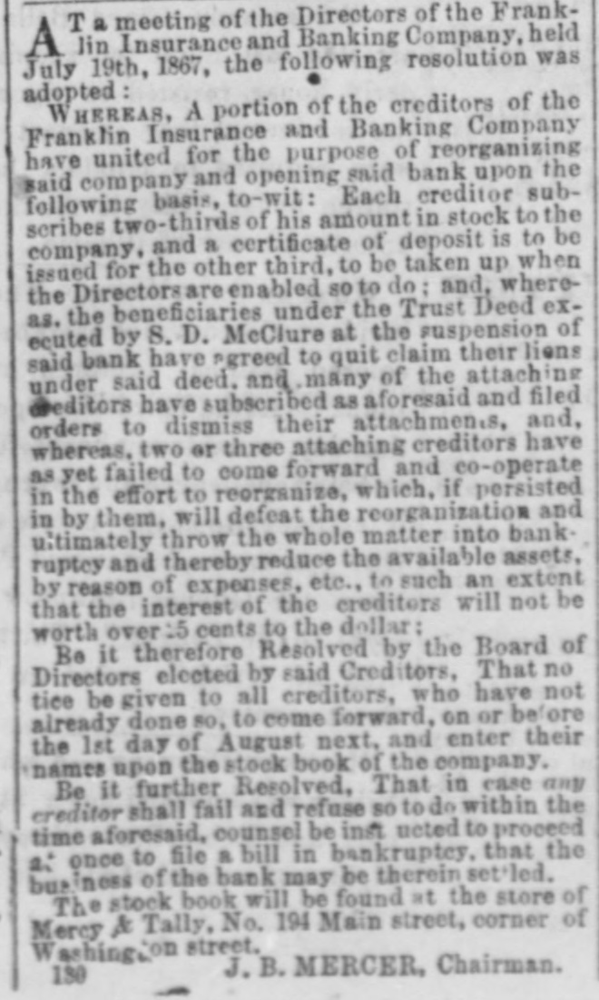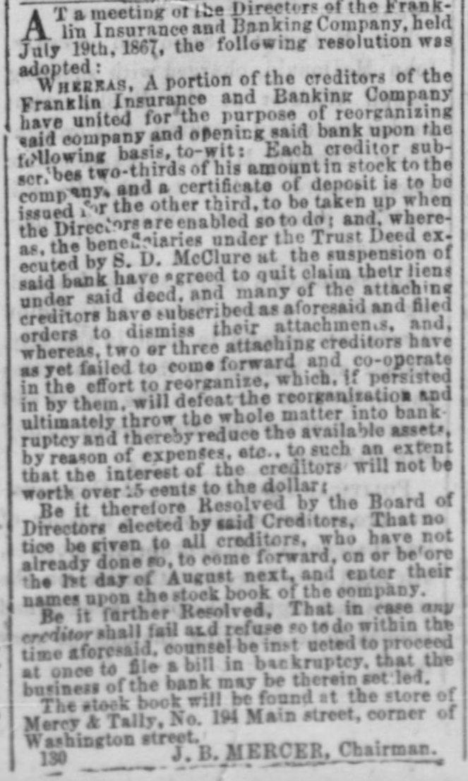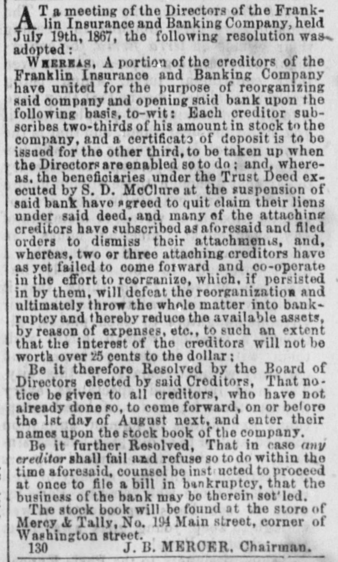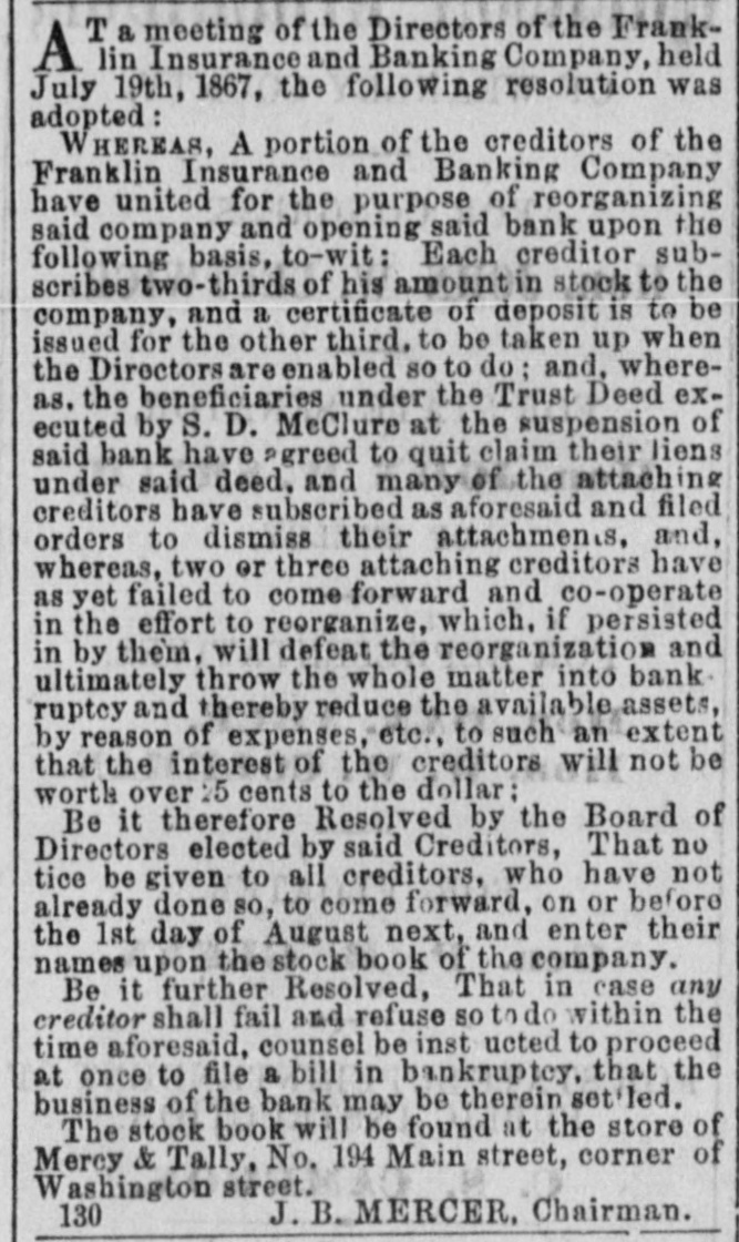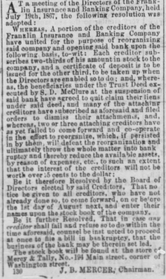 T a meeting of the Directors of the FrankA lin Insurance and Banking Company, held July 19th, 1867, the following resolution was adopted: WHEREAS, A portion of the creditors of the Franklin Insurance and Banking Company have united for the purpose of reorganizing said company and opening said bank upon the following basis. to-wit: Each creditor subscribes two-thirds of his amount in stock to the company, and a certificate of deposit is to be issued for the other third. to be taken up when the Directors are enabled so to do: and, whereas. the beneficiaries under the Trust Deed executed by S. D. McClure at the suspension of said bank have agreed to quit claim their liens under said deed, and many of the attaching creditors have subscribed as aforesaid and filed orders to dismiss their attachments and, whereas, two or three attaching creditors have as yet failed to come forward and co-operate in the effort to reorganize, which, if persisted in by them, will defeat the reorganization and ultimately throw the whole matter into bank ruptcy and thereby reduce the available assets, by reason of expenses, etc., to such an extent that the interest of the creditors will not be worth over 15 cents to the dollar: Be it therefore Resolved by the Board of Directors elected by said Creditors, That no tice be given to all creditors, who have not already done 80, to come forward, on or before the 1st day of August next, and enter their names upon the stock book of the company. Be it further Resolved, That in case any creditor shall fail and refuse so to do within the time aforesaid. counsel be inst noted to proceed at once to file a bill in bankruptcy, that the business of the back may be therein settled. The stock book will be found at the store of Mercy & Tally, No. 194 Main street, corner of Washington street, J.B. MERCER, Chairman. 130