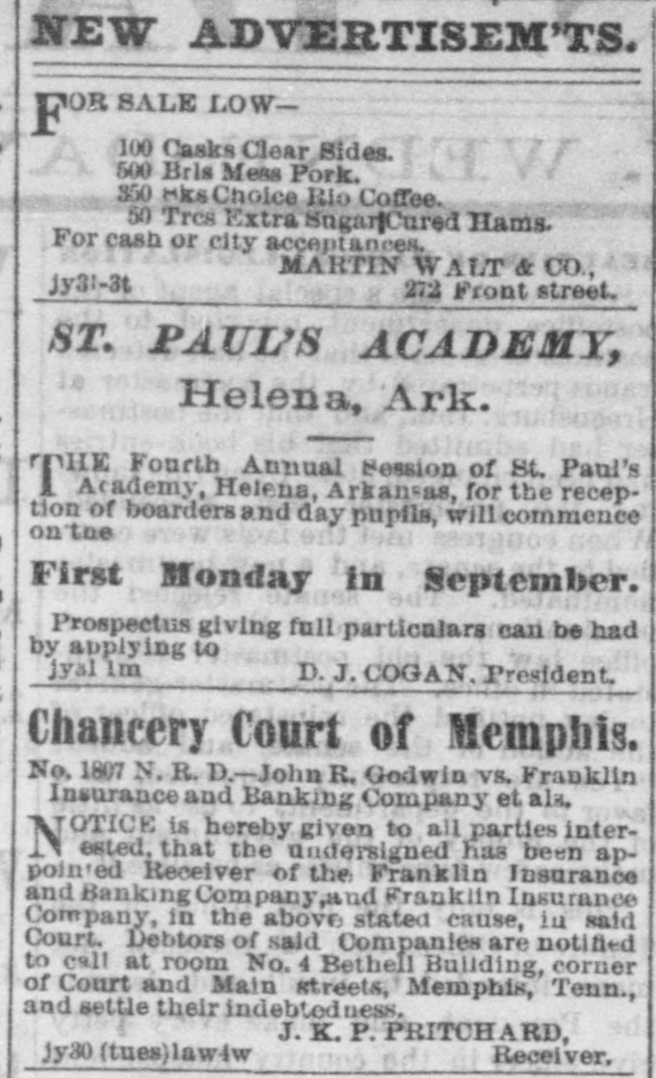 NEW ADVERTISEM'TS. OR SALE LOWF 100 Casks Clear Sides. W 500 Bris Mess Pork. 350 Mks Choice Rio Coffee. 50 Tres Extra Sugar|Cured Hams. For cash or city acceptances. MARTIN WALT & CO., jy31-3t 272 Front street. ST. PAUL'S ACADEMY, Helena, Ark. THE Fourth Annual Session of St. Paul's T'academy, Helena, Arkansas, for the reception of boarders and day pupils, will commence on the First Monday in September. Prospectus giving full particulars can be had by applying to jyal Im D. J. COGAN. President. Chancery Court of Memphis. No. 1807 N. R. D.-John R. Godwin VS. Franklin Insurance and Banking Company et als. OTICE is hereby given to all parties interN ested, that the undersigned has been appointed Receiver of the Franklin Insurance and Banking Company,and Franklin Insurance Company, in the above stated cause, in said Court. Debtors of said Companies are notified to call at room No. 4 Bethell Building, corner of Court and Main streets, Memphis, Tenn., and settle their indebtedness. J. K. P. PRITCHARD, jy30 (tues)law4w Receiver,