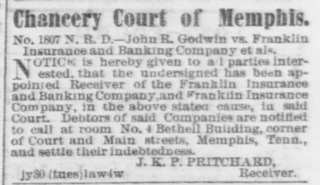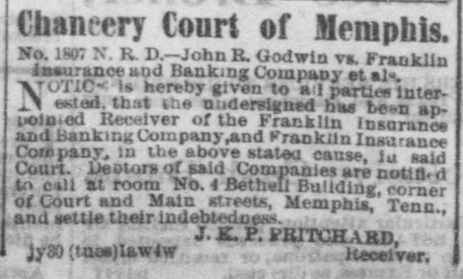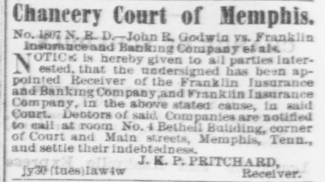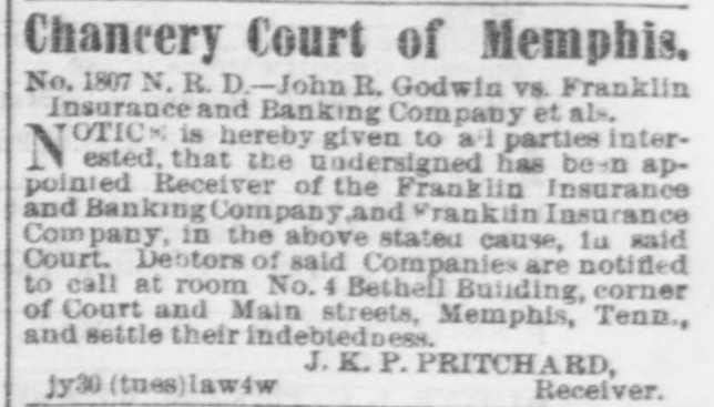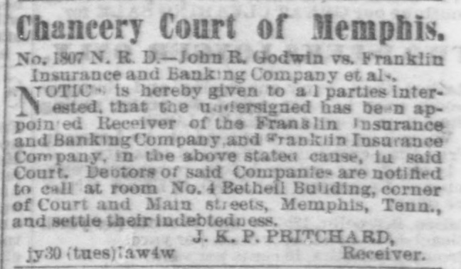 Chancery Court of Memphis. No. 1807 N. R. D.-John R. Godwin vs. Franklin Insurance and Banking Company et als. OTIC is hereby givea to a 1 parties interN ested, that the undersigned has been appointed Receiver of the Franklin Insurance and Bauking Company,and Franklin Insurance Company, in the above stated cause, la said Court, Debtors of said Companies are notified to call at room No. 4 Betheil Building, corner of Court and Main streets, Memphis, Tenny and settle their indebtedness. J. K. P. PRITCHARD, Receiver. jy30 (tues)lawsw