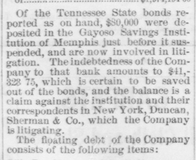 Of the Tennessee State bonds reported as on hand, $80,000 were deposited in the Gayoso Savings Institution of Memphis just before it suspended, and are now involved in litigation. The indebtedness of the Company to that bank amounts to $41,328 75, which is certain to be saved out of the bonds, and the balance is a claim against the institution and their correspondents in New York, Duncan, Sherman & Co., which the Company is litigating. The floating debt of the Company consists of the following items: