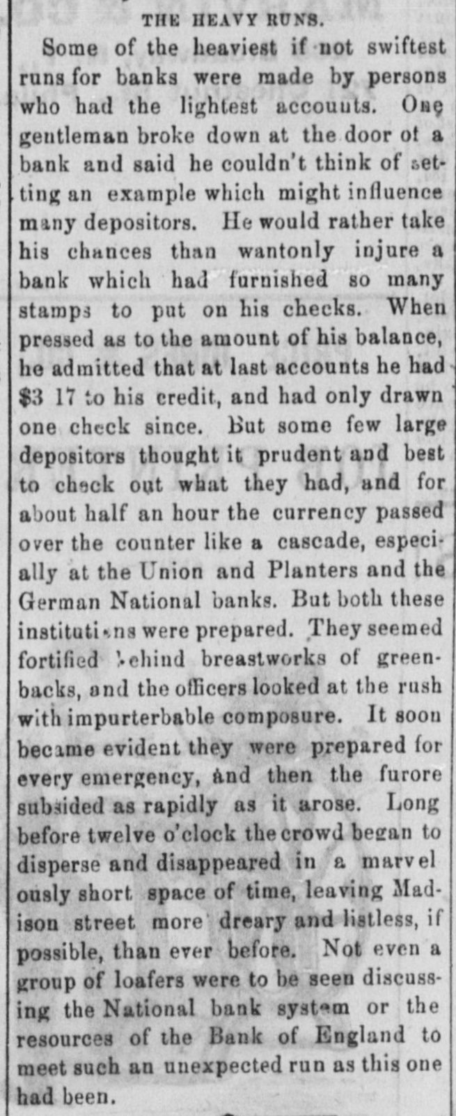 trade and capital that we could not but share her troubles, yet it by our bankens, who a month ago prepared for the dreaded emergency, were 80 well "fixed" as to be to they puil through, and be ready for colonseason, only postponed OD account the of the prevalence of the fever. But fever itself proved their stumbling-block When fifteen or twenty thousand people rush panie-stricken from home, pell-meil, helter-skelter, they are usually possessed of but two ideas, "money" and "safety." The first, being necessary to the continuance of the ter. becomes the essential. Our frighteaed thousands conscious of this, and with a view to fortifying themselves against any contingency, lined before their departure their pockets, and it is calculated tock with them not less than one million dollars. So large a sum as this could not be taken from Memphis without, especially at 80 critical a juncture, dangering not only the stability of our banks,but with them many of largest concerns. The knowledge of the withdrawal of so large an amount had its effect, and as the news from New York spread from day to day, feeling of in security grew, which, fed by the panicky state of the public mind in regard to the fever, at last culminated in run on Wednesday upon the First national bank, one of the best conducted and most liberal institutions in the Union. This was sustained to the extent of paying cut sixty thousand dollare, but, on opening the doors yesterday and finding the run .still likely to continue, they were closed again and suspension announce by bulletin. This was the signal for an excitement without parallel bein the history of Memphis. Men came frantie, and flew, first to the Defoto, which soon followed the example of the First national, then to the German, and next to the Planters and Union bank The latter two passed the or deal of fire triumphantly, and stand stronger than ever in the esteem of the public. With the German nation- short the run was of but duration. al The depositors SOOL returned to reason, and the result was restorawithtion of nearly all the accounts drawn. Not 80 with the Union and Planters. Her depositors were determined to know by practical test how thing" worked, and clamored for their money until one hundred and sixty thousand dollars was paid out. This was done as promptly as the nimble fingers of Mr. Omberg, the payingteller, could count the money, and was accomplished by one o'clock, when there remained but one anxious deposi- Men tor. Confidence was restored. had recovered their reason, and the result was that before the close of day seventy thousand dolla. of deposits of were entered to the credit of panicky depositors of the morning. Reid, in the trying emergency, had sustaining helpo Mr. Greenlaw (a host in himself and other directors, the presence of whom no doubt contributed much cur's the panic. And thus ended the most exciting day in our commercial annals. While we deeply lament, as what right-thinking man will not, the suspension of two banks hitherto regarded among our staunchest, we are thankful that the storm has swept over and done no more damage. To-day expect to see the money pouring into the vaults of our banks again, and Unbusiness essame its proper course. der no circumstances can we suffer long from the terrible disaster which is racking the strength of the north. Poor, we have but few debts, and staple products being in demand ever the globe, we will not be troubled about realizing on it; and since calculate our harvest has already begun we can an abundance of money within very short time. Therefore, continuance of the panie here is wholly with- trust ground, and we out our good people will not paralize business by temporarily withdrawing and hoarding money needed for the purposes of commerce meand trade. "Without the circulating dium and without confidence, business must cease, and with it go the bread It of thousands dependent on work alone. is, therefore, manifestly the part of wisdom for the people to stand by the banks and sus tain them by their deposits rather eripple them by their withdrawal. sides, the banks fully prepared for worst, and will pay, if necessary, every cent due their depositors. There is, therefore, no use, indeed, it would amount most to criminality to attempt to continue panie which can only result direst disasters every branch of trade. We have suffered and are suffering enough, God knows. Do not let to our burdens causeless and fruit inless run upon the banking stitutions that remain to us, and which have proven their title to our highest confidence by the promptnets with which they responded to all mands upon them yesterday. To the stockholders and depositors of officers, First national and the Dethe banks we extend again Soto The first has been indeed "first" regrets. ever since its establishment in every good work. It has done an unamount of good in Memphis, told officers have, as they deserve, its and heartfelt sympathy of deep community. To Mr. Elder and-his brothers of the DeSoto there will come, too, large measure of regret, such deserves after a long and useful be life, most of it spent in the city which from he has known in all its stages hamlet up. Both the suspended banks, instructions from the together with the Freedmen's Savings